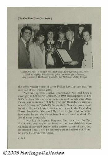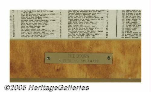 <B>Doors Billboard Award.</B></I> Presented to the band when their single "Light My Fire" hit #1 on the Billboard charts on the week ending July 29, 1967. It was this single that not only propelled the Doors onto the charts, but also into the collective consciousness of rock and roll listeners, and, in one infamous incident, highlighted their first -- and last -- appearance on the "Ed Sullivan Show."