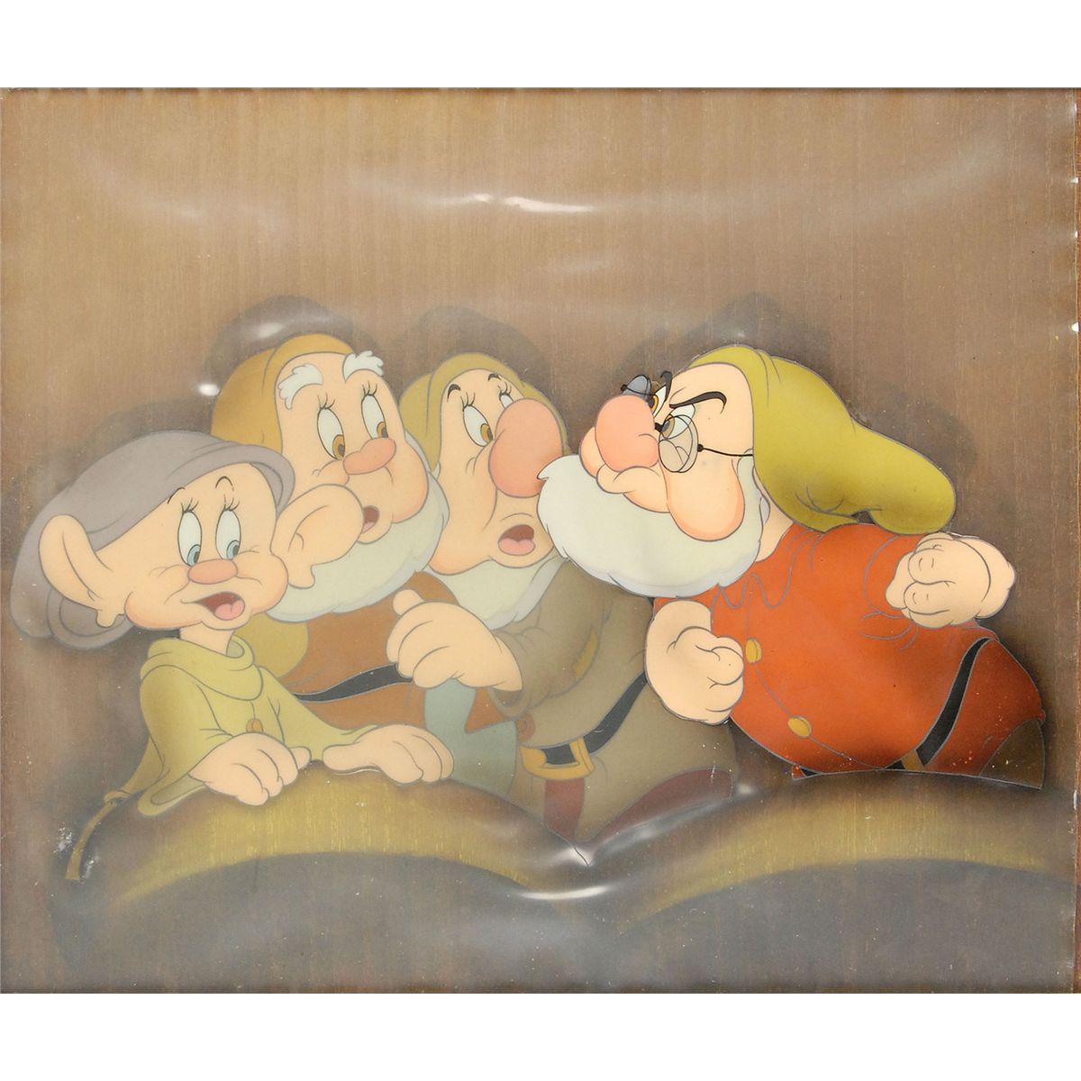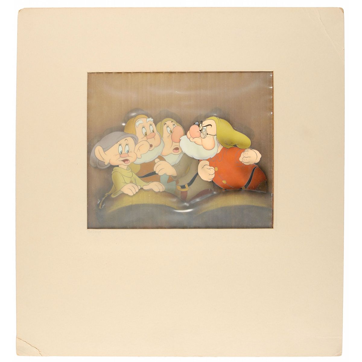 (Walt Disney Studios, 1937) Original production cel featuring Dopey, Doc, Happy, and Sneezy from Snow White and the Seven Dwarfs. The cels, one featuring Doc and the other featuring Dopey, Happy, and Sneezy, have been applied to a woodgrain airbrushed background as prepared by the Disney Studio to be sold at the Courvoisier Galleries. Image of all four dwarfs measures 8.75 x 4.5, with a mat opening of 9 x 7.5. Mat dimensions are 16 x 17. The piece has the original Disney Courvoisier Galleries label on the reverse. In fine condition, with slight rippling to celluloid. A nice setup of several dwarfs together, all with great expressions on their faces.