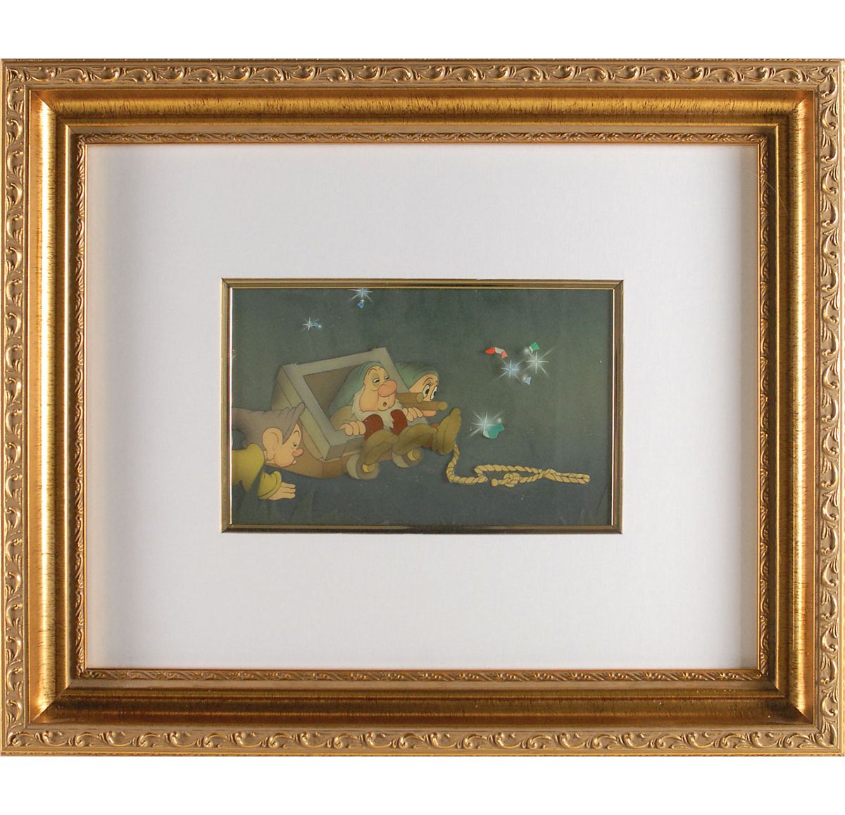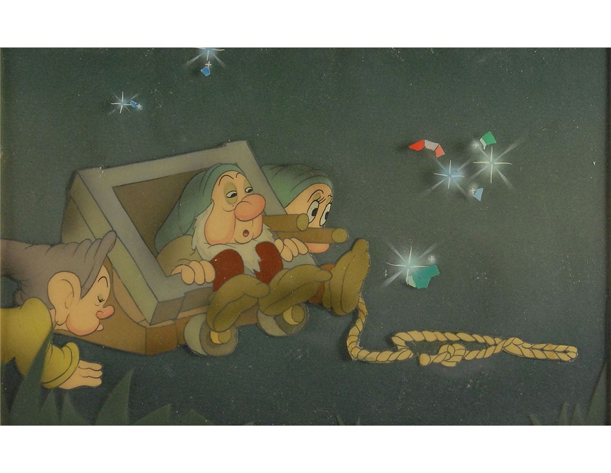 (Walt Disney Studios, 1937) Original production cel and production background featuring Dopey, Sleepy, and Bashful from Snow White and the Seven Dwarfs, showing the three dwarfs with a mine cart, peering out at some gems that were added as an embellishment. The cel has been trimmed to image and applied to an airbrushed production background as prepared by Courvoisier Galleries for sale. Image measures 7.25 x 3, with a mat opening of 7.75 x 4.75. This piece is also framed to an overall size of 17 x 14. In fine condition. A very appealing Courvoisier setup.