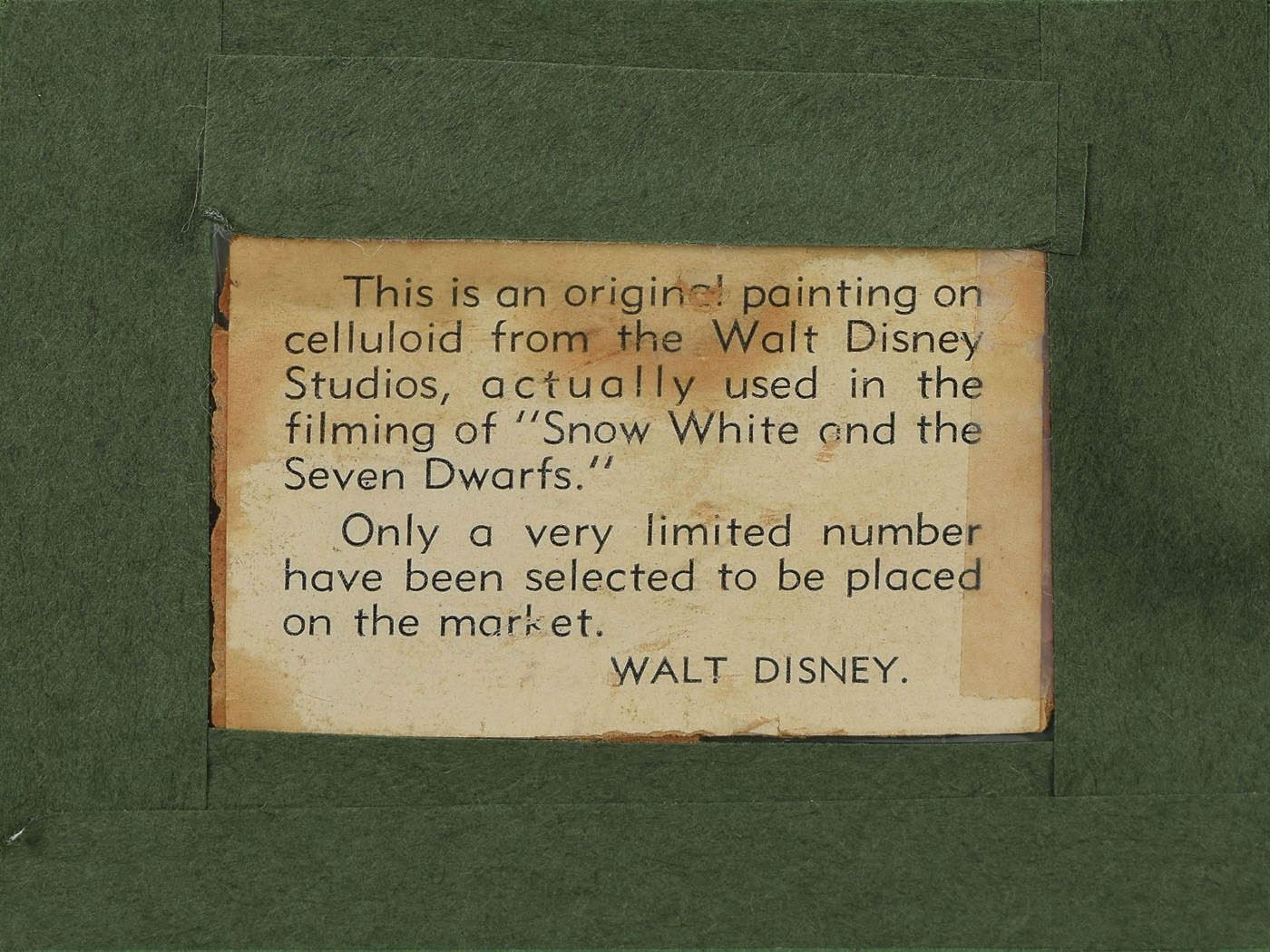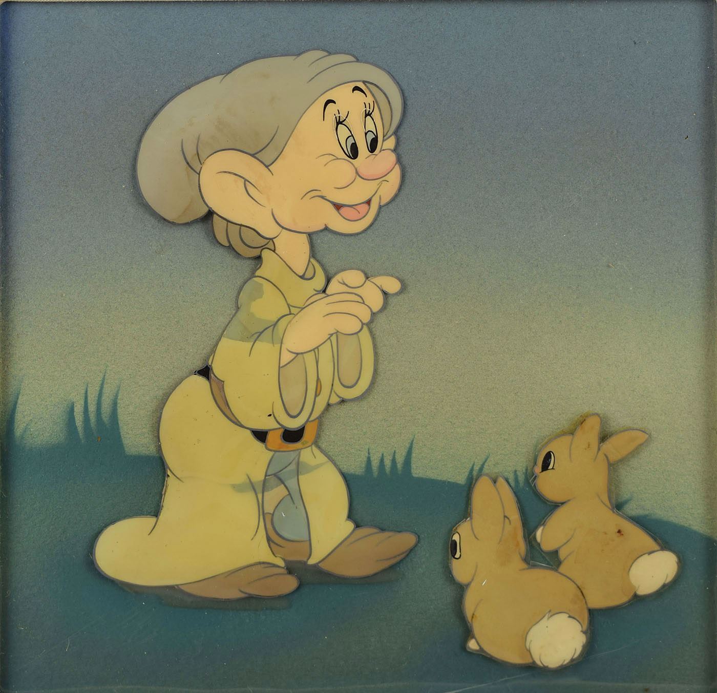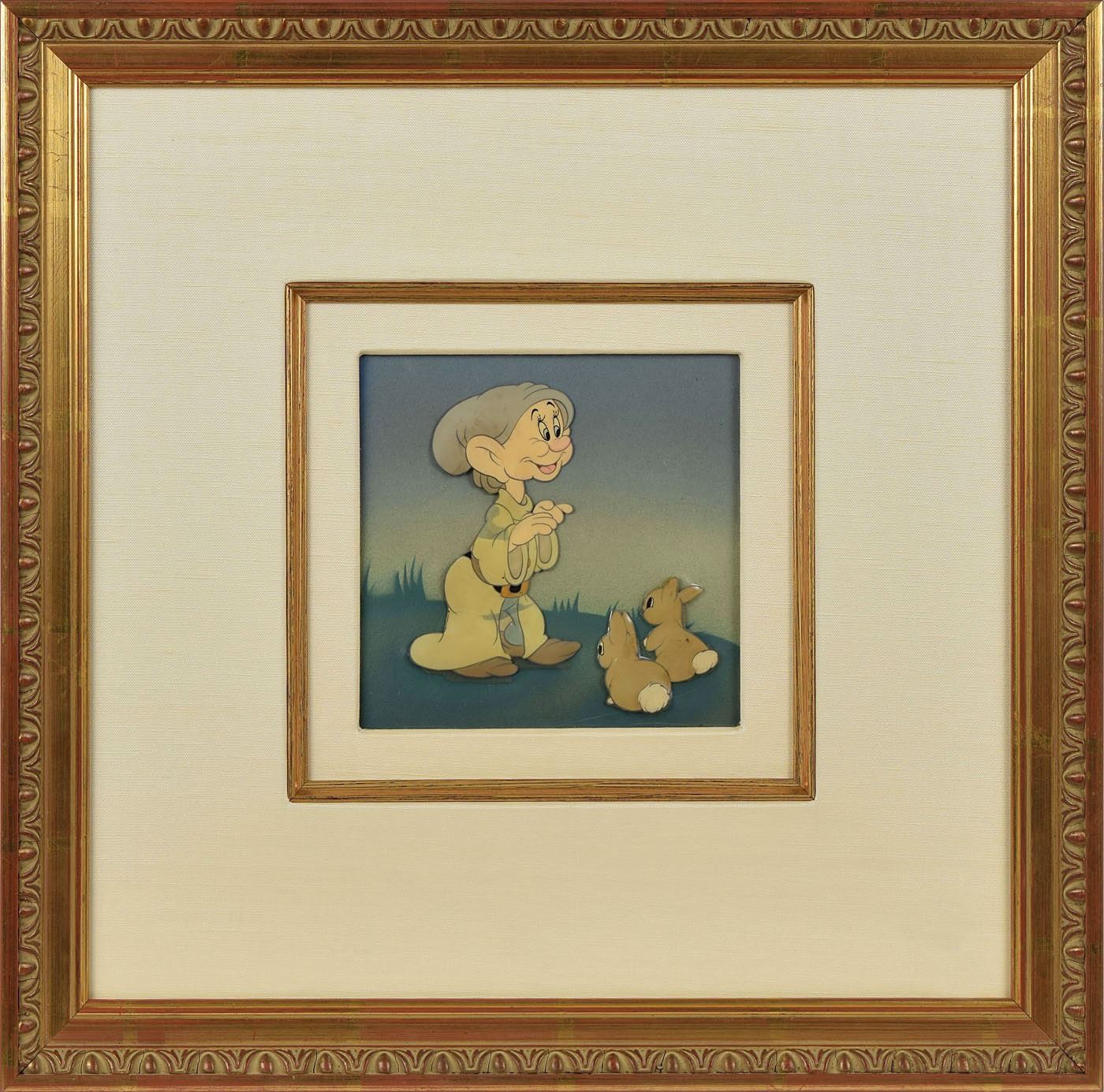 (Walt Disney Studios, 1937) Original production cels of Dopey and two bunnies from Snow White and the Seven Dwarfs, depicting the youngest dwarf standing in front of two inquisitive rabbits. The cel has been trimmed and applied to a hand-painted background as prepared by Courvoisier Galleries for sale. Images measure 2.5 x 4.25 (Dopey) and 1.75 x 2 (bunnies), with a mat opening of 5.25 x 5.25. Archivally cloth-matted and framed to an overall size of 15.5 x 15.25. The piece has the original Disney label on the reverse. In fine condition, with cracking and lifting to sections of Dopey's robe.