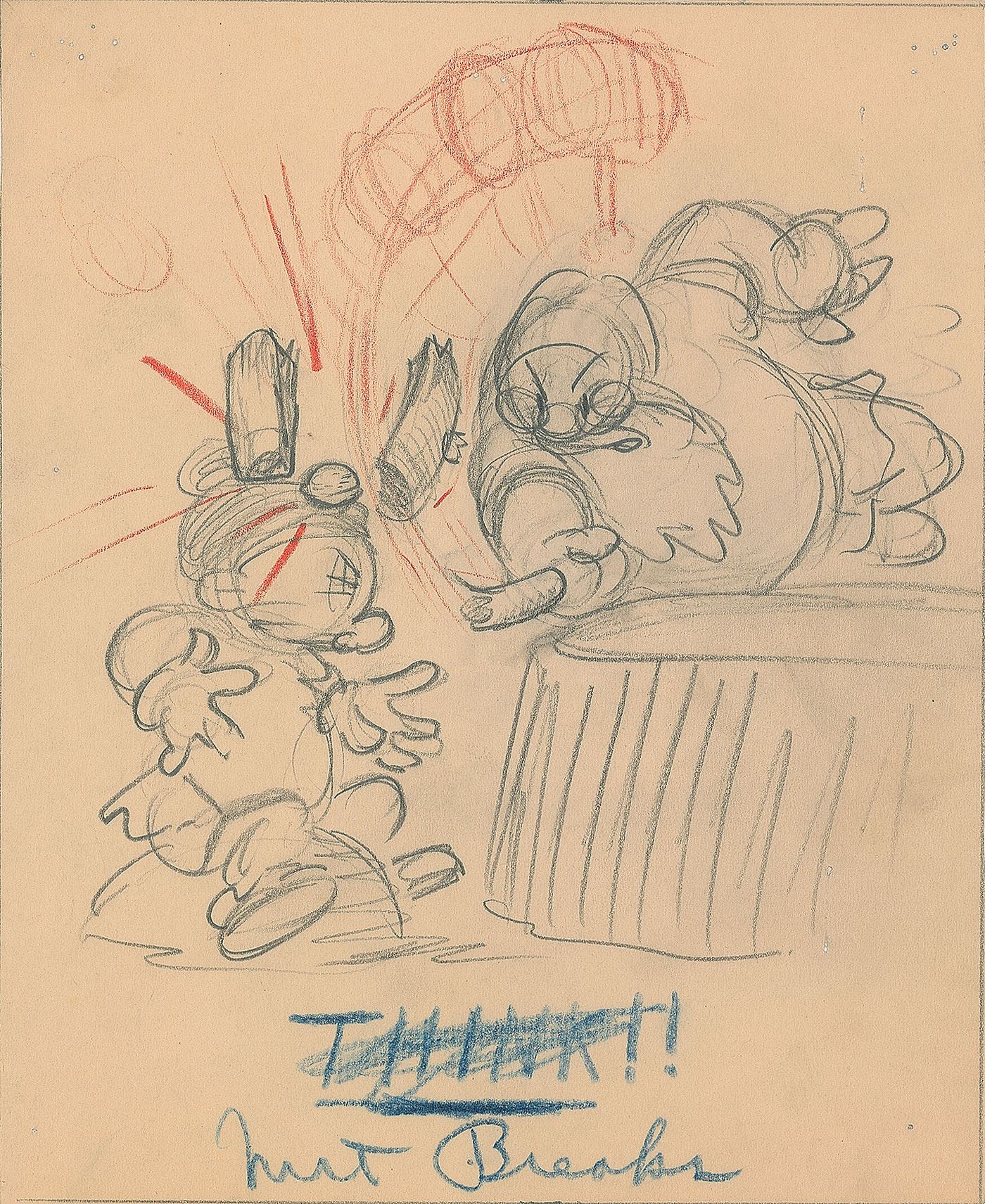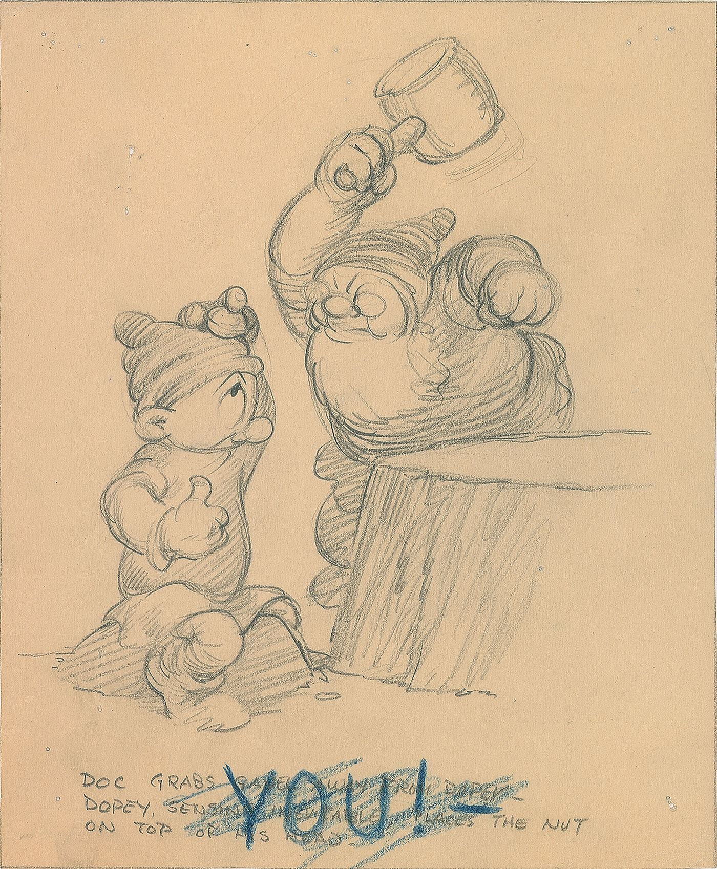 (Walt Disney Studios, circa 1935) Two very early original concept production storyboard panels featuring Dopey and Doc from Snow White and the Seven Dwarfs, showing Doc smashing a mallet over Dopey's head in an attempt to crack a walnut. Accomplished in graphite and colored pencil on two trimmed sheets of 5.75 x 7 animation paper. Each image measures about 4.75 x 5.5. In overall fine condition. A great gag ensemble featuring two classic characters.