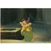 (Walt Disney Studios, 1937) Fantastic original production cel and master production background featuring Dopey from Snow White and the Seven Dwarfs, depicting the youngest of the dwarfs blowing on his finger in an attempt to rid water from his large ears, a classic comedic moment from the film's memorable washing sequence. The cel has been trimmed and applied to a hand-painted master production background. Image measures 6 x 5.25, with a mat opening of 11.5 x 7.75. This piece is also framed to an overall size of 16.25 x 12.75. In fine condition. A wonderful production setup with great action and comedic effect.