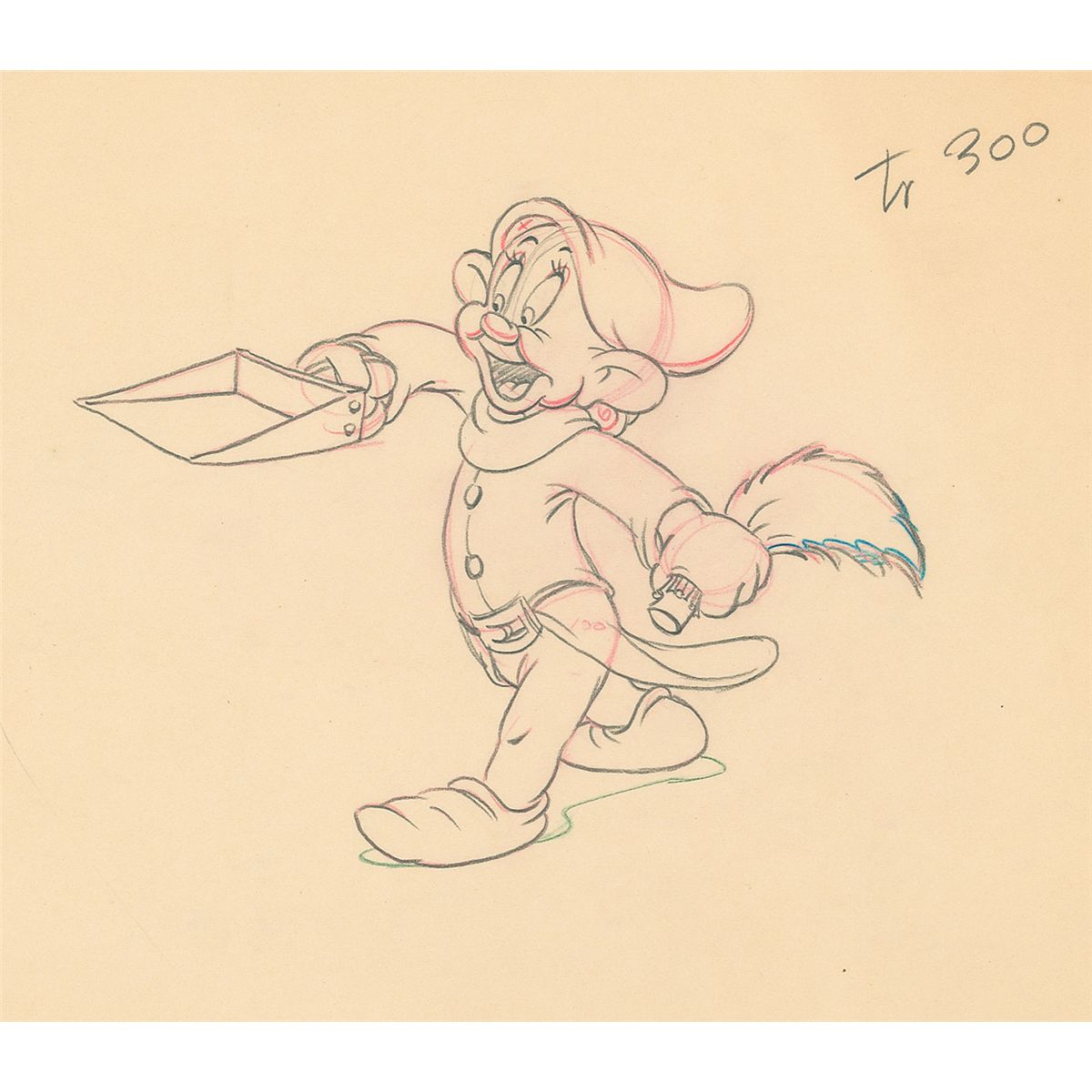 (Walt Disney Studios, 1943) Original production drawing featuring Dopey from The Winged Scourge, showing him cheerily walking along with a dustpan and small broom. Accomplished in graphite and colored pencil on untrimmed 12 x 10 animation paper. Image measures 6.5 x 5. In fine condition. The Winged Scourge, animated by Fred Moore, was the first of a series of health-related educational shorts produced by the Disney studios for showing in Latin America.