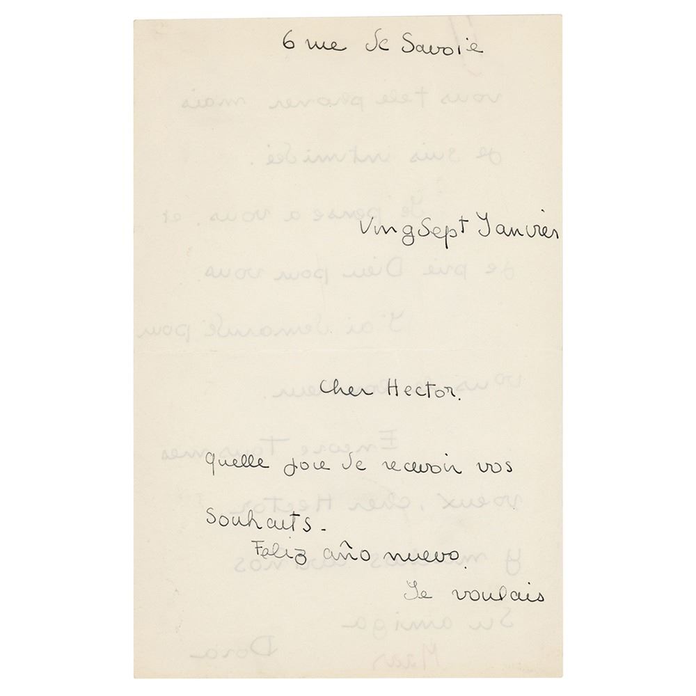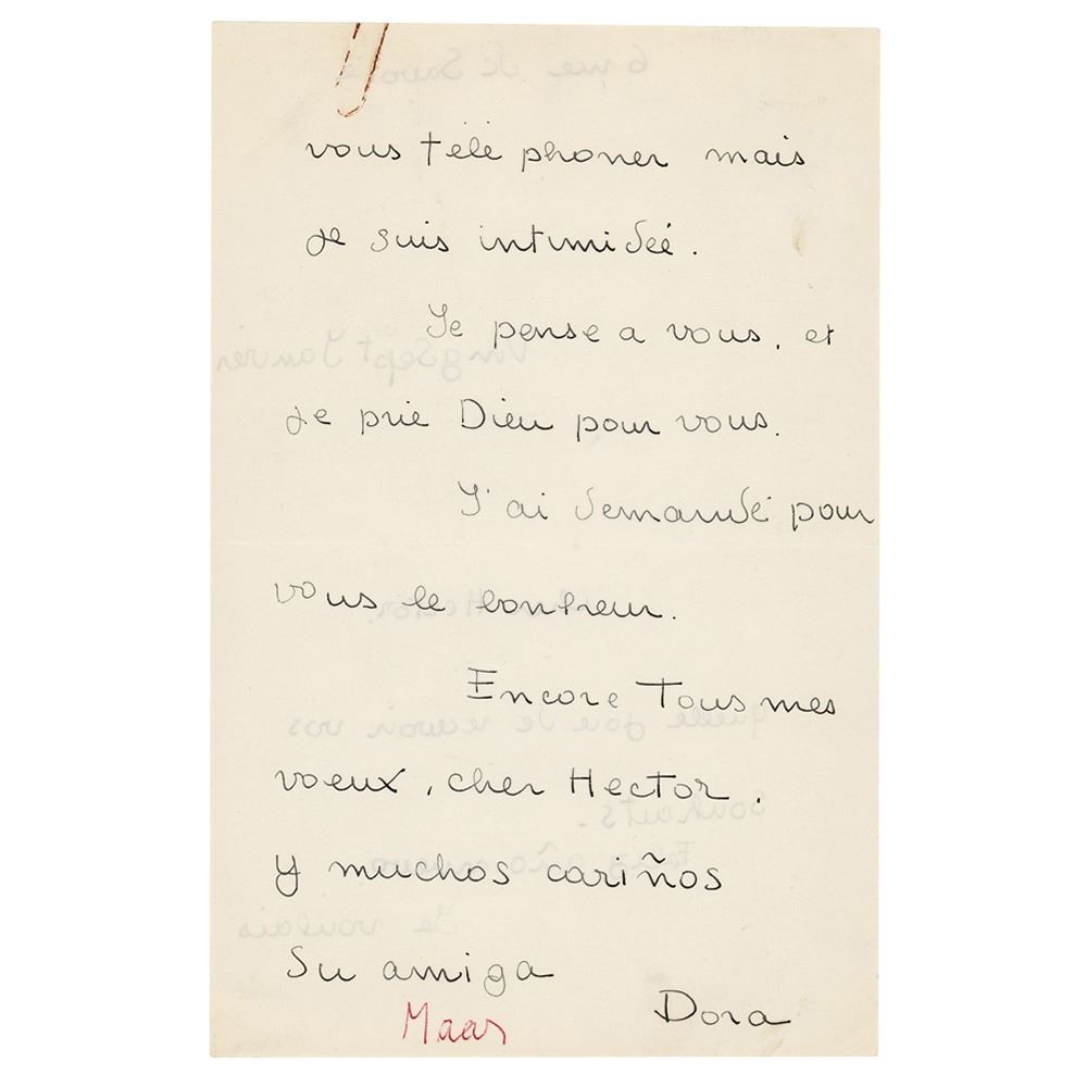 ALS in French, signed “Dora,†one page, 5.25 x 8.25, January 27, [1960]. Handwritten letter to "Hector," in part (translated): "What a joy to receive your wishes. Happy new year. I wanted to call you but I'm intimidated. I think of you and I pray to God for you." In fine condition, with a rusty paperclip impression at the top and her surname annotated in ink in another hand at the bottom of the page.