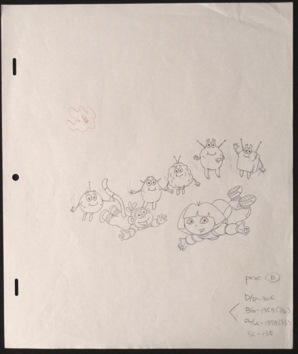 This unusual scene portrays Dora and Boots floating along with a bunch of strange outer space creatures that look like fruits and a piece of toast. Medium: Black, red, and non-photo blue pencil on white paper, with animator notations; the bottom of each sheet has peg holesSize: 10 1/2 x 12 1/2 inchesCertificate of Authenticity includedCondition: Excellent This is a fantastic original Dora drawing of most interesting scene!
