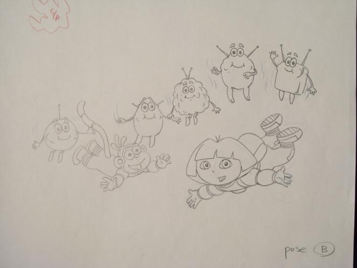 This unusual scene portrays Dora and Boots floating along with a bunch of strange outer space creatures that look like fruits and a piece of toast. Medium: Black, red, and non-photo blue pencil on white paper, with animator notations; the bottom of each sheet has peg holesSize: 10 1/2 x 12 1/2 inchesCertificate of Authenticity includedCondition: Excellent This is a fantastic original Dora drawing of most interesting scene!
