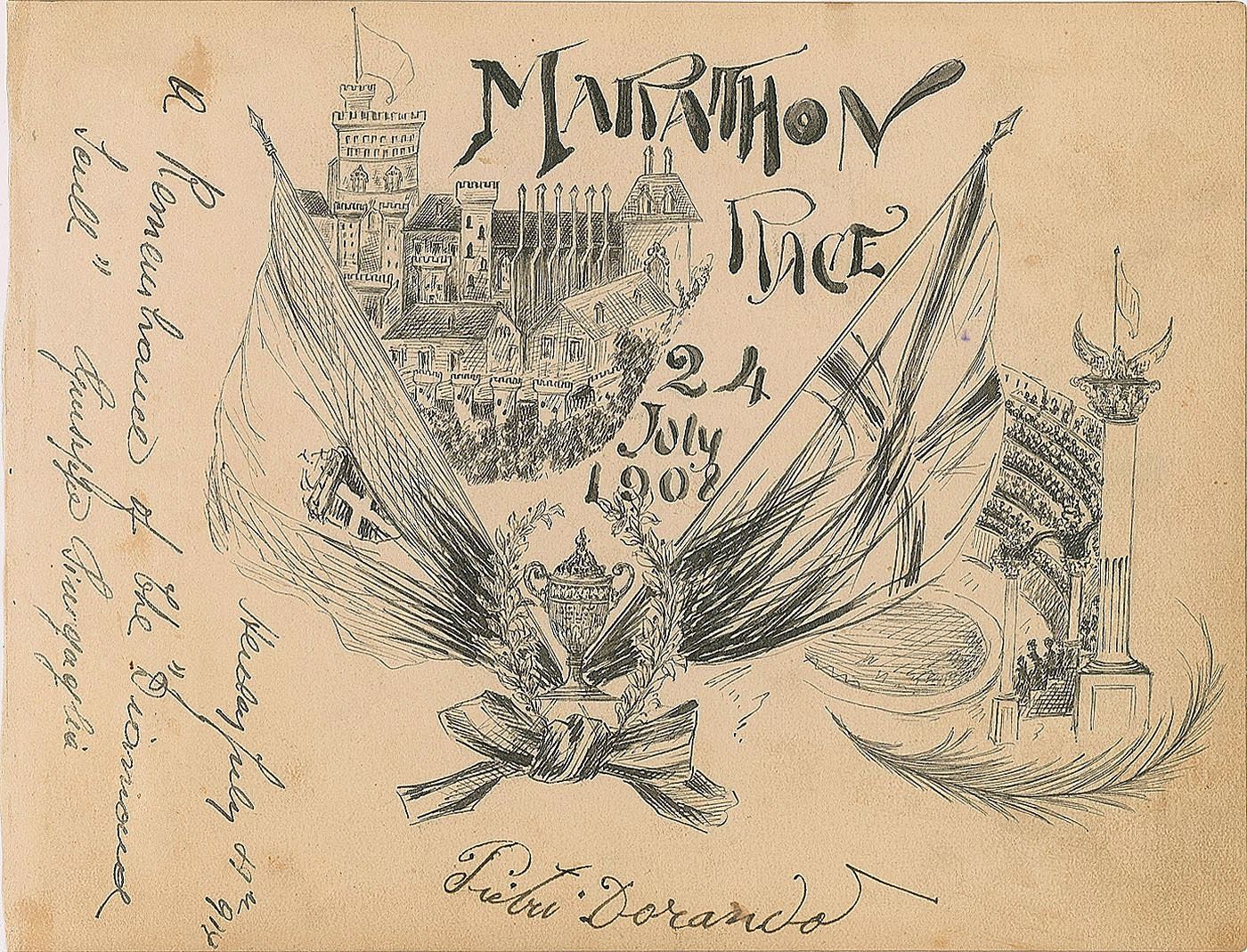 Desirable ink signature, "Pietri Dorando,” on an off-white 7.5 x 5.75 album page bearing an original elaborate artist's sketch commemorating the "Marathon Race" held at the London Olympics on July 24, 1908, in which Pietri was disqualified after finishing first. Also signed vertically in the left margin by Italian rower Giuseppe Sinigaglia, "A remembrance of the 'Diamond Scull,' Giuseppe Sinigaglia." In very good to fine condition, with light toning and soiling.