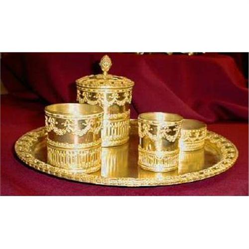 A handsome desk accessory for office or home. A tray with one covered container and three open containers in diminishing sizes. Each has a small garland swag applied to the sides and top, as well as the tray rim. A perfect answer to catch your desk's clutter of pens, paperclips, rubber bands, etc. - even enough room to hold your coffee cup! Shipping/insurance are the responsibility of the purchaser.