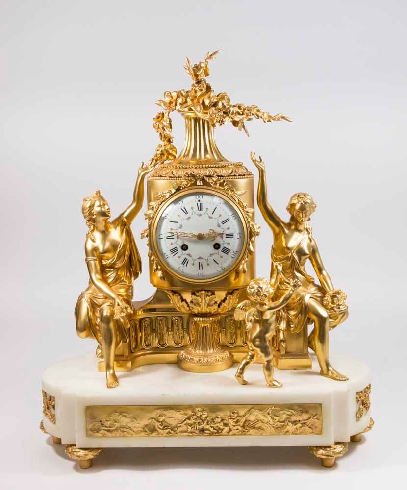 Clock flanked by female figures and putti. With marble base. Approx. 23" H x 19" W.