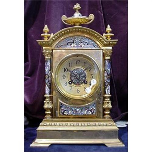 This fine French clock features delicate champleve work, even on the face of the dial. It features columns of champleve topped with ornate finials with a larger finial on top of the clock. It strikes on a coil on the hour and half hour. Size is 15"x9"x6".