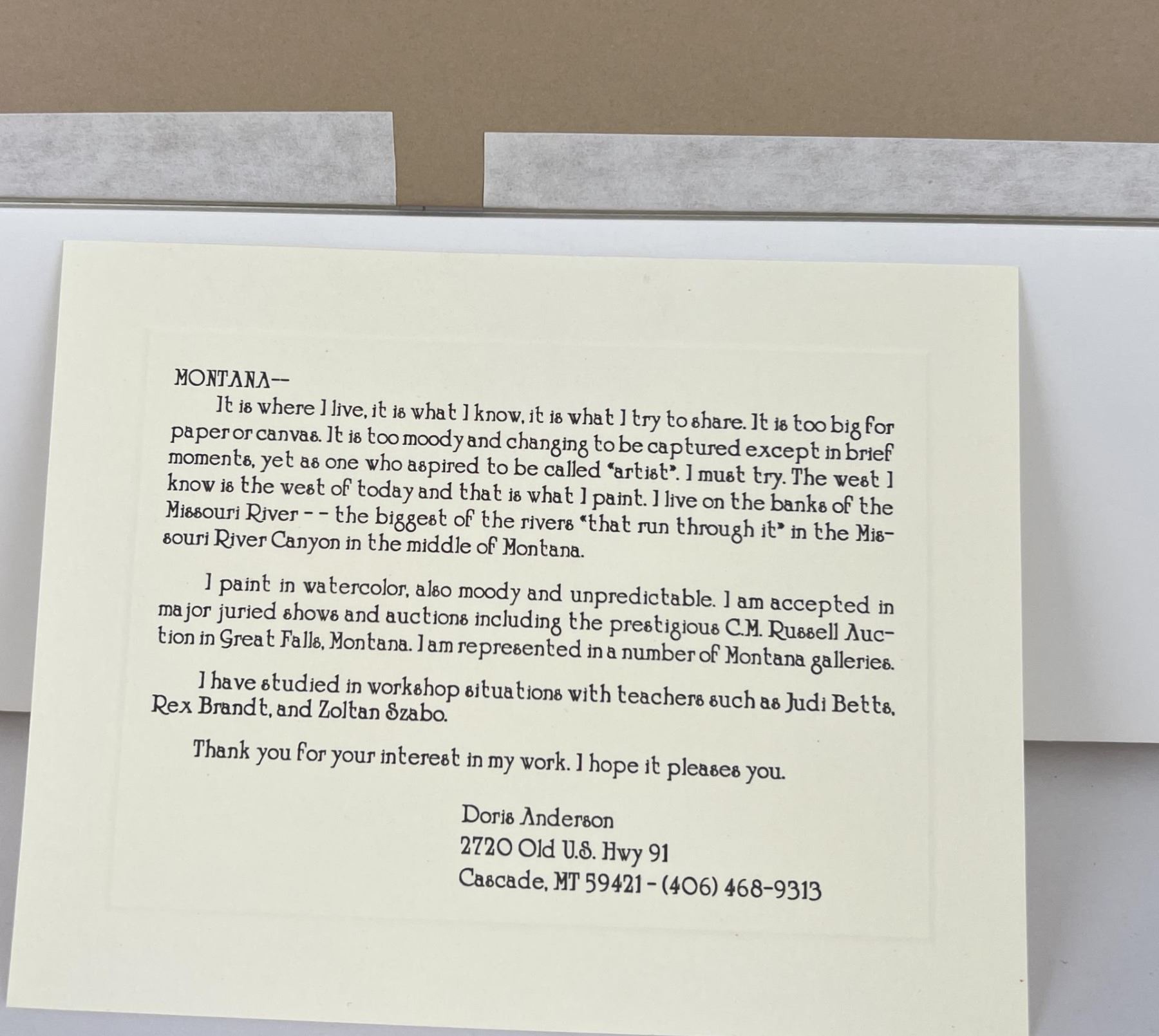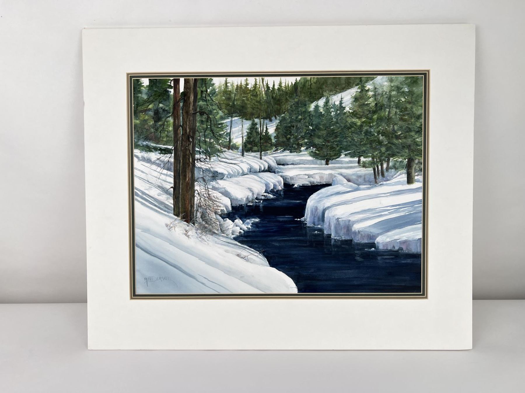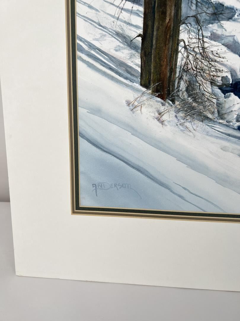 21 1/2" by 25 3/4" in matte. Doris Anderson (Born 1934) is active/lives in Montana, Idaho. Doris Anderson is known for Western landscape, marine, animal. The following is from the artist: Doris Anderson is a largely self-taught watercolourist. Born September 17, 1934 in Sandpoint, Idaho, she moved to Montana as a child. She has always been influenced by the land and even early artistic efforts were an attempt to share that love. She was married in 1955 to a wheat farmer and developed an even stronger feel for the land. During this time of raising four sons, art was in the background but never far away. She has grown through workshops with well known instructors such as Judi Betts, Rex Brandt, Zoltan Zsabo and Joe Bohler and also from fellowship with an excellent group of artists in the Great Falls area. She paints the area she knows and lives in. Her home is located on the banks of the Missouri River near Cascade, Montana. Subject material is largely landscapes but also fishermen, song birds, and a special love of white houses and red barns. The strong influence of the Lewis and Clark Expedition has made her favorite areas to paint, also of interest to historians and collectors alike. She has won numerous awards and has been an exhibitor at the C.M. Russell auction since 1984. She has been in the auction itself fourteen times and a quick draw artist four times. She has shown a number of times at the Classic-American Art show in Los Angeles. This show was held in the Beverly Hills Hilton for a number of years before moving to the Gene Autry Museum in Griffith Park.