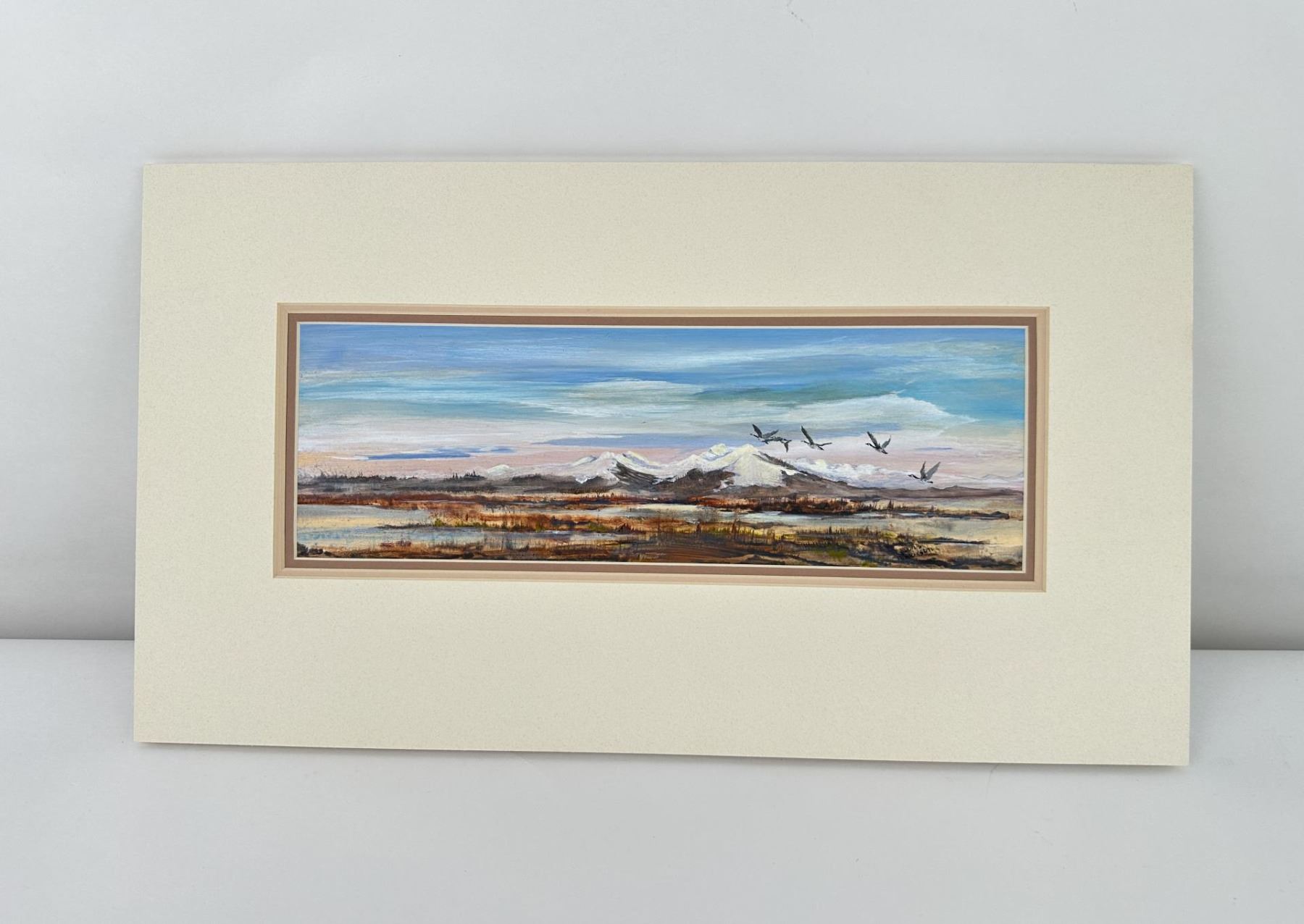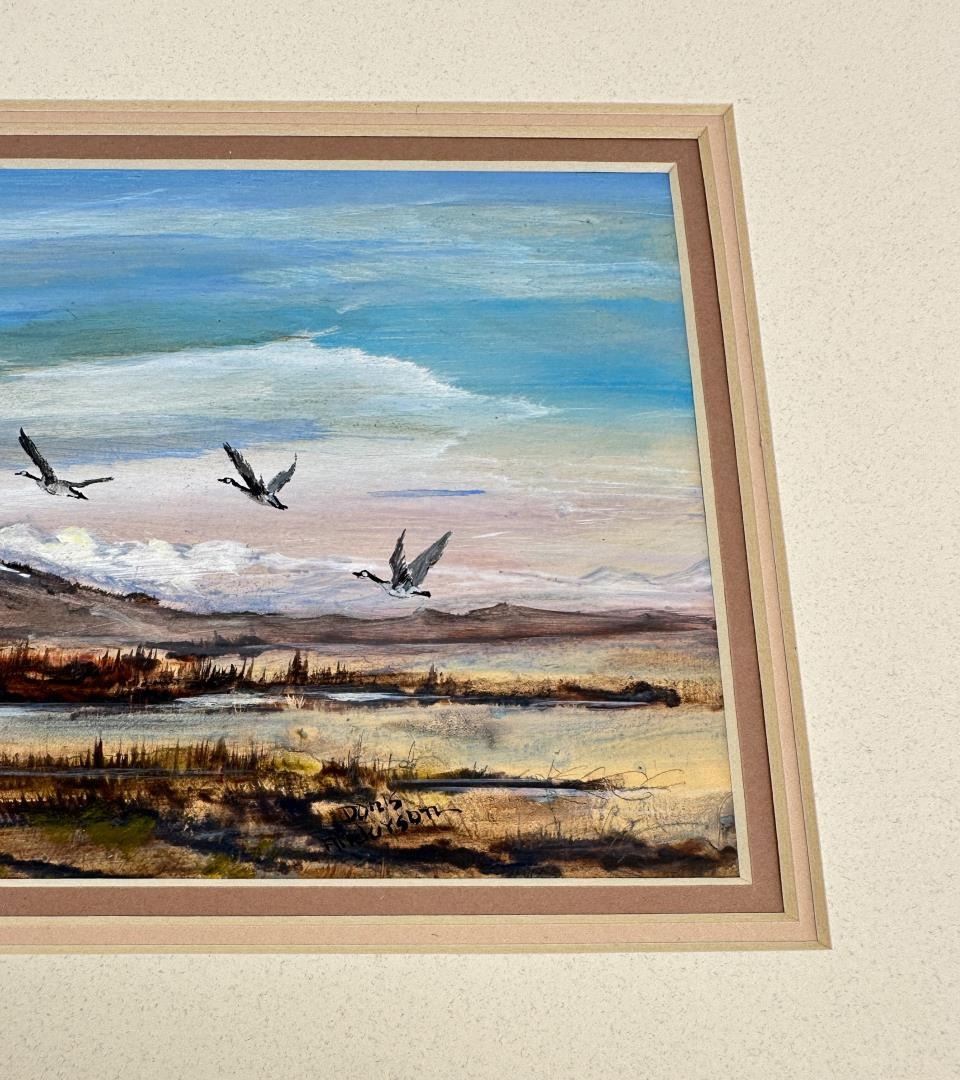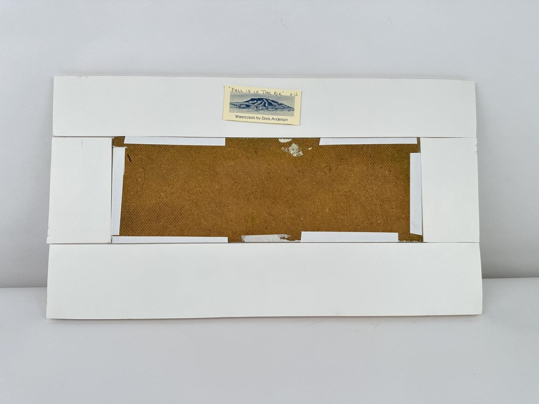 19 1/2" by 10 7/8" in matte. Doris Anderson (Born 1934) is active/lives in Montana, Idaho. Doris Anderson is known for Western landscape, marine, animal. The following is from the artist: Doris Anderson is a largely self-taught watercolourist. Born September 17, 1934 in Sandpoint, Idaho, she moved to Montana as a child. She has always been influenced by the land and even early artistic efforts were an attempt to share that love. She was married in 1955 to a wheat farmer and developed an even stronger feel for the land. During this time of raising four sons, art was in the background but never far away. She has grown through workshops with well known instructors such as Judi Betts, Rex Brandt, Zoltan Zsabo and Joe Bohler and also from fellowship with an excellent group of artists in the Great Falls area. She paints the area she knows and lives in. Her home is located on the banks of the Missouri River near Cascade, Montana. Subject material is largely landscapes but also fishermen, song birds, and a special love of white houses and red barns. The strong influence of the Lewis and Clark Expedition has made her favorite areas to paint, also of interest to historians and collectors alike. She has won numerous awards and has been an exhibitor at the C.M. Russell auction since 1984. She has been in the auction itself fourteen times and a quick draw artist four times. She has shown a number of times at the Classic-American Art show in Los Angeles. This show was held in the Beverly Hills Hilton for a number of years before moving to the Gene Autry Museum in Griffith Park.