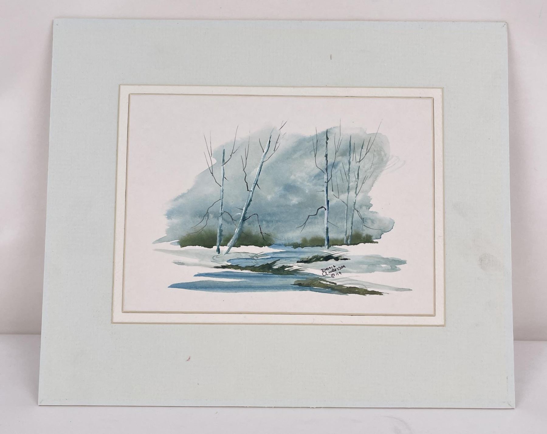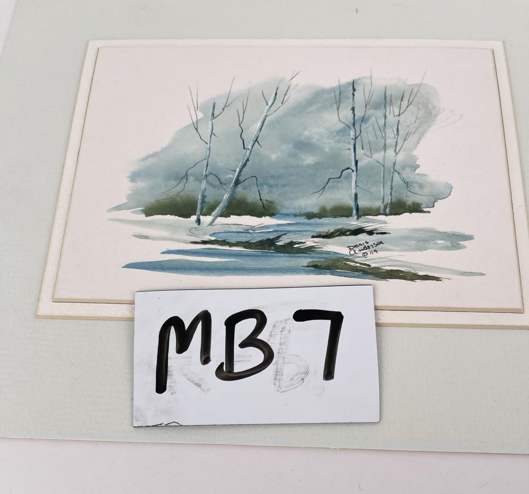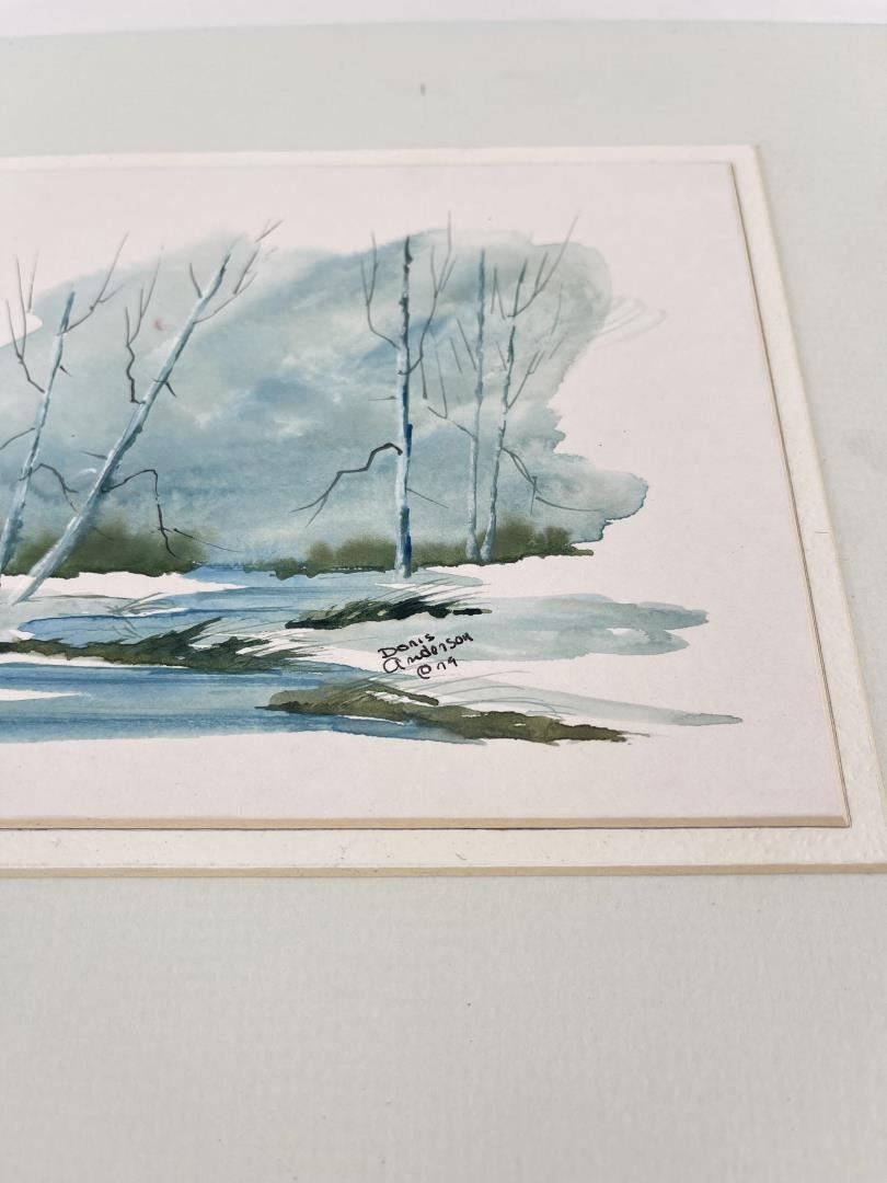 10 1/2" by 8 3/4" in matte. Doris Anderson (Born 1934) is active/lives in Montana, Idaho. Doris Anderson is known for Western landscape, marine, animal. The following is from the artist: Doris Anderson is a largely self-taught watercolourist. Born September 17, 1934 in Sandpoint, Idaho, she moved to Montana as a child. She has always been influenced by the land and even early artistic efforts were an attempt to share that love. She was married in 1955 to a wheat farmer and developed an even stronger feel for the land. During this time of raising four sons, art was in the background but never far away. She has grown through workshops with well known instructors such as Judi Betts, Rex Brandt, Zoltan Zsabo and Joe Bohler and also from fellowship with an excellent group of artists in the Great Falls area. She paints the area she knows and lives in. Her home is located on the banks of the Missouri River near Cascade, Montana. Subject material is largely landscapes but also fishermen, song birds, and a special love of white houses and red barns. The strong influence of the Lewis and Clark Expedition has made her favorite areas to paint, also of interest to historians and collectors alike. She has won numerous awards and has been an exhibitor at the C.M. Russell auction since 1984. She has been in the auction itself fourteen times and a quick draw artist four times. She has shown a number of times at the Classic-American Art show in Los Angeles. This show was held in the Beverly Hills Hilton for a number of years before moving to the Gene Autry Museum in Griffith Park.