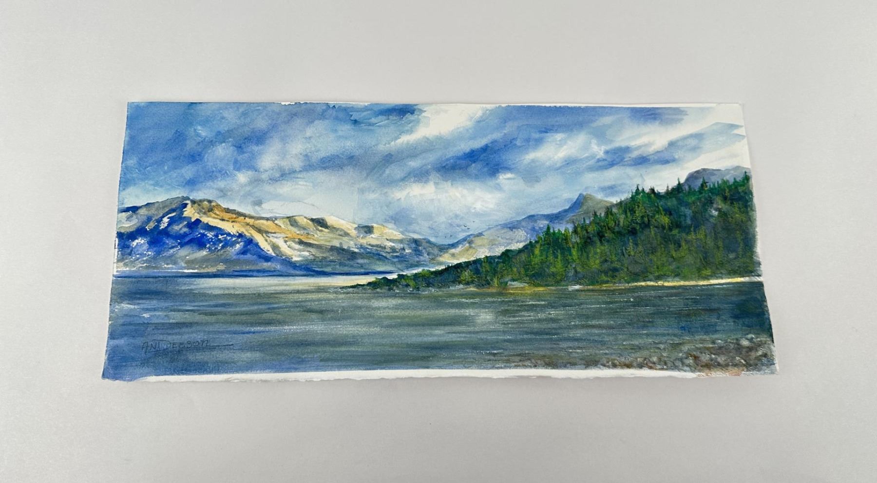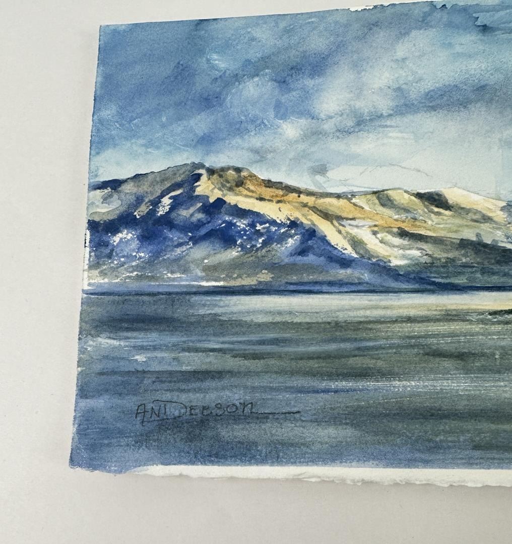 16 1/8" by 7 1/8" Doris Anderson (Born 1934) is active/lives in Montana, Idaho. Doris Anderson is known for Western landscape, marine, animal. The following is from the artist: Doris Anderson is a largely self-taught watercolourist. Born September 17, 1934 in Sandpoint, Idaho, she moved to Montana as a child. She has always been influenced by the land and even early artistic efforts were an attempt to share that love. She was married in 1955 to a wheat farmer and developed an even stronger feel for the land. During this time of raising four sons, art was in the background but never far away. She has grown through workshops with well known instructors such as Judi Betts, Rex Brandt, Zoltan Zsabo and Joe Bohler and also from fellowship with an excellent group of artists in the Great Falls area. She paints the area she knows and lives in. Her home is located on the banks of the Missouri River near Cascade, Montana. Subject material is largely landscapes but also fishermen, song birds, and a special love of white houses and red barns. The strong influence of the Lewis and Clark Expedition has made her favorite areas to paint, also of interest to historians and collectors alike. She has won numerous awards and has been an exhibitor at the C.M. Russell auction since 1984. She has been in the auction itself fourteen times and a quick draw artist four times. She has shown a number of times at the Classic-American Art show in Los Angeles. This show was held in the Beverly Hills Hilton for a number of years before moving to the Gene Autry Museum in Griffith Park.