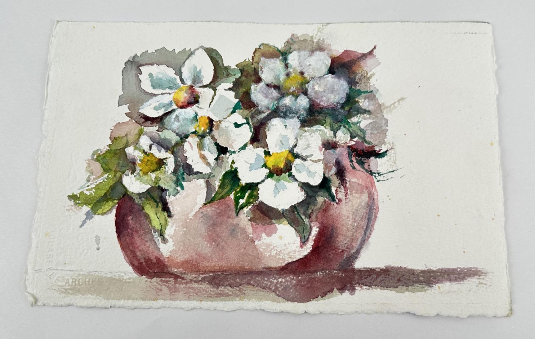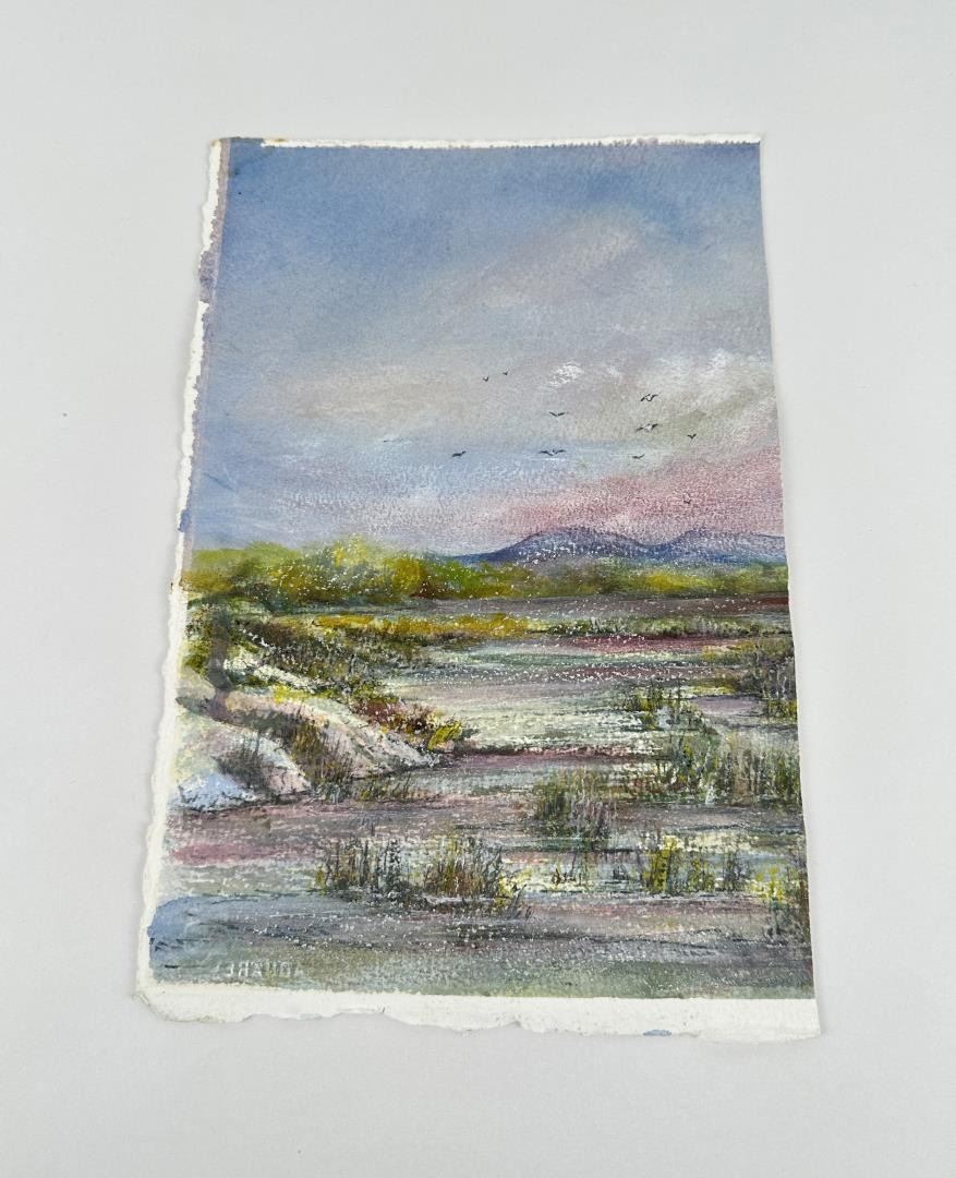 11 1/2" by 7 1/2" Doris Anderson (Born 1934) is active/lives in Montana, Idaho. Doris Anderson is known for Western landscape, marine, animal. The following is from the artist: Doris Anderson is a largely self-taught watercolourist. Born September 17, 1934 in Sandpoint, Idaho, she moved to Montana as a child. She has always been influenced by the land and even early artistic efforts were an attempt to share that love. She was married in 1955 to a wheat farmer and developed an even stronger feel for the land. During this time of raising four sons, art was in the background but never far away. She has grown through workshops with well known instructors such as Judi Betts, Rex Brandt, Zoltan Zsabo and Joe Bohler and also from fellowship with an excellent group of artists in the Great Falls area. She paints the area she knows and lives in. Her home is located on the banks of the Missouri River near Cascade, Montana. Subject material is largely landscapes but also fishermen, song birds, and a special love of white houses and red barns. The strong influence of the Lewis and Clark Expedition has made her favorite areas to paint, also of interest to historians and collectors alike. She has won numerous awards and has been an exhibitor at the C.M. Russell auction since 1984. She has been in the auction itself fourteen times and a quick draw artist four times. She has shown a number of times at the Classic-American Art show in Los Angeles. This show was held in the Beverly Hills Hilton for a number of years before moving to the Gene Autry Museum in Griffith Park.