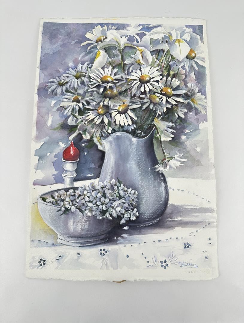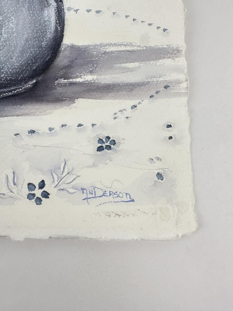 22 3/4" by 15". Doris Anderson (Born 1934) is active/lives in Montana, Idaho. Doris Anderson is known for Western landscape, marine, animal. The following is from the artist: Doris Anderson is a largely self-taught watercolourist. Born September 17, 1934 in Sandpoint, Idaho, she moved to Montana as a child. She has always been influenced by the land and even early artistic efforts were an attempt to share that love. She was married in 1955 to a wheat farmer and developed an even stronger feel for the land. During this time of raising four sons, art was in the background but never far away. She has grown through workshops with well known instructors such as Judi Betts, Rex Brandt, Zoltan Zsabo and Joe Bohler and also from fellowship with an excellent group of artists in the Great Falls area. She paints the area she knows and lives in. Her home is located on the banks of the Missouri River near Cascade, Montana. Subject material is largely landscapes but also fishermen, song birds, and a special love of white houses and red barns. The strong influence of the Lewis and Clark Expedition has made her favorite areas to paint, also of interest to historians and collectors alike. She has won numerous awards and has been an exhibitor at the C.M. Russell auction since 1984. She has been in the auction itself fourteen times and a quick draw artist four times. She has shown a number of times at the Classic-American Art show in Los Angeles. This show was held in the Beverly Hills Hilton for a number of years before moving to the Gene Autry Museum in Griffith Park.