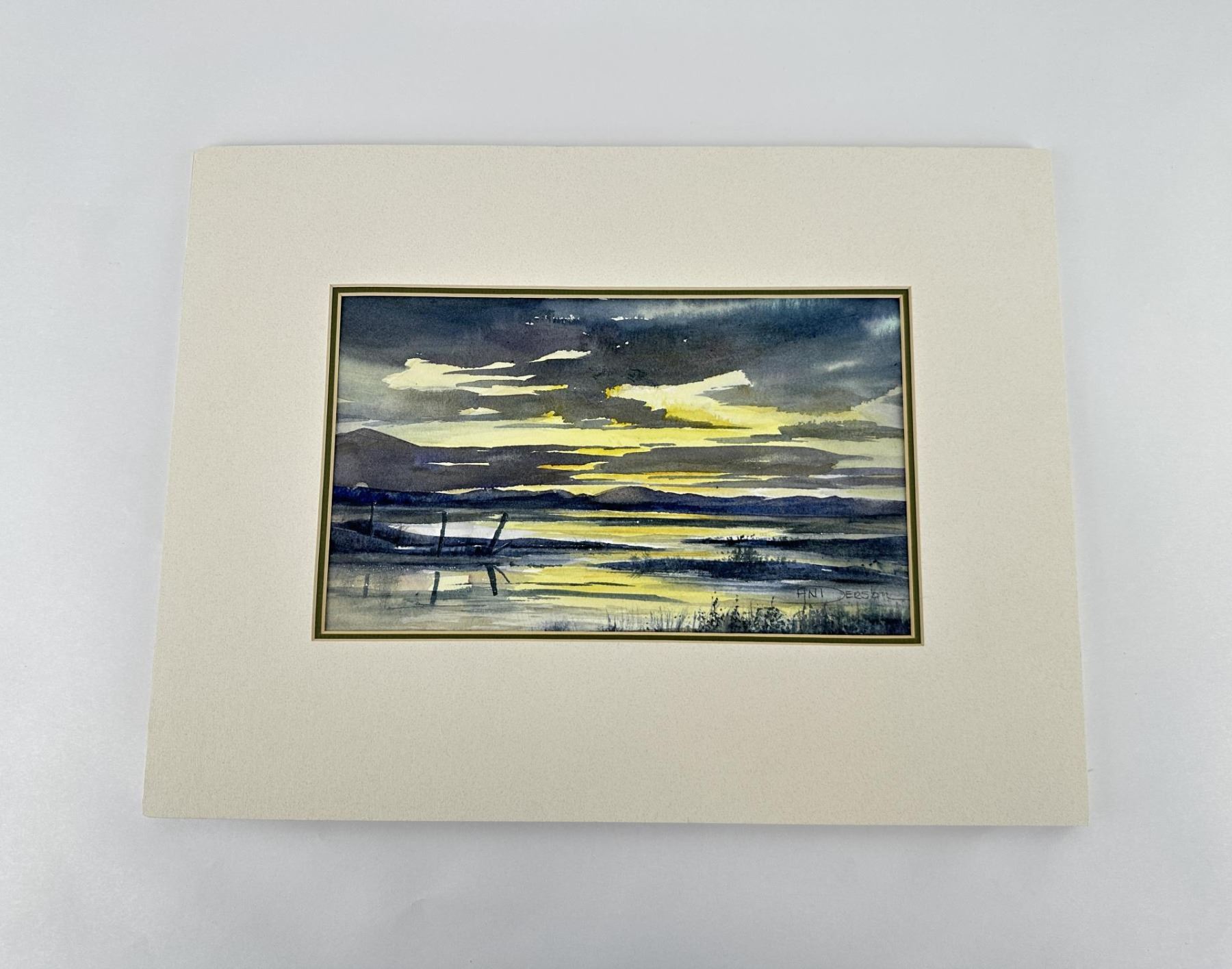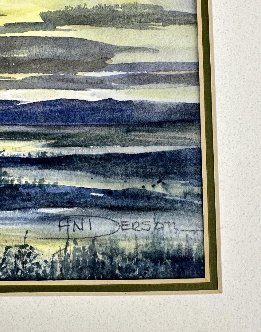 16 1/2" by 12 1/2" in matte. Doris Anderson (Born 1934) is active/lives in Montana, Idaho. Doris Anderson is known for Western landscape, marine, animal. The following is from the artist: Doris Anderson is a largely self-taught watercolourist. Born September 17, 1934 in Sandpoint, Idaho, she moved to Montana as a child. She has always been influenced by the land and even early artistic efforts were an attempt to share that love. She was married in 1955 to a wheat farmer and developed an even stronger feel for the land. During this time of raising four sons, art was in the background but never far away. She has grown through workshops with well known instructors such as Judi Betts, Rex Brandt, Zoltan Zsabo and Joe Bohler and also from fellowship with an excellent group of artists in the Great Falls area. She paints the area she knows and lives in. Her home is located on the banks of the Missouri River near Cascade, Montana. Subject material is largely landscapes but also fishermen, song birds, and a special love of white houses and red barns. The strong influence of the Lewis and Clark Expedition has made her favorite areas to paint, also of interest to historians and collectors alike. She has won numerous awards and has been an exhibitor at the C.M. Russell auction since 1984. She has been in the auction itself fourteen times and a quick draw artist four times. She has shown a number of times at the Classic-American Art show in Los Angeles. This show was held in the Beverly Hills Hilton for a number of years before moving to the Gene Autry Museum in Griffith Park.