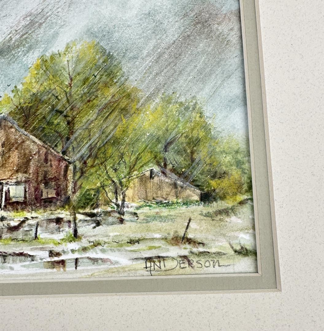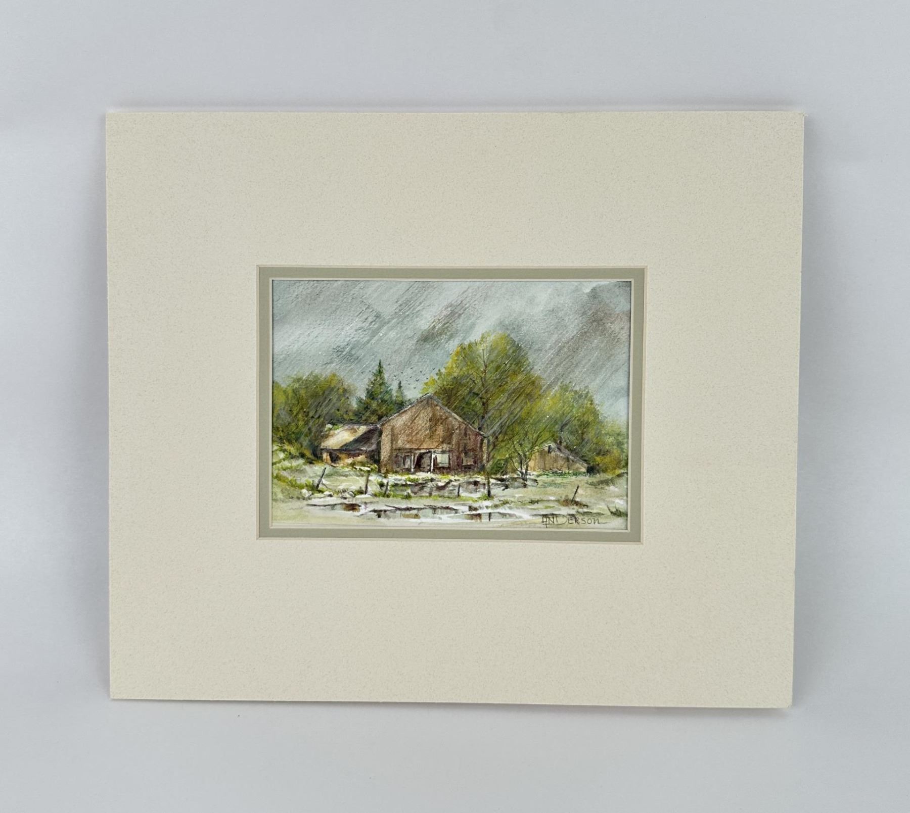 12 3/4" by 11" in matte. Doris Anderson (Born 1934) is active/lives in Montana, Idaho. Doris Anderson is known for Western landscape, marine, animal. The following is from the artist: Doris Anderson is a largely self-taught watercolourist. Born September 17, 1934 in Sandpoint, Idaho, she moved to Montana as a child. She has always been influenced by the land and even early artistic efforts were an attempt to share that love. She was married in 1955 to a wheat farmer and developed an even stronger feel for the land. During this time of raising four sons, art was in the background but never far away. She has grown through workshops with well known instructors such as Judi Betts, Rex Brandt, Zoltan Zsabo and Joe Bohler and also from fellowship with an excellent group of artists in the Great Falls area. She paints the area she knows and lives in. Her home is located on the banks of the Missouri River near Cascade, Montana. Subject material is largely landscapes but also fishermen, song birds, and a special love of white houses and red barns. The strong influence of the Lewis and Clark Expedition has made her favorite areas to paint, also of interest to historians and collectors alike. She has won numerous awards and has been an exhibitor at the C.M. Russell auction since 1984. She has been in the auction itself fourteen times and a quick draw artist four times. She has shown a number of times at the Classic-American Art show in Los Angeles. This show was held in the Beverly Hills Hilton for a number of years before moving to the Gene Autry Museum in Griffith Park.