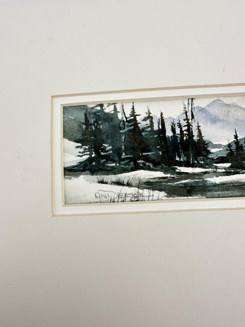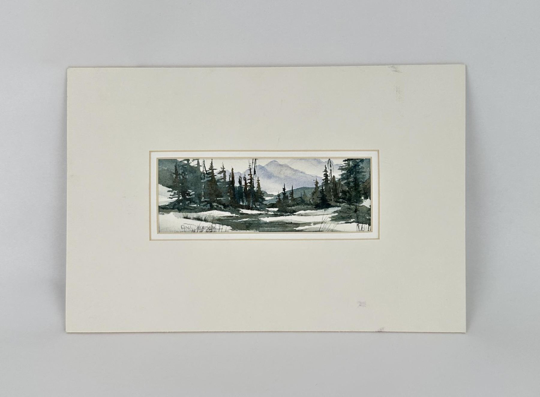 11 7/8" by 8" in matte. Doris Anderson (Born 1934) is active/lives in Montana, Idaho. Doris Anderson is known for Western landscape, marine, animal. The following is from the artist: Doris Anderson is a largely self-taught watercolourist. Born September 17, 1934 in Sandpoint, Idaho, she moved to Montana as a child. She has always been influenced by the land and even early artistic efforts were an attempt to share that love. She was married in 1955 to a wheat farmer and developed an even stronger feel for the land. During this time of raising four sons, art was in the background but never far away. She has grown through workshops with well known instructors such as Judi Betts, Rex Brandt, Zoltan Zsabo and Joe Bohler and also from fellowship with an excellent group of artists in the Great Falls area. She paints the area she knows and lives in. Her home is located on the banks of the Missouri River near Cascade, Montana. Subject material is largely landscapes but also fishermen, song birds, and a special love of white houses and red barns. The strong influence of the Lewis and Clark Expedition has made her favorite areas to paint, also of interest to historians and collectors alike. She has won numerous awards and has been an exhibitor at the C.M. Russell auction since 1984. She has been in the auction itself fourteen times and a quick draw artist four times. She has shown a number of times at the Classic-American Art show in Los Angeles. This show was held in the Beverly Hills Hilton for a number of years before moving to the Gene Autry Museum in Griffith Park.