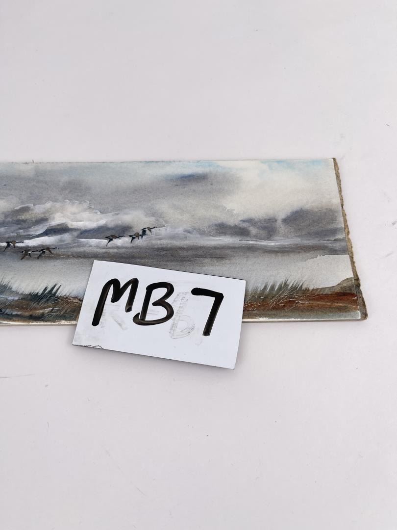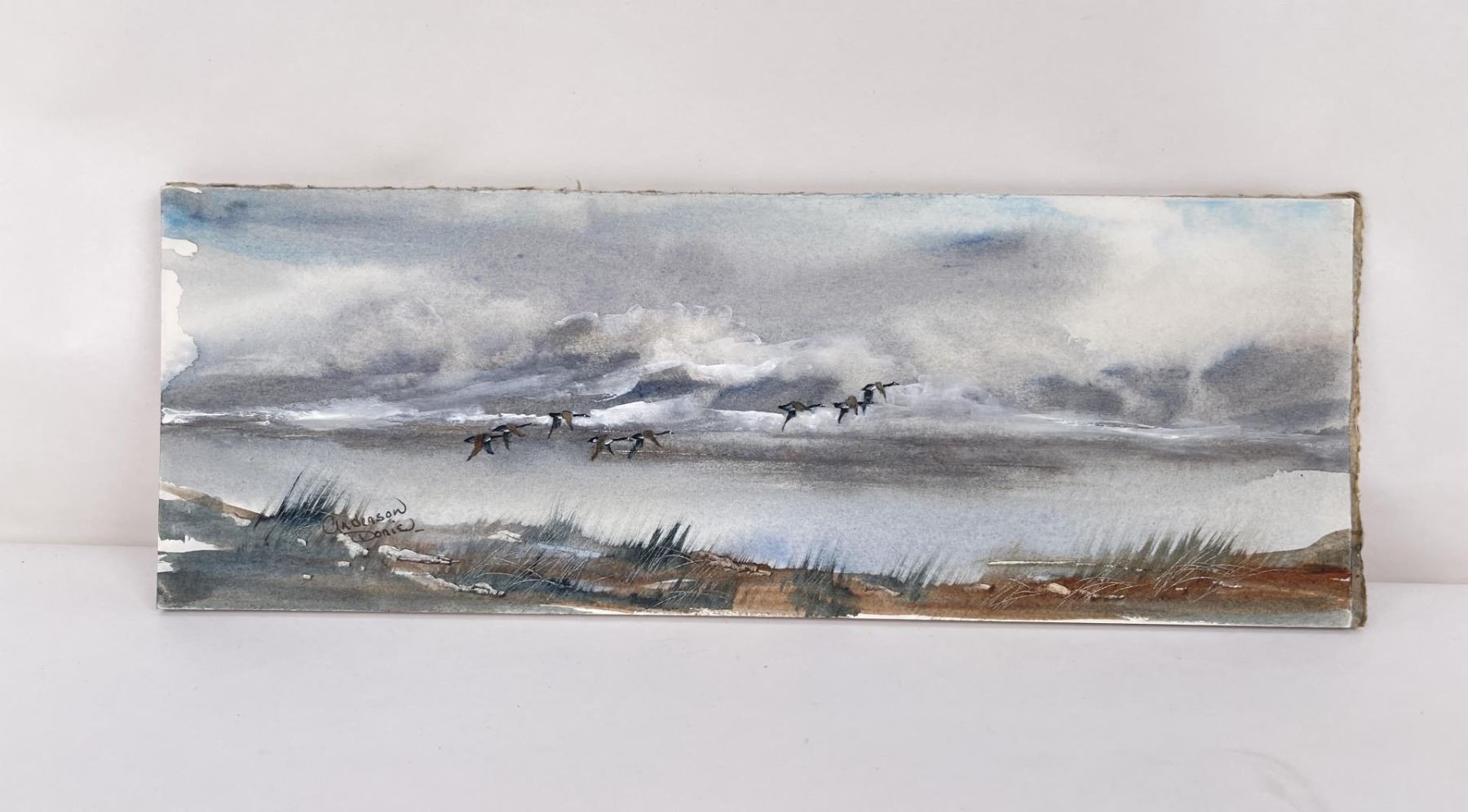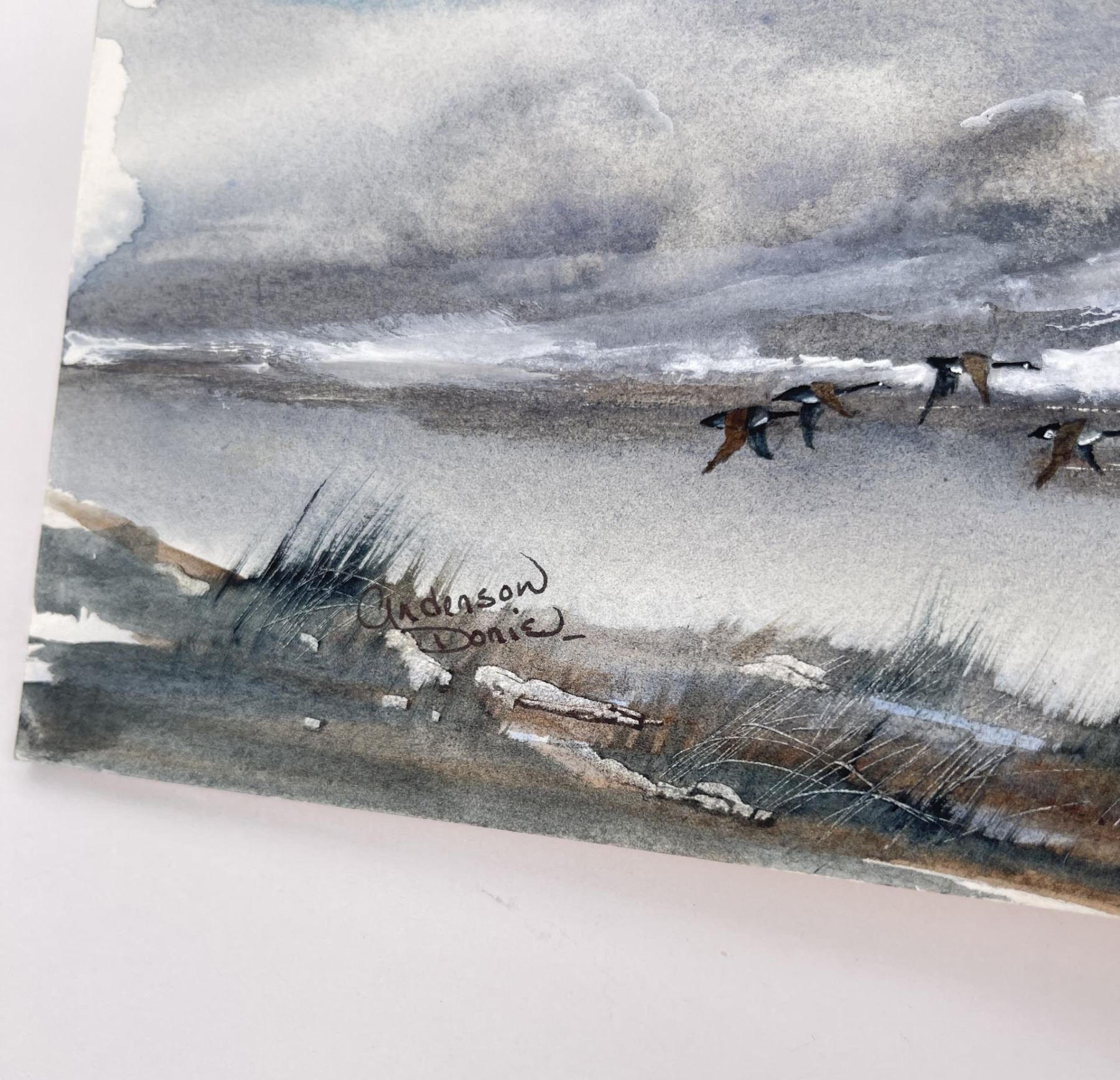 12 1/8" by 4 3/8". Doris Anderson (Born 1934) is active/lives in Montana, Idaho. Doris Anderson is known for Western landscape, marine, animal. The following is from the artist: Doris Anderson is a largely self-taught watercolourist. Born September 17, 1934 in Sandpoint, Idaho, she moved to Montana as a child. She has always been influenced by the land and even early artistic efforts were an attempt to share that love. She was married in 1955 to a wheat farmer and developed an even stronger feel for the land. During this time of raising four sons, art was in the background but never far away. She has grown through workshops with well known instructors such as Judi Betts, Rex Brandt, Zoltan Zsabo and Joe Bohler and also from fellowship with an excellent group of artists in the Great Falls area. She paints the area she knows and lives in. Her home is located on the banks of the Missouri River near Cascade, Montana. Subject material is largely landscapes but also fishermen, song birds, and a special love of white houses and red barns. The strong influence of the Lewis and Clark Expedition has made her favorite areas to paint, also of interest to historians and collectors alike. She has won numerous awards and has been an exhibitor at the C.M. Russell auction since 1984. She has been in the auction itself fourteen times and a quick draw artist four times. She has shown a number of times at the Classic-American Art show in Los Angeles. This show was held in the Beverly Hills Hilton for a number of years before moving to the Gene Autry Museum in Griffith Park.