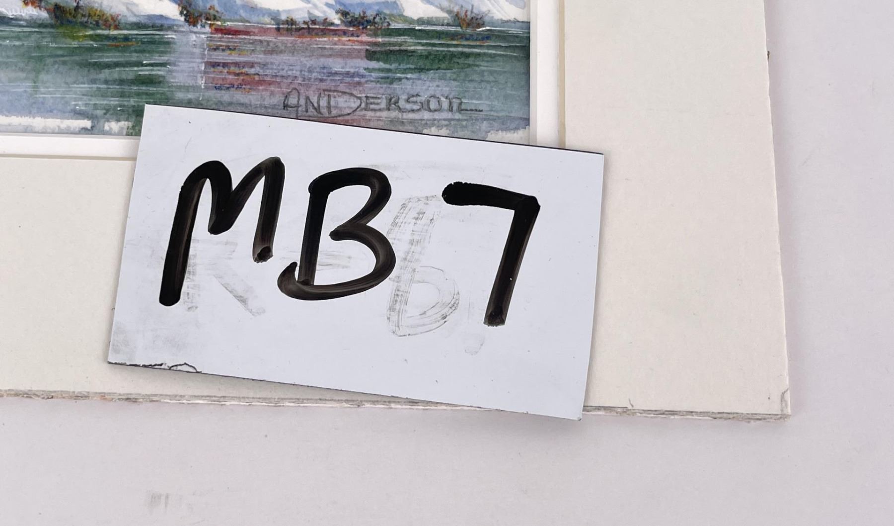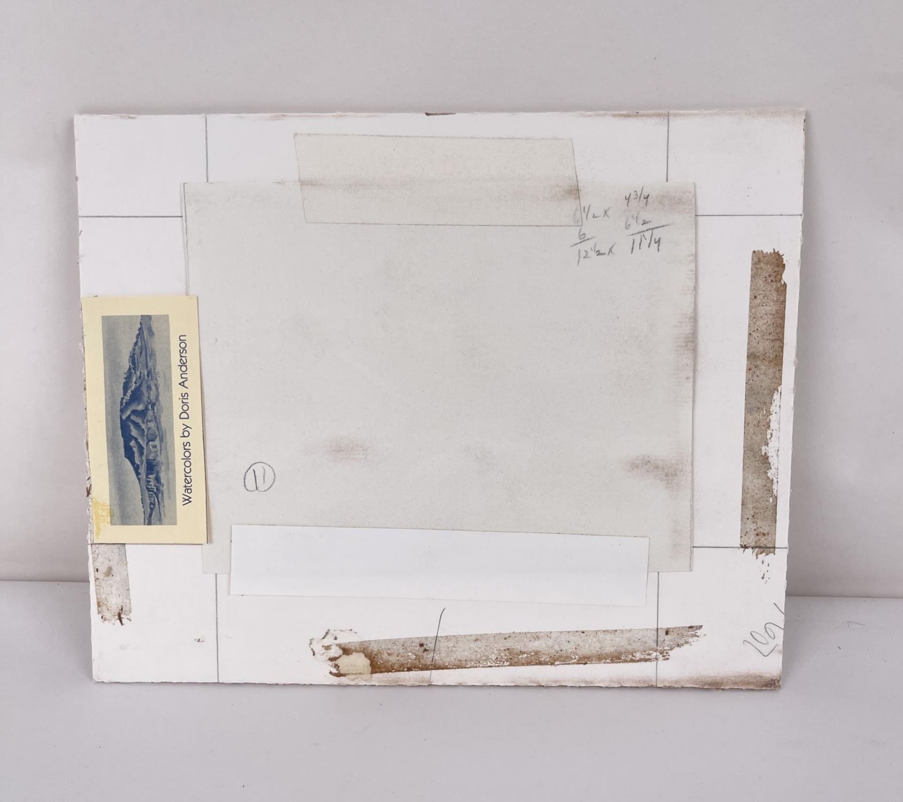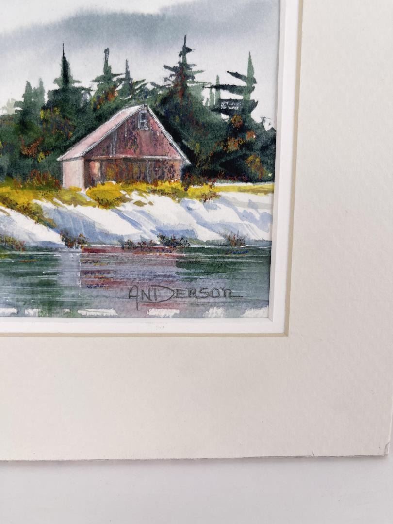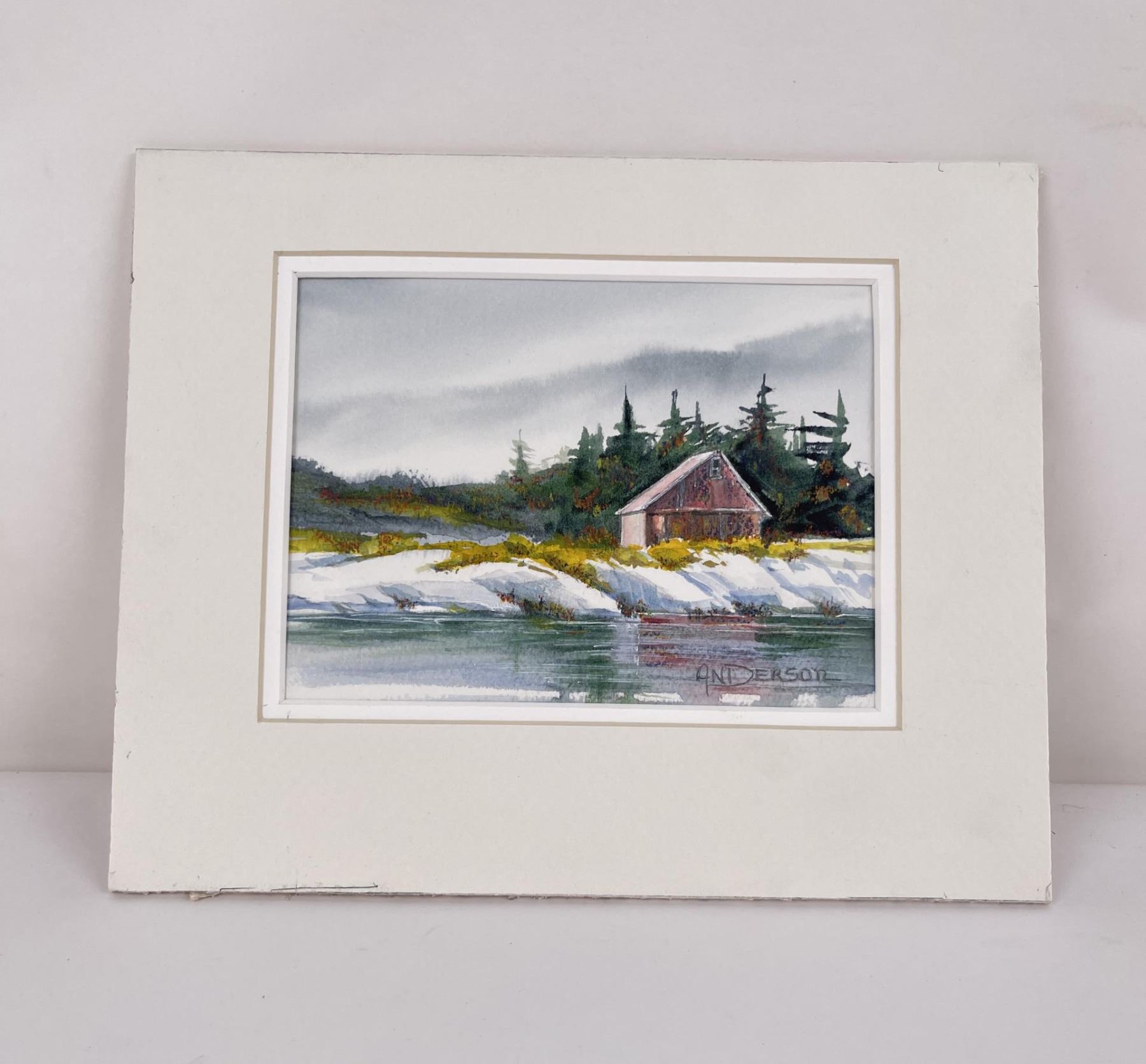 10" by 8 1/8" in matte. Doris Anderson (Born 1934) is active/lives in Montana, Idaho. Doris Anderson is known for Western landscape, marine, animal. The following is from the artist: Doris Anderson is a largely self-taught watercolourist. Born September 17, 1934 in Sandpoint, Idaho, she moved to Montana as a child. She has always been influenced by the land and even early artistic efforts were an attempt to share that love. She was married in 1955 to a wheat farmer and developed an even stronger feel for the land. During this time of raising four sons, art was in the background but never far away. She has grown through workshops with well known instructors such as Judi Betts, Rex Brandt, Zoltan Zsabo and Joe Bohler and also from fellowship with an excellent group of artists in the Great Falls area. She paints the area she knows and lives in. Her home is located on the banks of the Missouri River near Cascade, Montana. Subject material is largely landscapes but also fishermen, song birds, and a special love of white houses and red barns. The strong influence of the Lewis and Clark Expedition has made her favorite areas to paint, also of interest to historians and collectors alike. She has won numerous awards and has been an exhibitor at the C.M. Russell auction since 1984. She has been in the auction itself fourteen times and a quick draw artist four times. She has shown a number of times at the Classic-American Art show in Los Angeles. This show was held in the Beverly Hills Hilton for a number of years before moving to the Gene Autry Museum in Griffith Park.