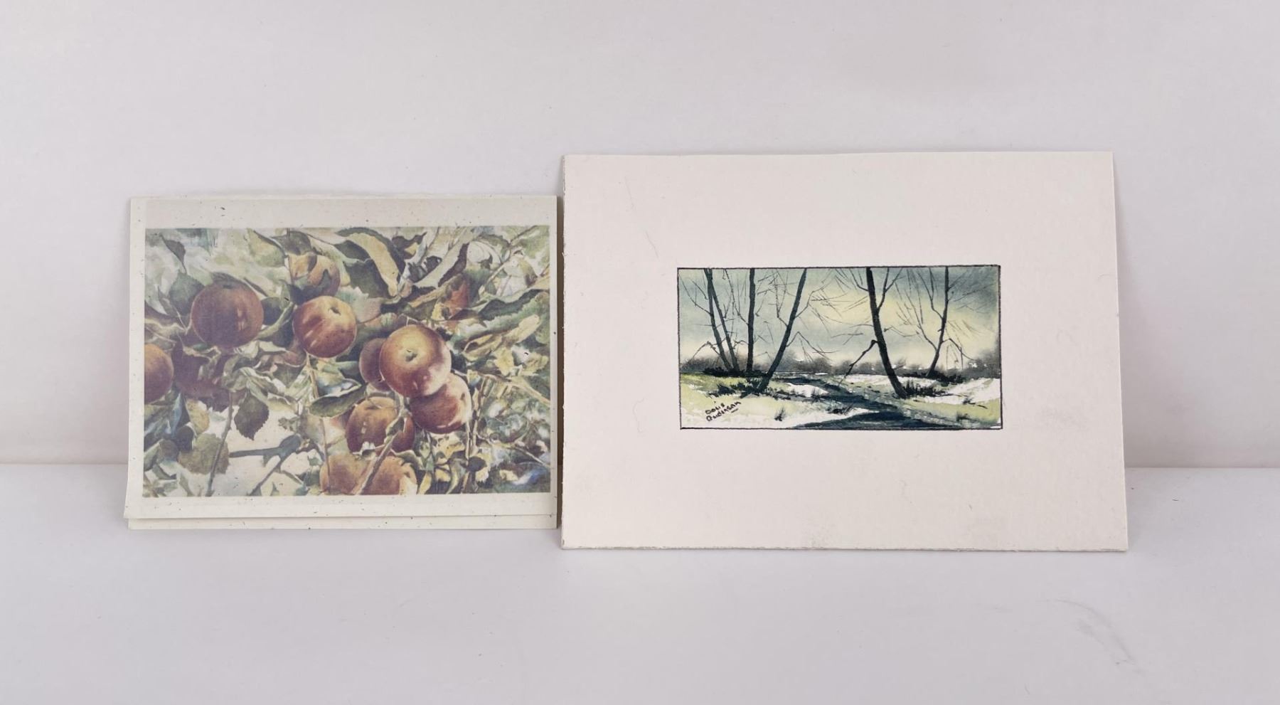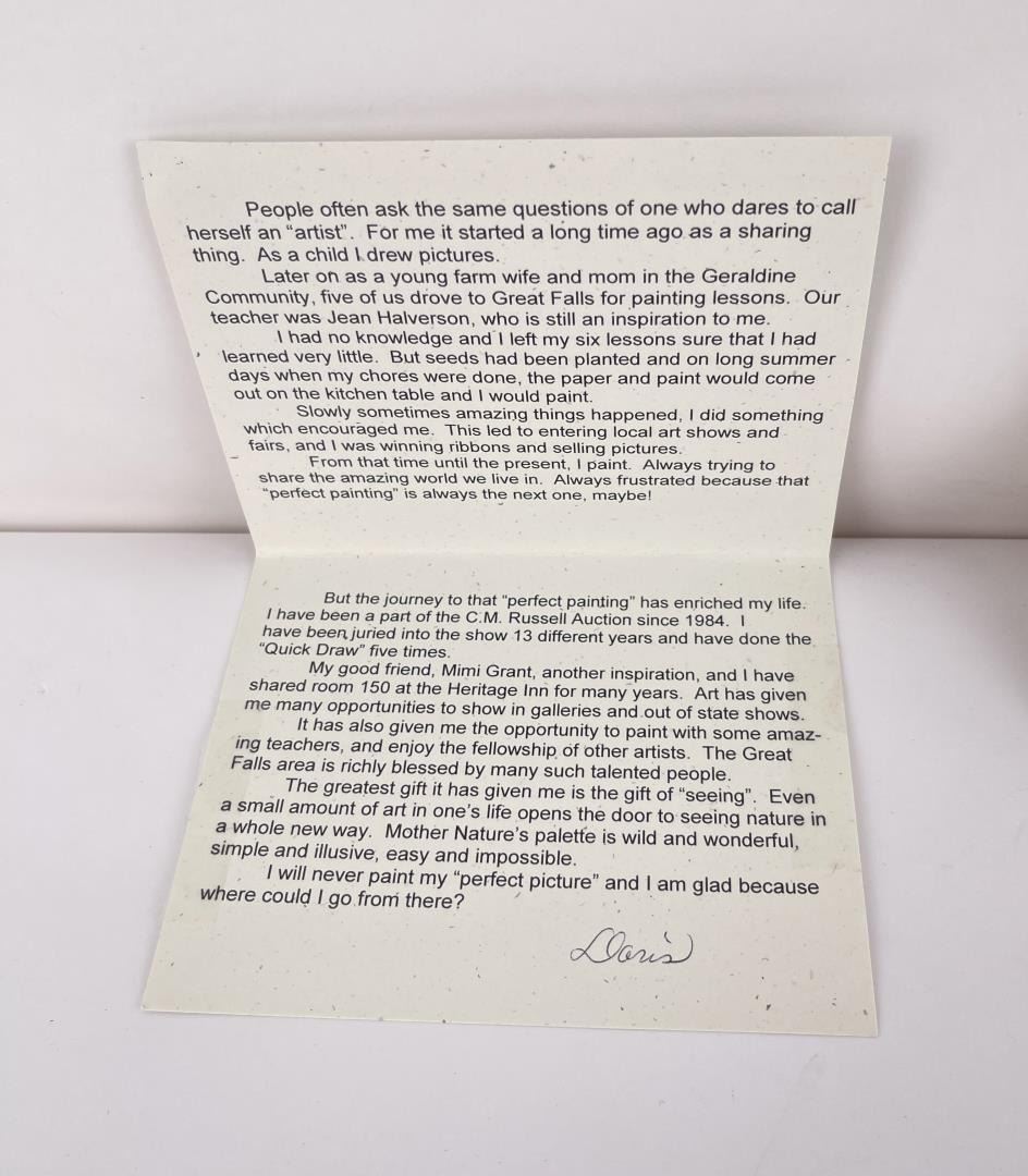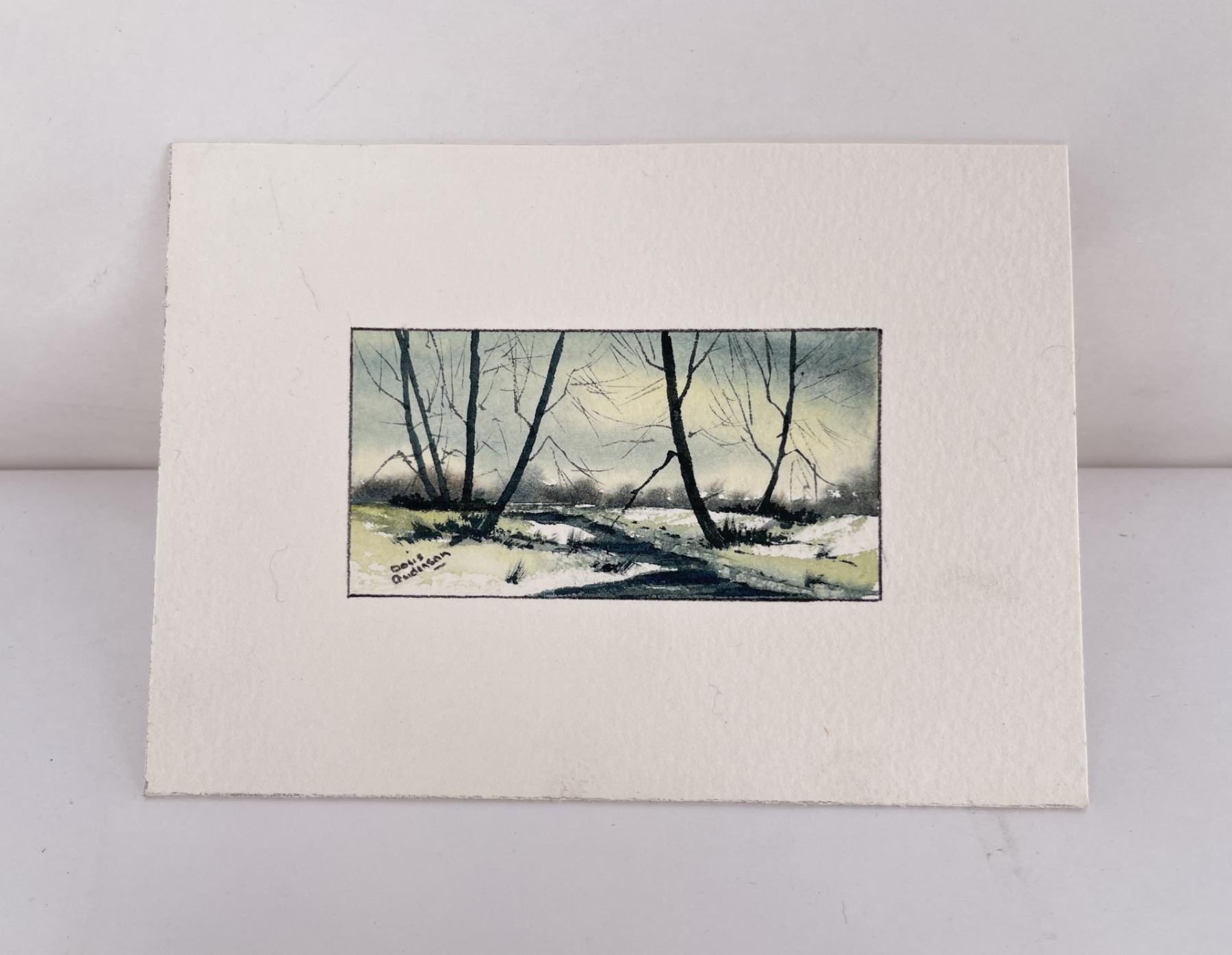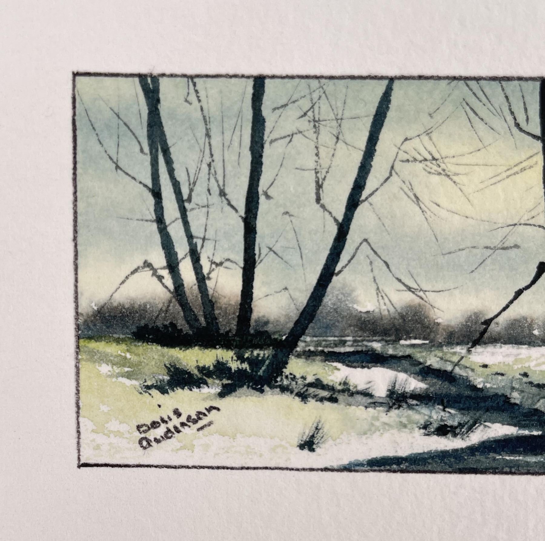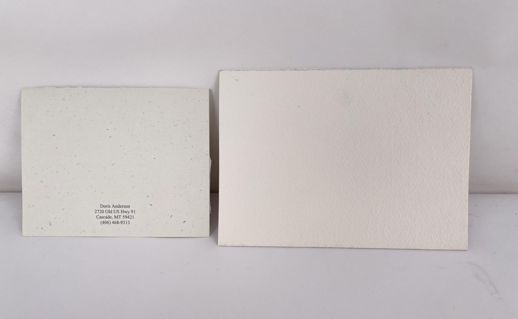7" by 5" in matte. Doris Anderson (Born 1934) is active/lives in Montana, Idaho. Doris Anderson is known for Western landscape, marine, animal. The following is from the artist: Doris Anderson is a largely self-taught watercolourist. Born September 17, 1934 in Sandpoint, Idaho, she moved to Montana as a child. She has always been influenced by the land and even early artistic efforts were an attempt to share that love. She was married in 1955 to a wheat farmer and developed an even stronger feel for the land. During this time of raising four sons, art was in the background but never far away. She has grown through workshops with well known instructors such as Judi Betts, Rex Brandt, Zoltan Zsabo and Joe Bohler and also from fellowship with an excellent group of artists in the Great Falls area. She paints the area she knows and lives in. Her home is located on the banks of the Missouri River near Cascade, Montana. Subject material is largely landscapes but also fishermen, song birds, and a special love of white houses and red barns. The strong influence of the Lewis and Clark Expedition has made her favorite areas to paint, also of interest to historians and collectors alike. She has won numerous awards and has been an exhibitor at the C.M. Russell auction since 1984. She has been in the auction itself fourteen times and a quick draw artist four times. She has shown a number of times at the Classic-American Art show in Los Angeles. This show was held in the Beverly Hills Hilton for a number of years before moving to the Gene Autry Museum in Griffith Park.
