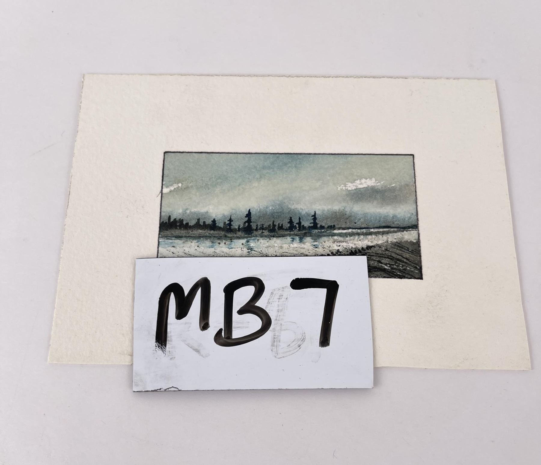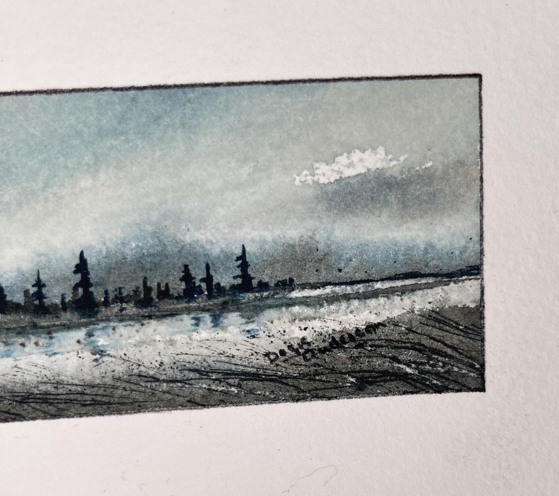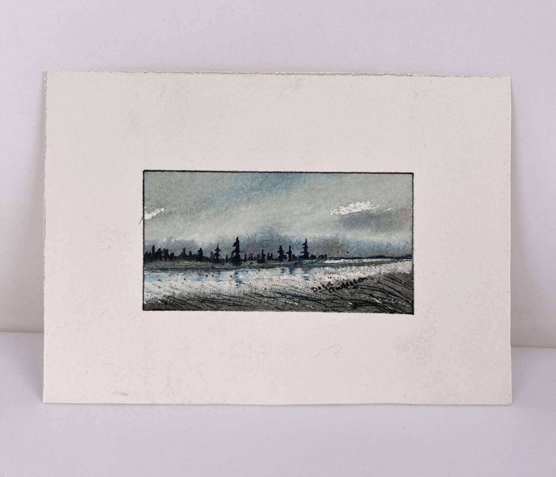 7" by 5" in matte. Doris Anderson (Born 1934) is active/lives in Montana, Idaho. Doris Anderson is known for Western landscape, marine, animal. The following is from the artist: Doris Anderson is a largely self-taught watercolourist. Born September 17, 1934 in Sandpoint, Idaho, she moved to Montana as a child. She has always been influenced by the land and even early artistic efforts were an attempt to share that love. She was married in 1955 to a wheat farmer and developed an even stronger feel for the land. During this time of raising four sons, art was in the background but never far away. She has grown through workshops with well known instructors such as Judi Betts, Rex Brandt, Zoltan Zsabo and Joe Bohler and also from fellowship with an excellent group of artists in the Great Falls area. She paints the area she knows and lives in. Her home is located on the banks of the Missouri River near Cascade, Montana. Subject material is largely landscapes but also fishermen, song birds, and a special love of white houses and red barns. The strong influence of the Lewis and Clark Expedition has made her favorite areas to paint, also of interest to historians and collectors alike. She has won numerous awards and has been an exhibitor at the C.M. Russell auction since 1984. She has been in the auction itself fourteen times and a quick draw artist four times. She has shown a number of times at the Classic-American Art show in Los Angeles. This show was held in the Beverly Hills Hilton for a number of years before moving to the Gene Autry Museum in Griffith Park.