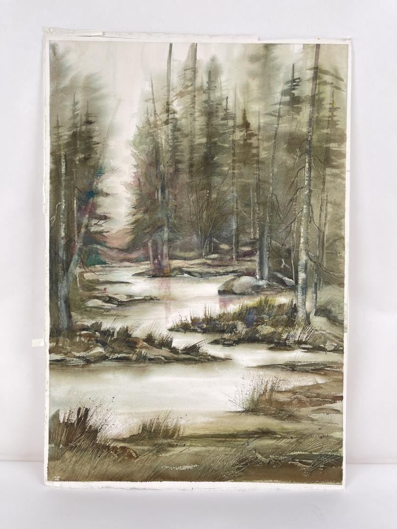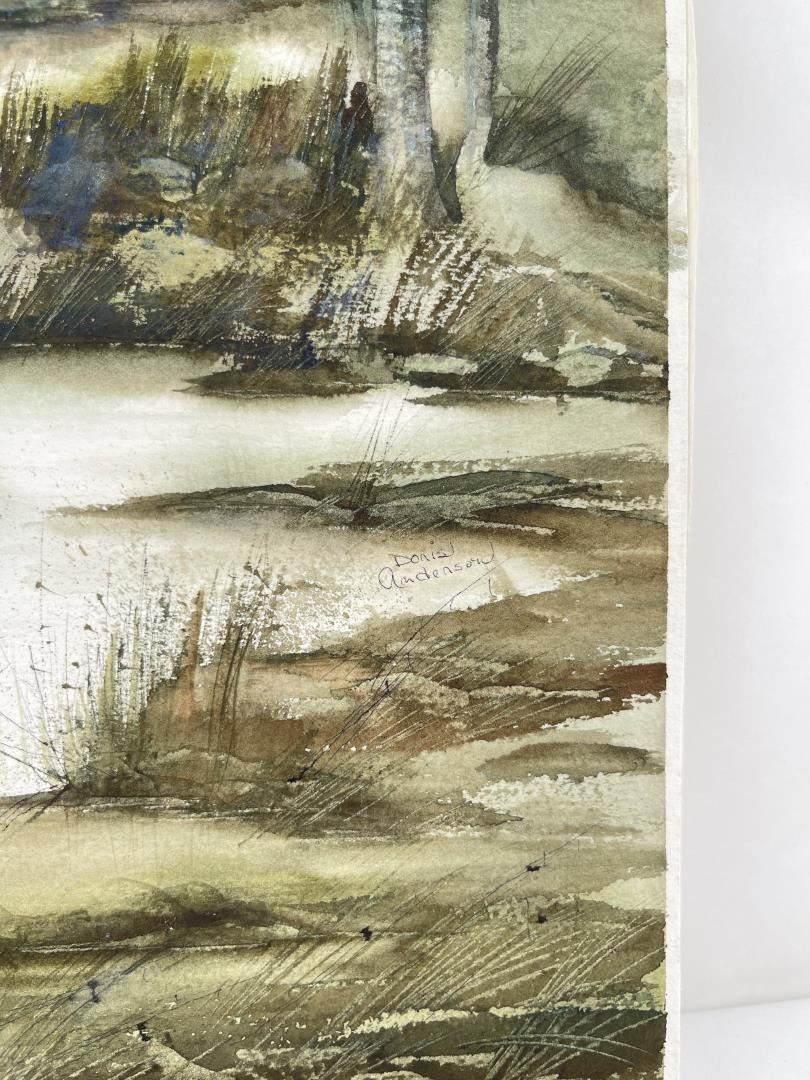23" by 15 3/8" Doris Anderson (Born 1934) is active/lives in Montana, Idaho. Doris Anderson is known for Western landscape, marine, animal. The following is from the artist: Doris Anderson is a largely self-taught watercolourist. Born September 17, 1934 in Sandpoint, Idaho, she moved to Montana as a child. She has always been influenced by the land and even early artistic efforts were an attempt to share that love. She was married in 1955 to a wheat farmer and developed an even stronger feel for the land. During this time of raising four sons, art was in the background but never far away. She has grown through workshops with well known instructors such as Judi Betts, Rex Brandt, Zoltan Zsabo and Joe Bohler and also from fellowship with an excellent group of artists in the Great Falls area. She paints the area she knows and lives in. Her home is located on the banks of the Missouri River near Cascade, Montana. Subject material is largely landscapes but also fishermen, song birds, and a special love of white houses and red barns. The strong influence of the Lewis and Clark Expedition has made her favorite areas to paint, also of interest to historians and collectors alike. She has won numerous awards and has been an exhibitor at the C.M. Russell auction since 1984. She has been in the auction itself fourteen times and a quick draw artist four times. She has shown a number of times at the Classic-American Art show in Los Angeles. This show was held in the Beverly Hills Hilton for a number of years before moving to the Gene Autry Museum in Griffith Park.