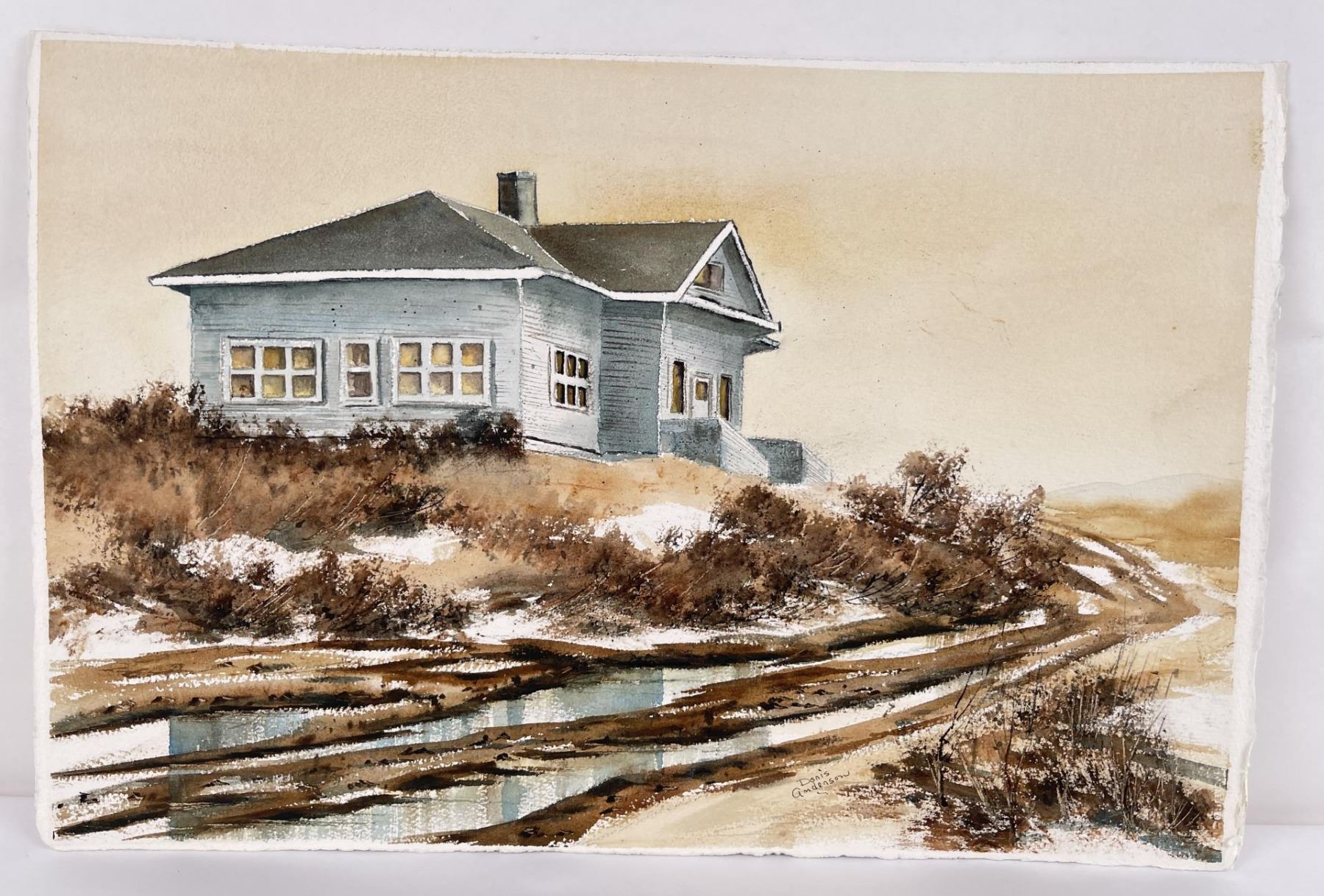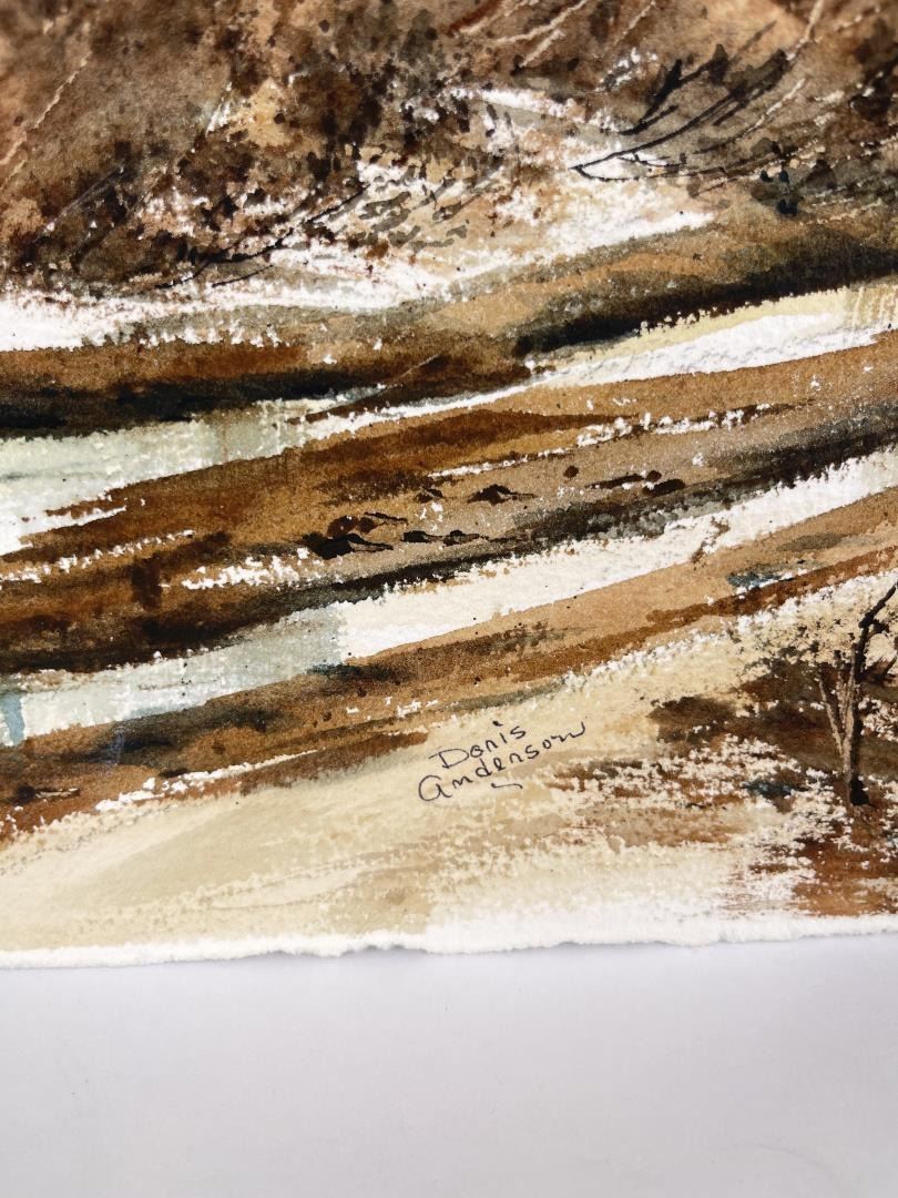 22 3/4" by 15" Doris Anderson (Born 1934) is active/lives in Montana, Idaho. Doris Anderson is known for Western landscape, marine, animal. The following is from the artist: Doris Anderson is a largely self-taught watercolourist. Born September 17, 1934 in Sandpoint, Idaho, she moved to Montana as a child. She has always been influenced by the land and even early artistic efforts were an attempt to share that love. She was married in 1955 to a wheat farmer and developed an even stronger feel for the land. During this time of raising four sons, art was in the background but never far away. She has grown through workshops with well known instructors such as Judi Betts, Rex Brandt, Zoltan Zsabo and Joe Bohler and also from fellowship with an excellent group of artists in the Great Falls area. She paints the area she knows and lives in. Her home is located on the banks of the Missouri River near Cascade, Montana. Subject material is largely landscapes but also fishermen, song birds, and a special love of white houses and red barns. The strong influence of the Lewis and Clark Expedition has made her favorite areas to paint, also of interest to historians and collectors alike. She has won numerous awards and has been an exhibitor at the C.M. Russell auction since 1984. She has been in the auction itself fourteen times and a quick draw artist four times. She has shown a number of times at the Classic-American Art show in Los Angeles. This show was held in the Beverly Hills Hilton for a number of years before moving to the Gene Autry Museum in Griffith Park.