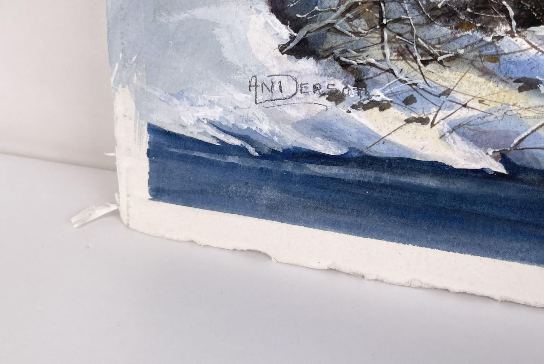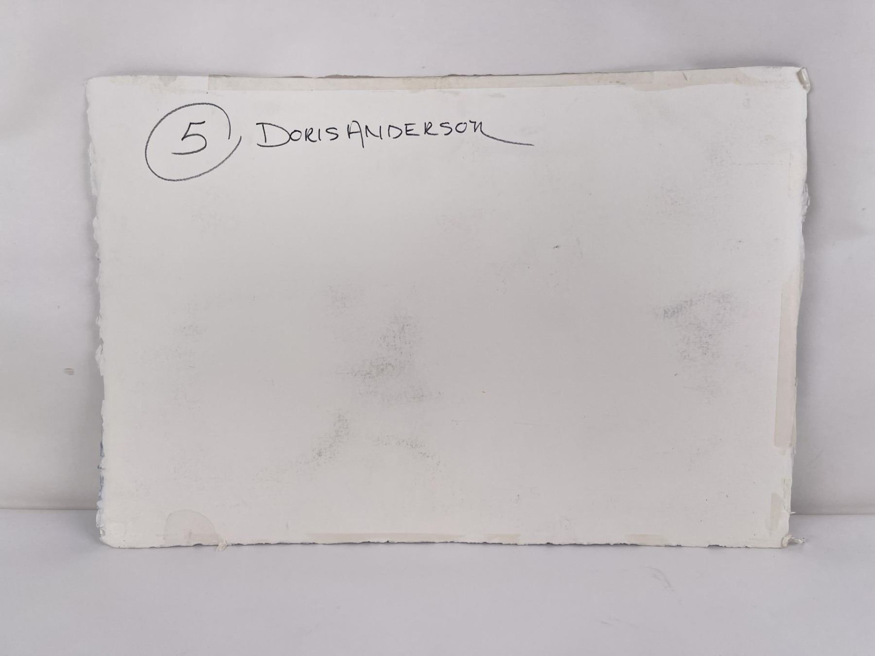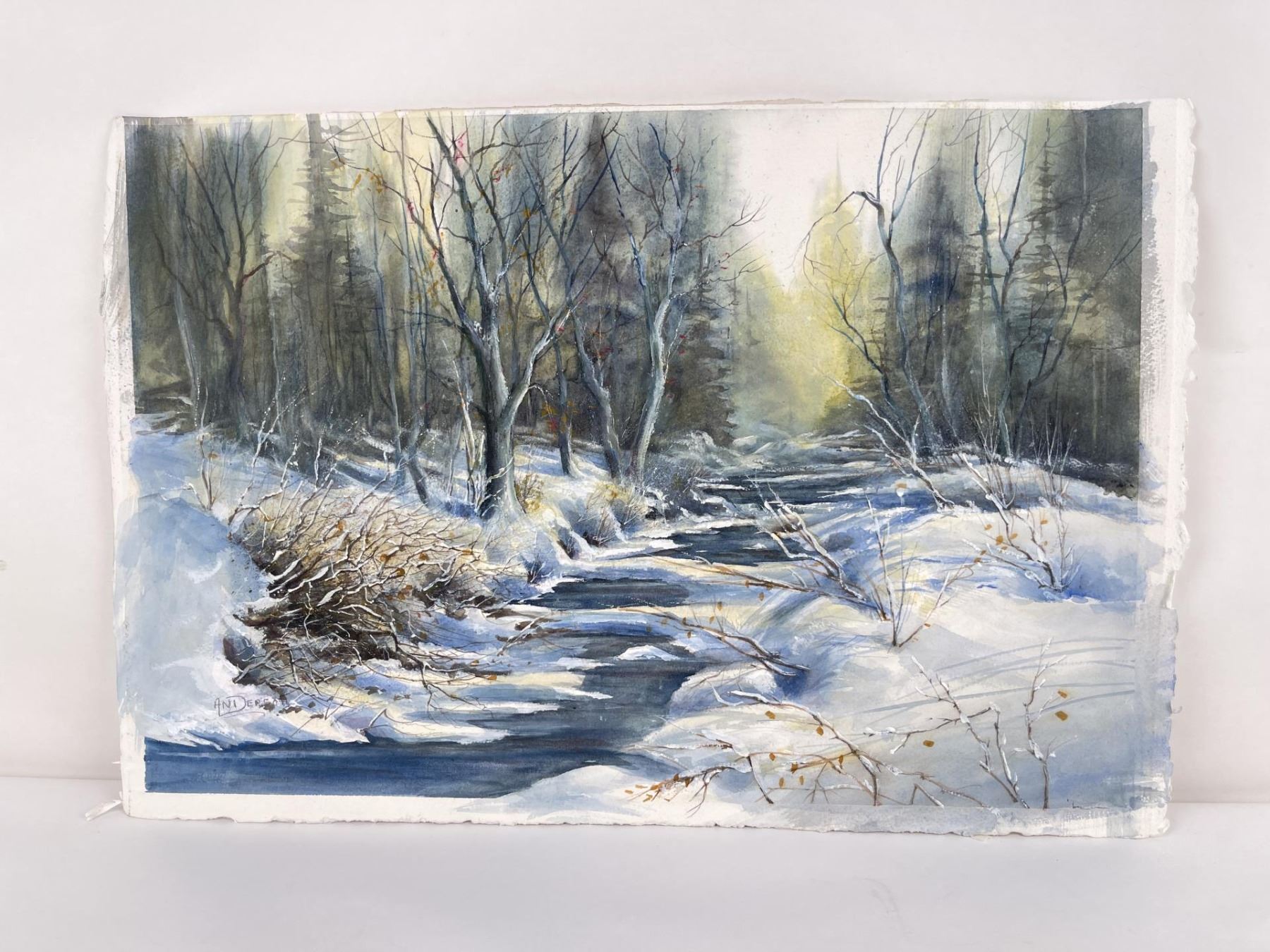 22 5/8" by 15 1/4" Doris Anderson (Born 1934) is active/lives in Montana, Idaho. Doris Anderson is known for Western landscape, marine, animal. The following is from the artist: Doris Anderson is a largely self-taught watercolourist. Born September 17, 1934 in Sandpoint, Idaho, she moved to Montana as a child. She has always been influenced by the land and even early artistic efforts were an attempt to share that love. She was married in 1955 to a wheat farmer and developed an even stronger feel for the land. During this time of raising four sons, art was in the background but never far away. She has grown through workshops with well known instructors such as Judi Betts, Rex Brandt, Zoltan Zsabo and Joe Bohler and also from fellowship with an excellent group of artists in the Great Falls area. She paints the area she knows and lives in. Her home is located on the banks of the Missouri River near Cascade, Montana. Subject material is largely landscapes but also fishermen, song birds, and a special love of white houses and red barns. The strong influence of the Lewis and Clark Expedition has made her favorite areas to paint, also of interest to historians and collectors alike. She has won numerous awards and has been an exhibitor at the C.M. Russell auction since 1984. She has been in the auction itself fourteen times and a quick draw artist four times. She has shown a number of times at the Classic-American Art show in Los Angeles. This show was held in the Beverly Hills Hilton for a number of years before moving to the Gene Autry Museum in Griffith Park.