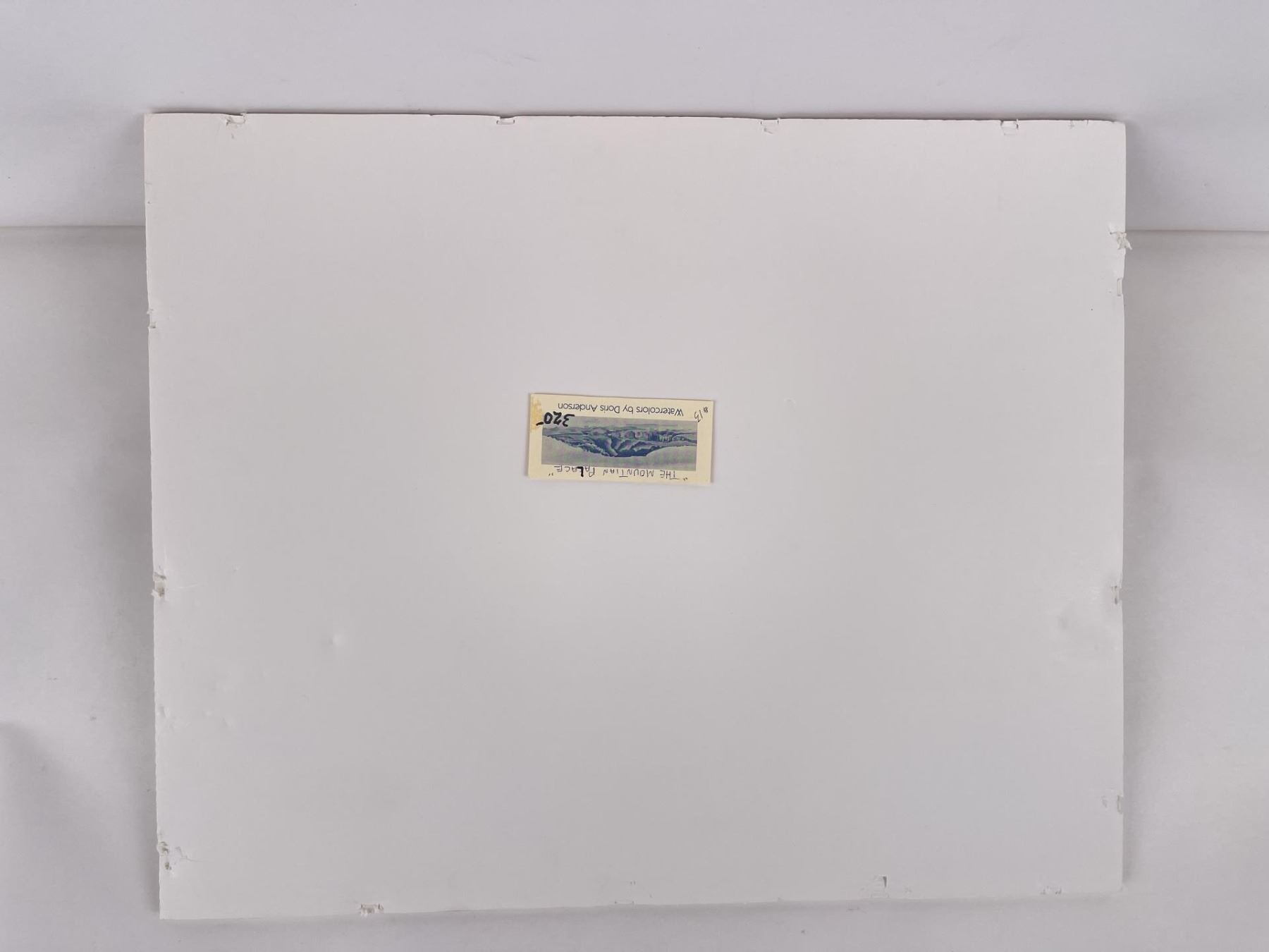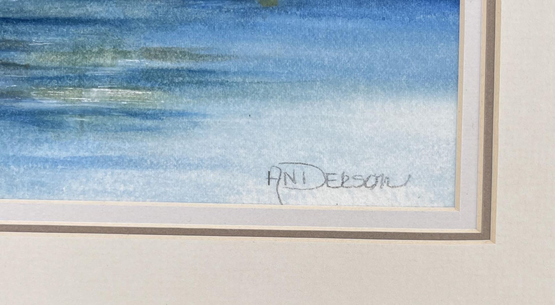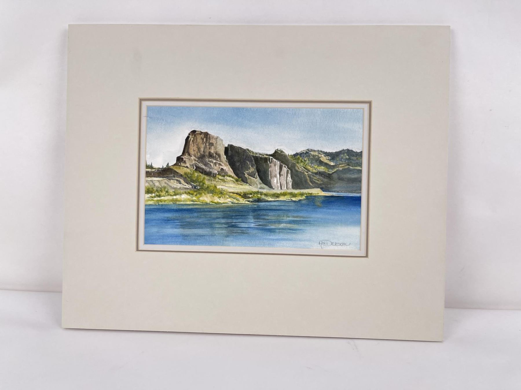 18 7/8" by 15 1/4" in matte. Doris Anderson (Born 1934) is active/lives in Montana, Idaho. Doris Anderson is known for Western landscape, marine, animal. The following is from the artist: Doris Anderson is a largely self-taught watercolourist. Born September 17, 1934 in Sandpoint, Idaho, she moved to Montana as a child. She has always been influenced by the land and even early artistic efforts were an attempt to share that love. She was married in 1955 to a wheat farmer and developed an even stronger feel for the land. During this time of raising four sons, art was in the background but never far away. She has grown through workshops with well known instructors such as Judi Betts, Rex Brandt, Zoltan Zsabo and Joe Bohler and also from fellowship with an excellent group of artists in the Great Falls area. She paints the area she knows and lives in. Her home is located on the banks of the Missouri River near Cascade, Montana. Subject material is largely landscapes but also fishermen, song birds, and a special love of white houses and red barns. The strong influence of the Lewis and Clark Expedition has made her favorite areas to paint, also of interest to historians and collectors alike. She has won numerous awards and has been an exhibitor at the C.M. Russell auction since 1984. She has been in the auction itself fourteen times and a quick draw artist four times. She has shown a number of times at the Classic-American Art show in Los Angeles. This show was held in the Beverly Hills Hilton for a number of years before moving to the Gene Autry Museum in Griffith Park.