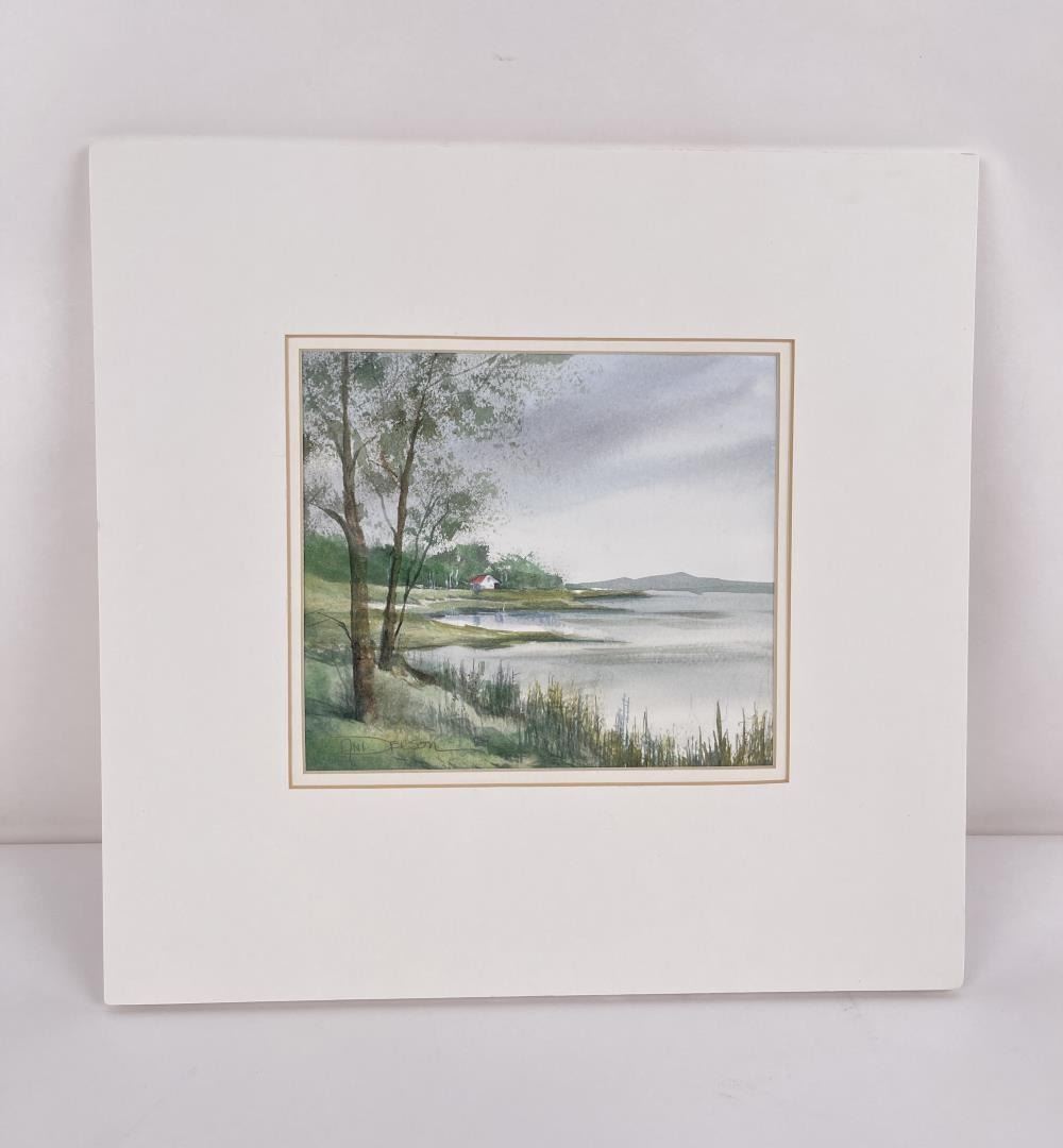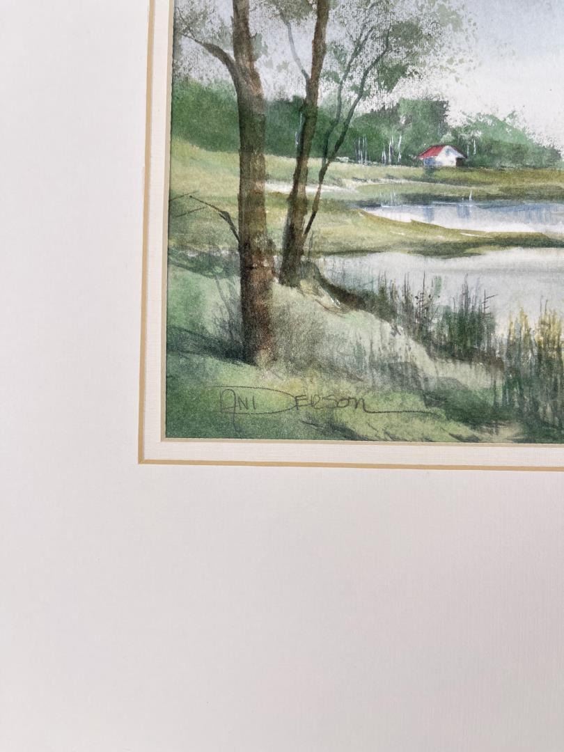 13 1/4" by 12 7/8" in matte. Doris Anderson (Born 1934) is active/lives in Montana, Idaho. Doris Anderson is known for Western landscape, marine, animal. The following is from the artist: Doris Anderson is a largely self-taught watercolourist. Born September 17, 1934 in Sandpoint, Idaho, she moved to Montana as a child. She has always been influenced by the land and even early artistic efforts were an attempt to share that love. She was married in 1955 to a wheat farmer and developed an even stronger feel for the land. During this time of raising four sons, art was in the background but never far away. She has grown through workshops with well known instructors such as Judi Betts, Rex Brandt, Zoltan Zsabo and Joe Bohler and also from fellowship with an excellent group of artists in the Great Falls area. She paints the area she knows and lives in. Her home is located on the banks of the Missouri River near Cascade, Montana. Subject material is largely landscapes but also fishermen, song birds, and a special love of white houses and red barns. The strong influence of the Lewis and Clark Expedition has made her favorite areas to paint, also of interest to historians and collectors alike. She has won numerous awards and has been an exhibitor at the C.M. Russell auction since 1984. She has been in the auction itself fourteen times and a quick draw artist four times. She has shown a number of times at the Classic-American Art show in Los Angeles. This show was held in the Beverly Hills Hilton for a number of years before moving to the Gene Autry Museum in Griffith Park.