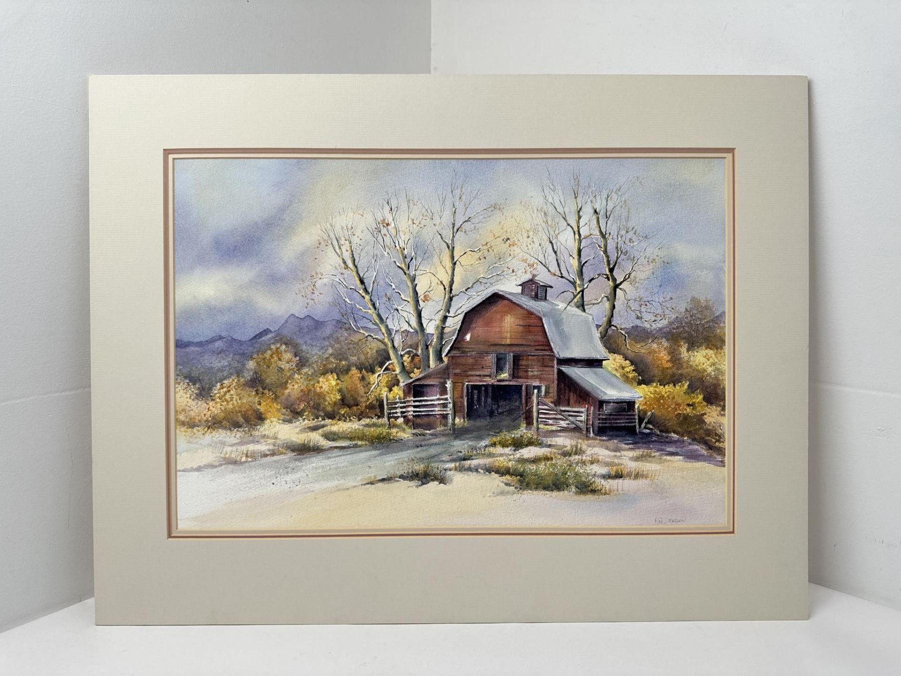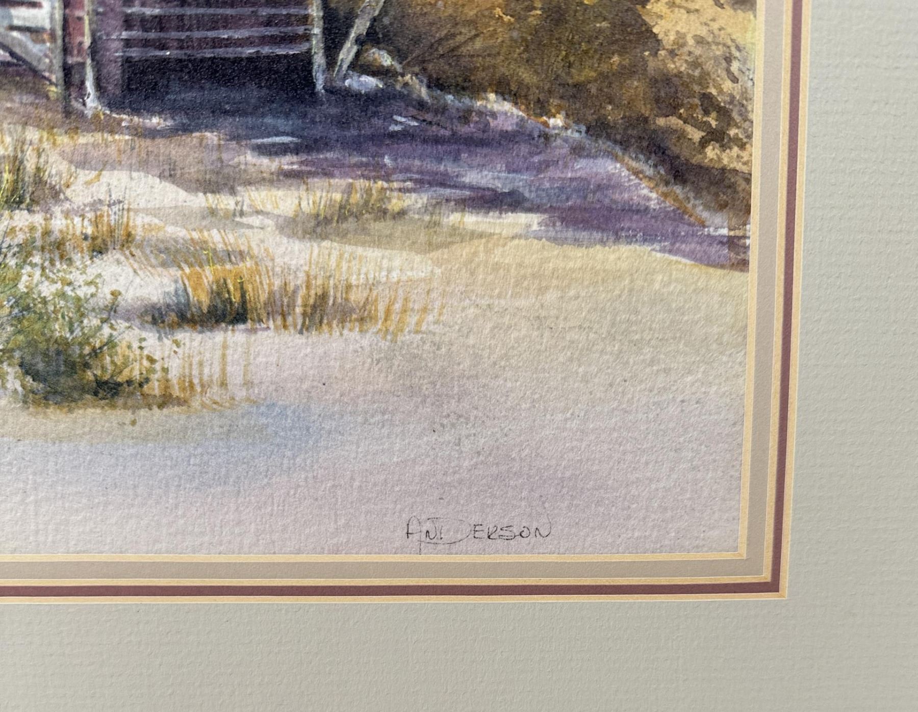 21 1/2" by 27 1/4" in matte. Doris Anderson (Born 1934) is active/lives in Montana, Idaho. Doris Anderson is known for Western landscape, marine, animal. The following is from the artist: Doris Anderson is a largely self-taught watercolourist. Born September 17, 1934 in Sandpoint, Idaho, she moved to Montana as a child. She has always been influenced by the land and even early artistic efforts were an attempt to share that love. She was married in 1955 to a wheat farmer and developed an even stronger feel for the land. During this time of raising four sons, art was in the background but never far away. She has grown through workshops with well known instructors such as Judi Betts, Rex Brandt, Zoltan Zsabo and Joe Bohler and also from fellowship with an excellent group of artists in the Great Falls area. She paints the area she knows and lives in. Her home is located on the banks of the Missouri River near Cascade, Montana. Subject material is largely landscapes but also fishermen, song birds, and a special love of white houses and red barns. The strong influence of the Lewis and Clark Expedition has made her favorite areas to paint, also of interest to historians and collectors alike. She has won numerous awards and has been an exhibitor at the C.M. Russell auction since 1984. She has been in the auction itself fourteen times and a quick draw artist four times. She has shown a number of times at the Classic-American Art show in Los Angeles. This show was held in the Beverly Hills Hilton for a number of years before moving to the Gene Autry Museum in Griffith Park.