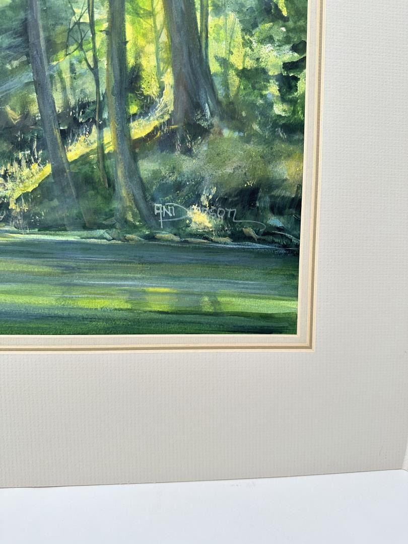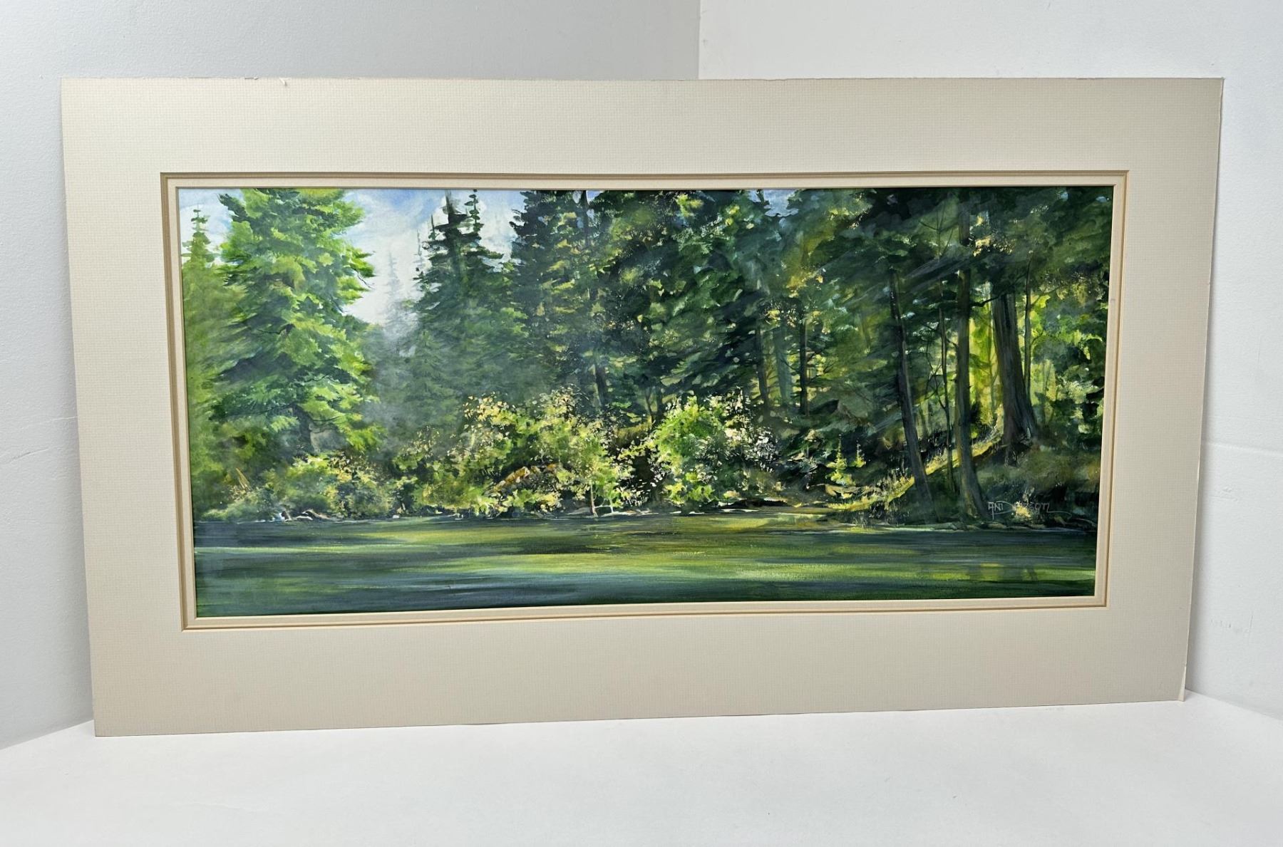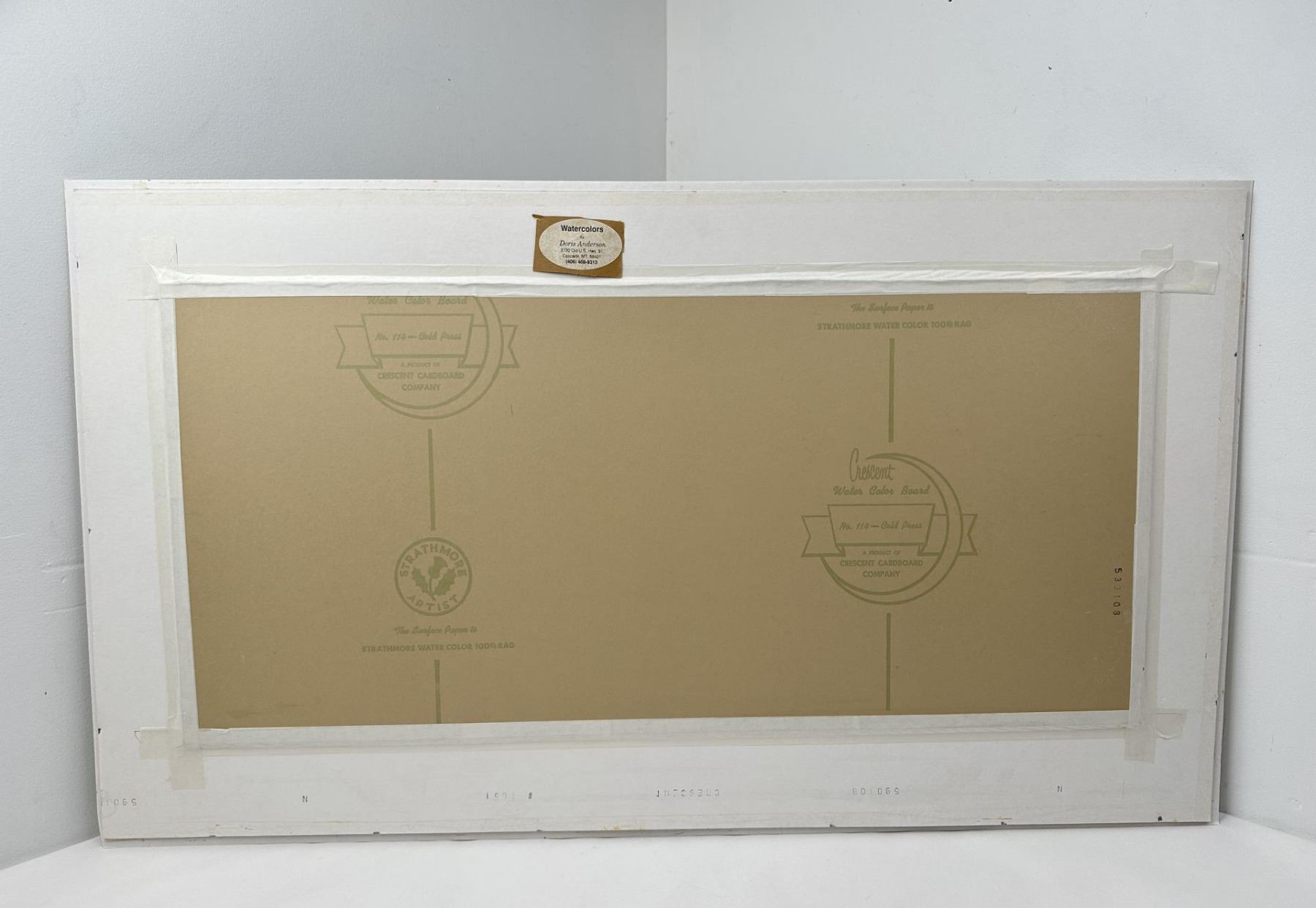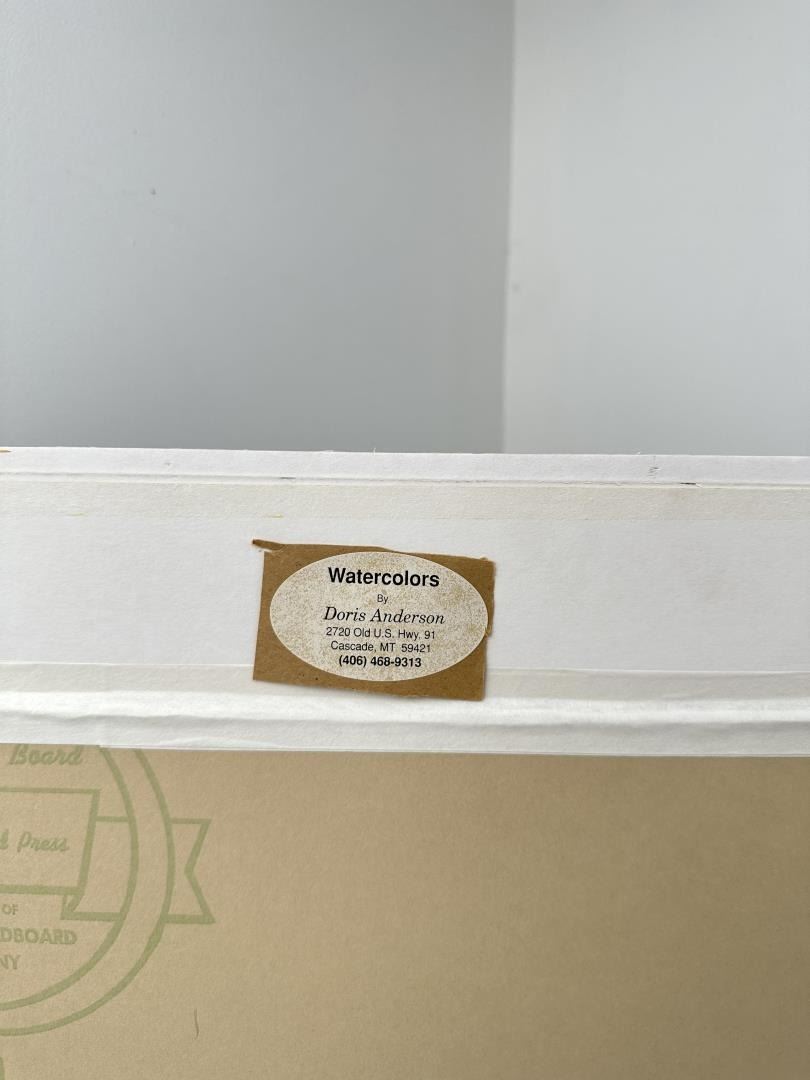 20 1/2" by 35 3/4" in matte. Doris Anderson (Born 1934) is active/lives in Montana, Idaho. Doris Anderson is known for Western landscape, marine, animal. The following is from the artist: Doris Anderson is a largely self-taught watercolourist. Born September 17, 1934 in Sandpoint, Idaho, she moved to Montana as a child. She has always been influenced by the land and even early artistic efforts were an attempt to share that love. She was married in 1955 to a wheat farmer and developed an even stronger feel for the land. During this time of raising four sons, art was in the background but never far away. She has grown through workshops with well known instructors such as Judi Betts, Rex Brandt, Zoltan Zsabo and Joe Bohler and also from fellowship with an excellent group of artists in the Great Falls area. She paints the area she knows and lives in. Her home is located on the banks of the Missouri River near Cascade, Montana. Subject material is largely landscapes but also fishermen, song birds, and a special love of white houses and red barns. The strong influence of the Lewis and Clark Expedition has made her favorite areas to paint, also of interest to historians and collectors alike. She has won numerous awards and has been an exhibitor at the C.M. Russell auction since 1984. She has been in the auction itself fourteen times and a quick draw artist four times. She has shown a number of times at the Classic-American Art show in Los Angeles. This show was held in the Beverly Hills Hilton for a number of years before moving to the Gene Autry Museum in Griffith Park.