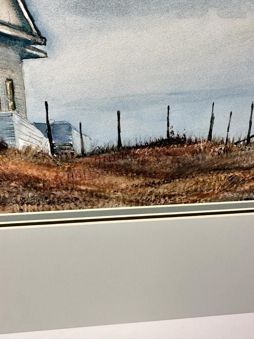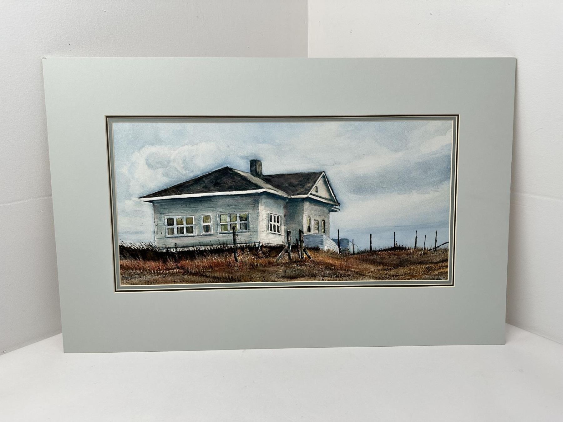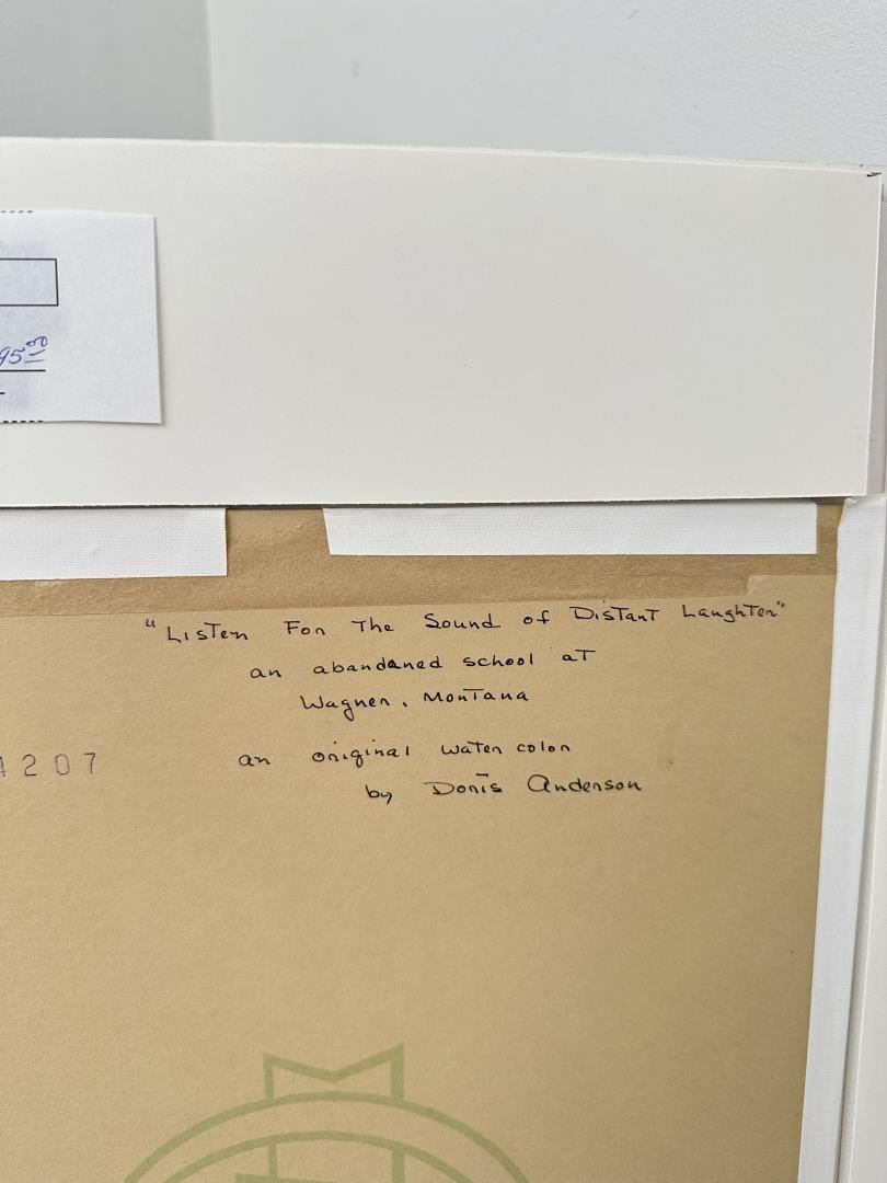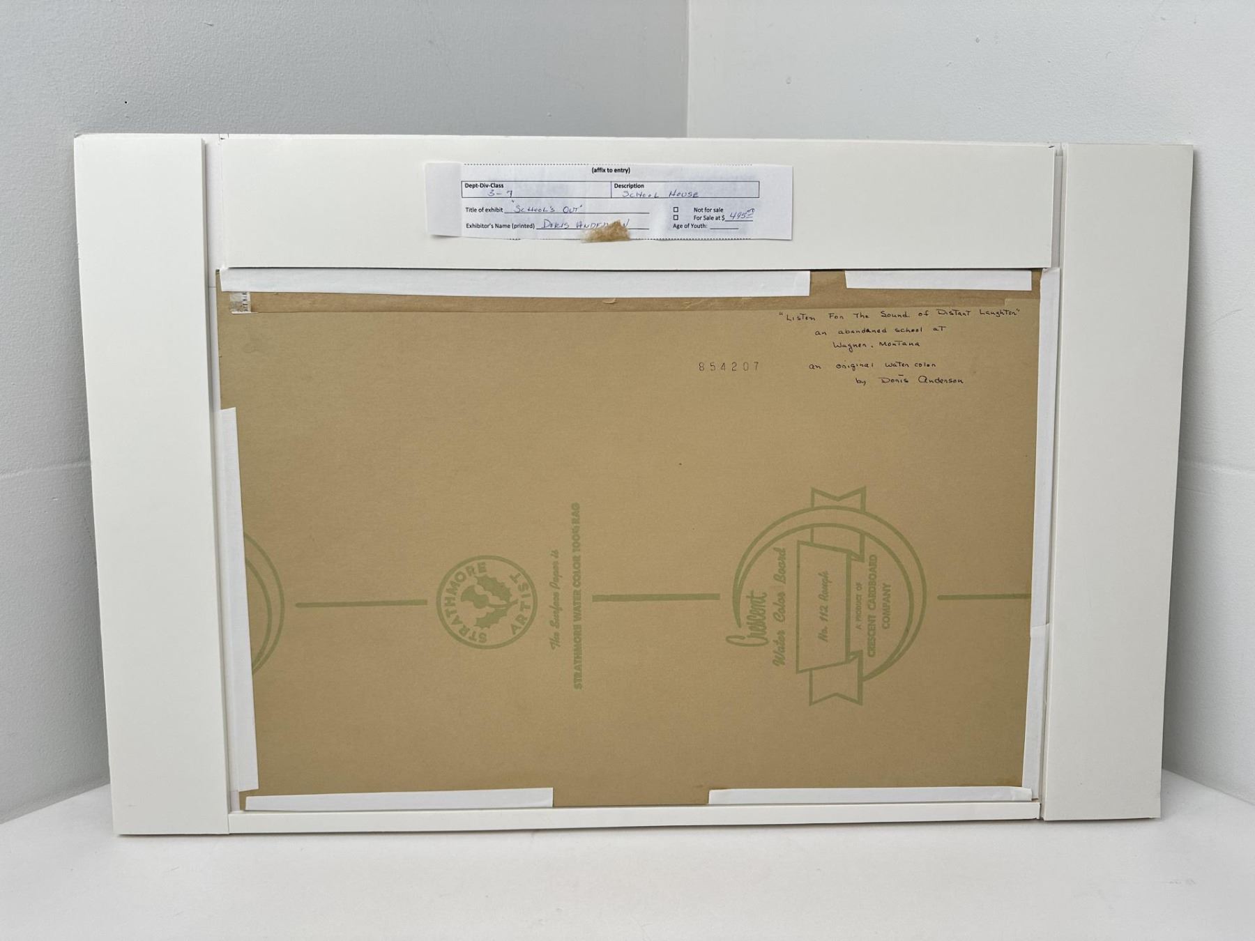 17" by 26 1/2" in matte. Doris Anderson (Born 1934) is active/lives in Montana, Idaho. Doris Anderson is known for Western landscape, marine, animal. The following is from the artist: Doris Anderson is a largely self-taught watercolourist. Born September 17, 1934 in Sandpoint, Idaho, she moved to Montana as a child. She has always been influenced by the land and even early artistic efforts were an attempt to share that love. She was married in 1955 to a wheat farmer and developed an even stronger feel for the land. During this time of raising four sons, art was in the background but never far away. She has grown through workshops with well known instructors such as Judi Betts, Rex Brandt, Zoltan Zsabo and Joe Bohler and also from fellowship with an excellent group of artists in the Great Falls area. She paints the area she knows and lives in. Her home is located on the banks of the Missouri River near Cascade, Montana. Subject material is largely landscapes but also fishermen, song birds, and a special love of white houses and red barns. The strong influence of the Lewis and Clark Expedition has made her favorite areas to paint, also of interest to historians and collectors alike. She has won numerous awards and has been an exhibitor at the C.M. Russell auction since 1984. She has been in the auction itself fourteen times and a quick draw artist four times. She has shown a number of times at the Classic-American Art show in Los Angeles. This show was held in the Beverly Hills Hilton for a number of years before moving to the Gene Autry Museum in Griffith Park.