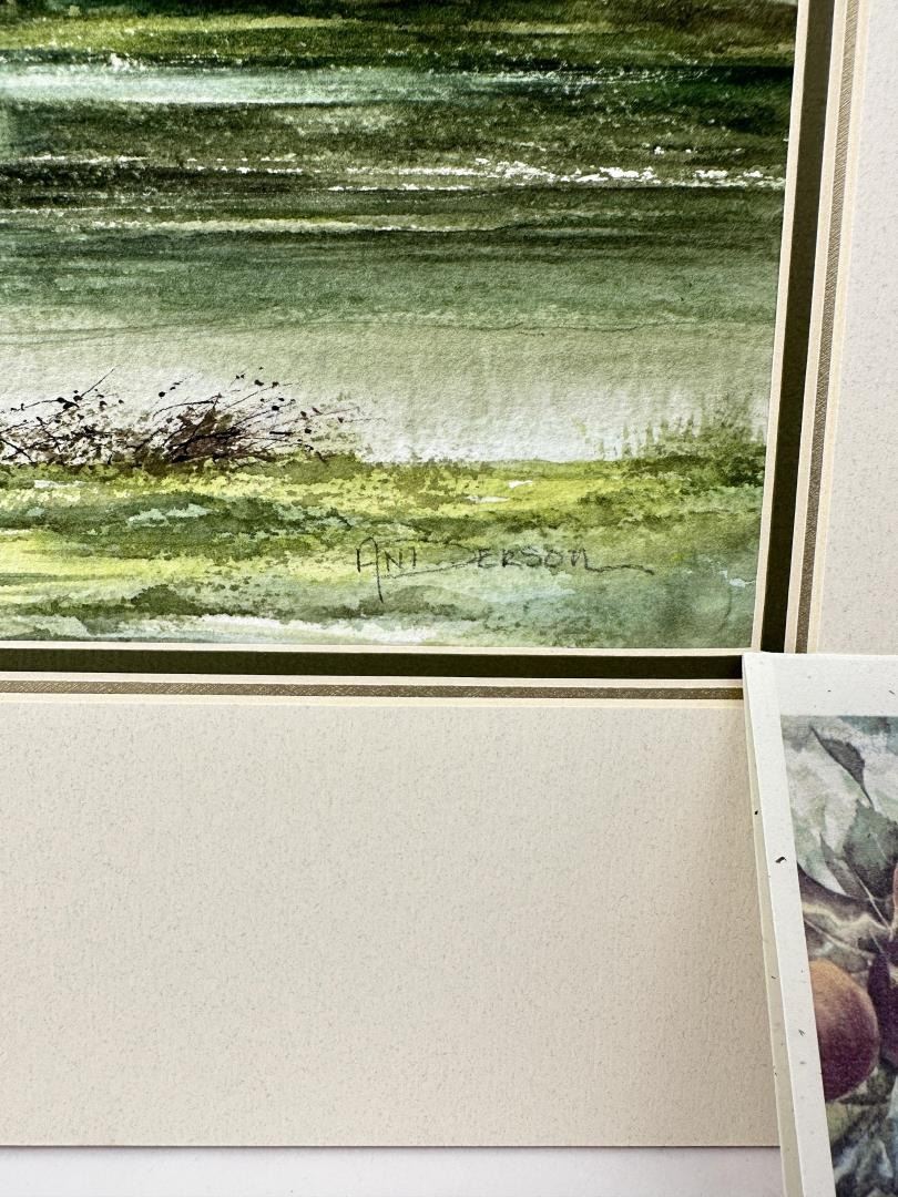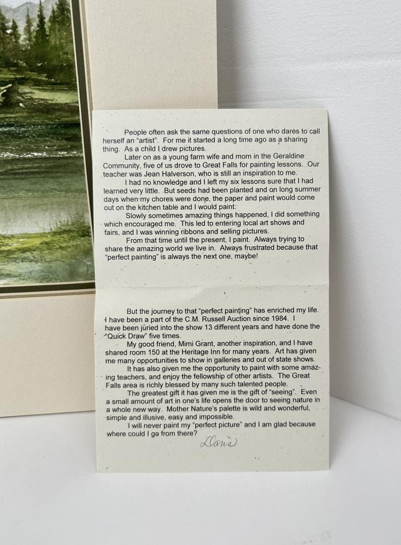 17 1/2" by 20 1/2" in matte. Doris Anderson (Born 1934) is active/lives in Montana, Idaho. Doris Anderson is known for Western landscape, marine, animal. The following is from the artist: Doris Anderson is a largely self-taught watercolourist. Born September 17, 1934 in Sandpoint, Idaho, she moved to Montana as a child. She has always been influenced by the land and even early artistic efforts were an attempt to share that love. She was married in 1955 to a wheat farmer and developed an even stronger feel for the land. During this time of raising four sons, art was in the background but never far away. She has grown through workshops with well known instructors such as Judi Betts, Rex Brandt, Zoltan Zsabo and Joe Bohler and also from fellowship with an excellent group of artists in the Great Falls area. She paints the area she knows and lives in. Her home is located on the banks of the Missouri River near Cascade, Montana. Subject material is largely landscapes but also fishermen, song birds, and a special love of white houses and red barns. The strong influence of the Lewis and Clark Expedition has made her favorite areas to paint, also of interest to historians and collectors alike. She has won numerous awards and has been an exhibitor at the C.M. Russell auction since 1984. She has been in the auction itself fourteen times and a quick draw artist four times. She has shown a number of times at the Classic-American Art show in Los Angeles. This show was held in the Beverly Hills Hilton for a number of years before moving to the Gene Autry Museum in Griffith Park.