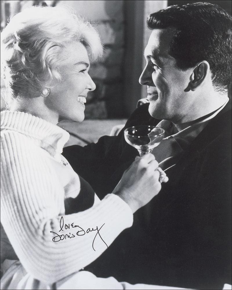 Two satin-finish 8 x 10 photos of Doris Day, one in a high-cut skirt and the other with Rock Hudson, each signed in black felt tip, “Doris Day” with the actress adding “love” to the pose with Hudson. In overall fine condition.