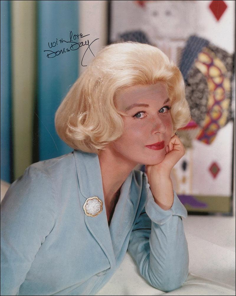 Two signed color photos, a glossy 10 x 8 and a satin-finish 8 x 10, each signed in black felt tip, “with love, Doris Day.” In fine condition.