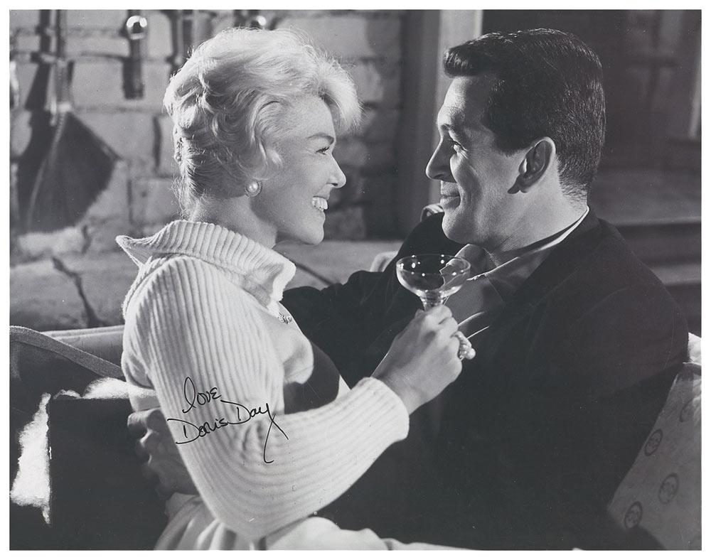 Glossy 14 x 11 photo of Day snuggling on the sofa with Rock Hudson, signed in black felt tip “Love, Doris Day.” In fine condition