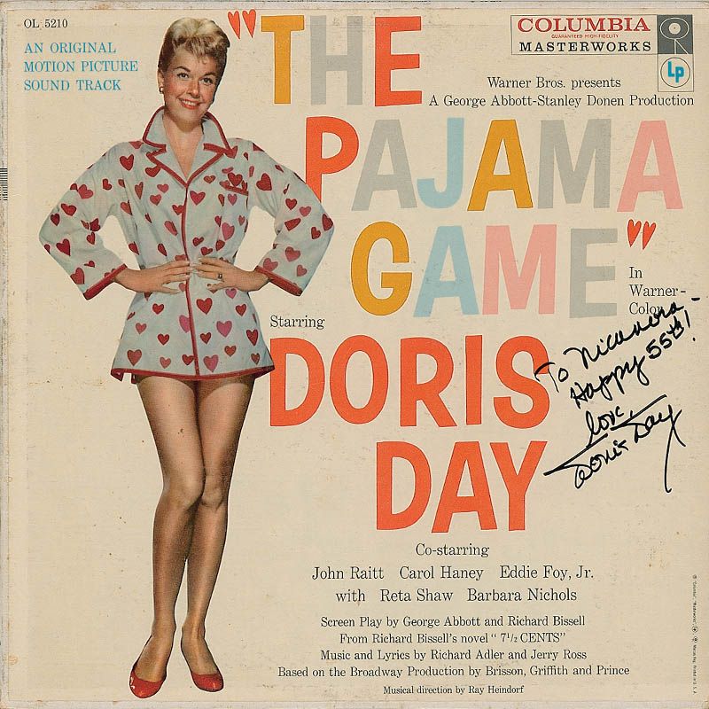 Day by Day and The Pajama Game albums, one signed on the front cover in black felt tip and the other signed and inscribed in black felt tip. In overall fine condition, with light rubbing wear and soiling to the covers. The records are included.