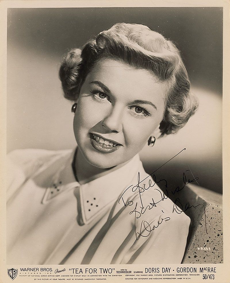Vintage glossy 8 x 10 Warner Bros. promotional photo for Tea for Two, signed and inscribed in fountain pen, “To Billy, Best wishes, Doris Day.” In fine condition, with some light contrast to portion of last name of signature.