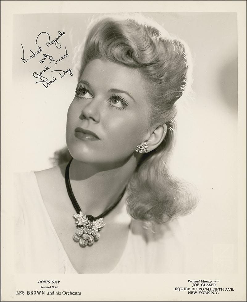 Vintage glossy 8.25 x 10 Les Brown and His Orchestra publicity photo of Day, signed in black fountain pen “Kindest Regards and good luck, Doris Day.” Scattered surface creases, and a light vertical crease passing through her face, otherwise fine condition. An extremely early and attractive pose! Pre-certified PSA/DNA and RRAuction COA.