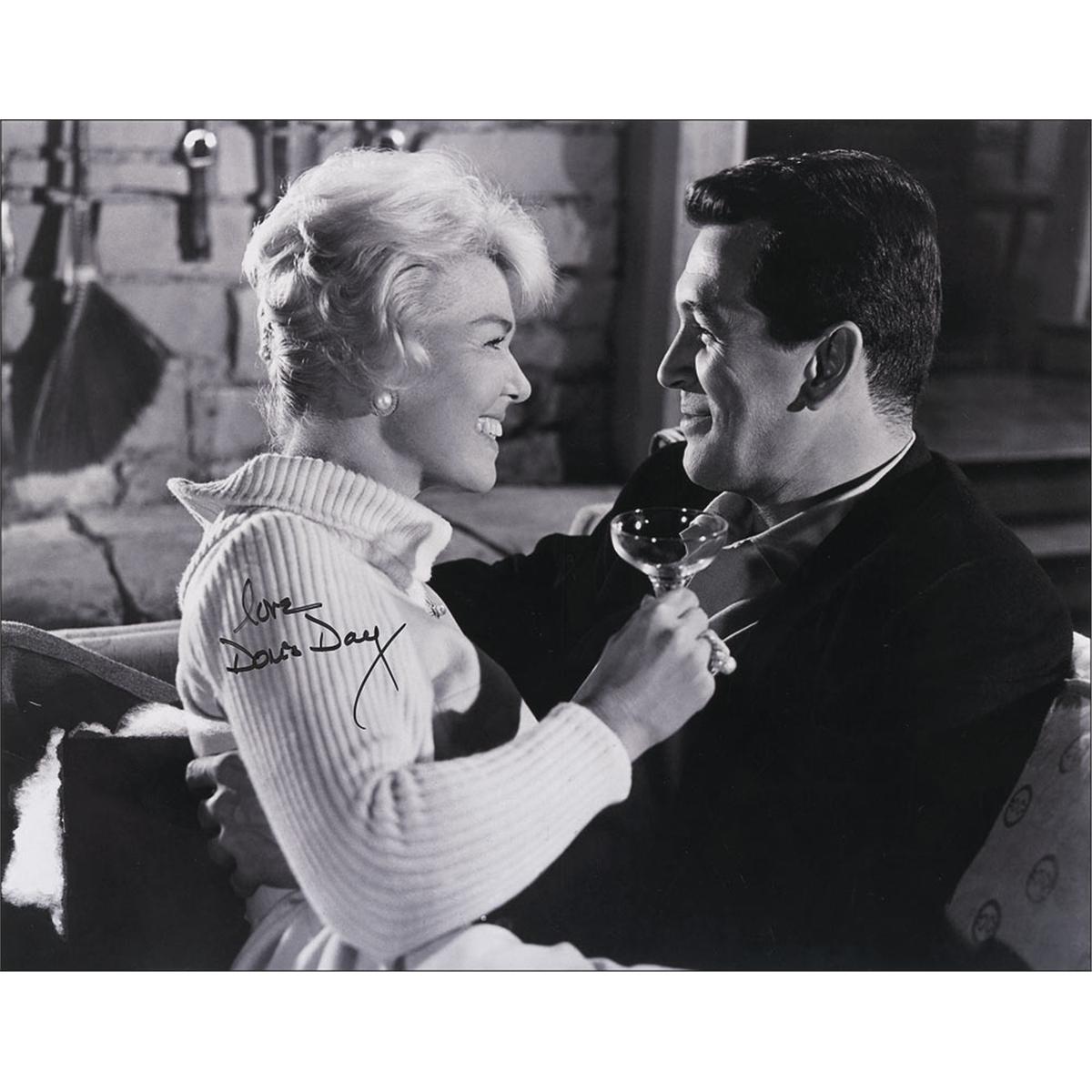 Glossy 14 x 11 photo of Day snuggling with Rock Hudson, signed in black felt tip, “Love, Doris Day.” In fine condition.