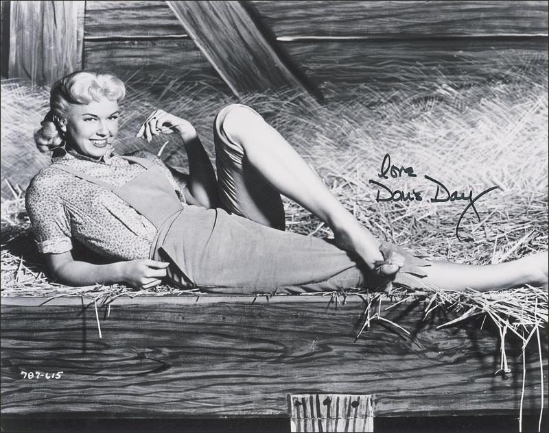 Seductive satin-finish 10 x 8 photo of Day reclining in a hayloft, signed in black felt tip “Love, Doris Day.” In fine condition.