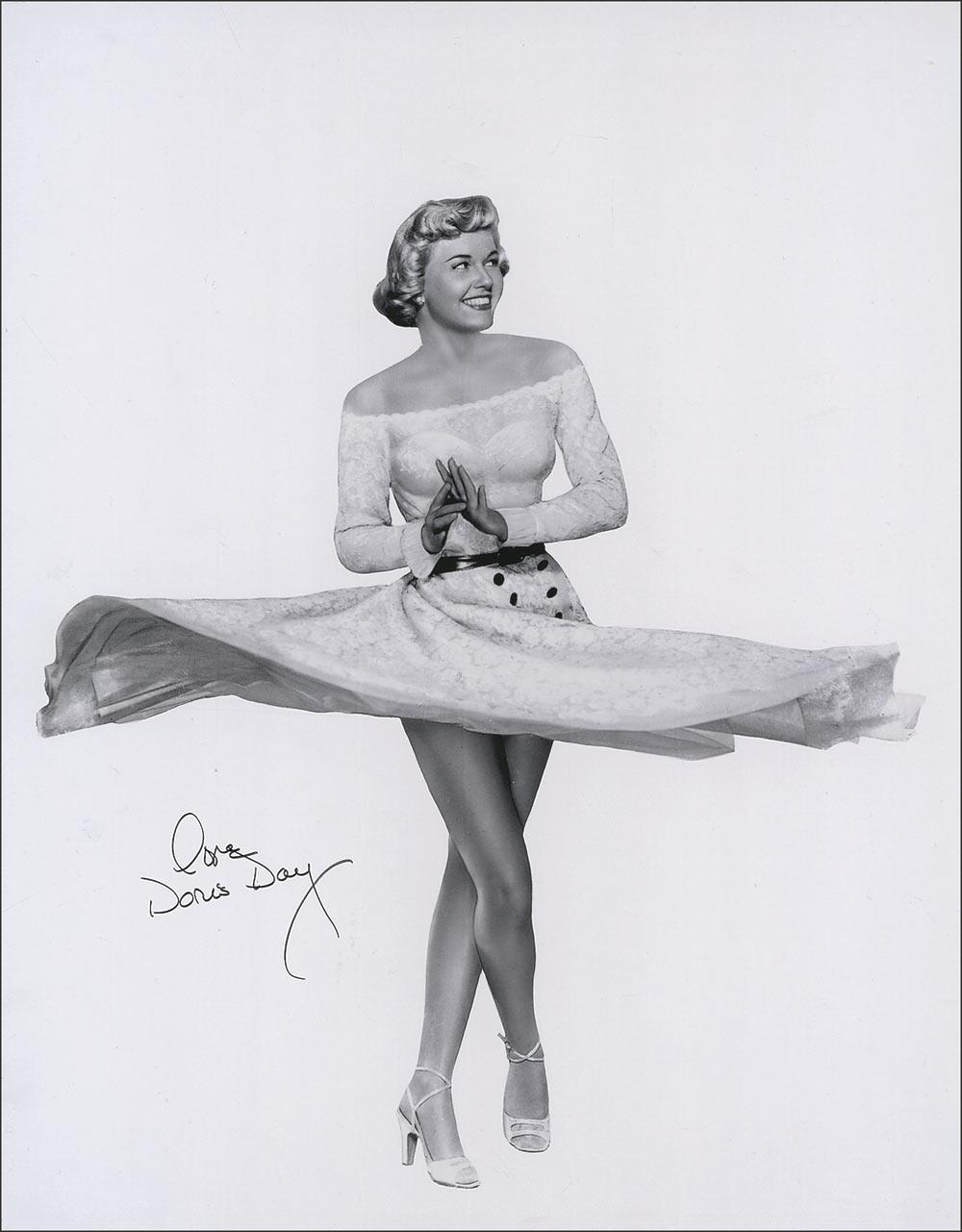 Glossy 11 x 14 photo of Day twirling her white dress and showing off a considerable amount of leg, signed in black felt tip, “Love, Doris Day.” In very fine condition.