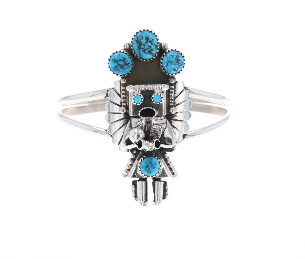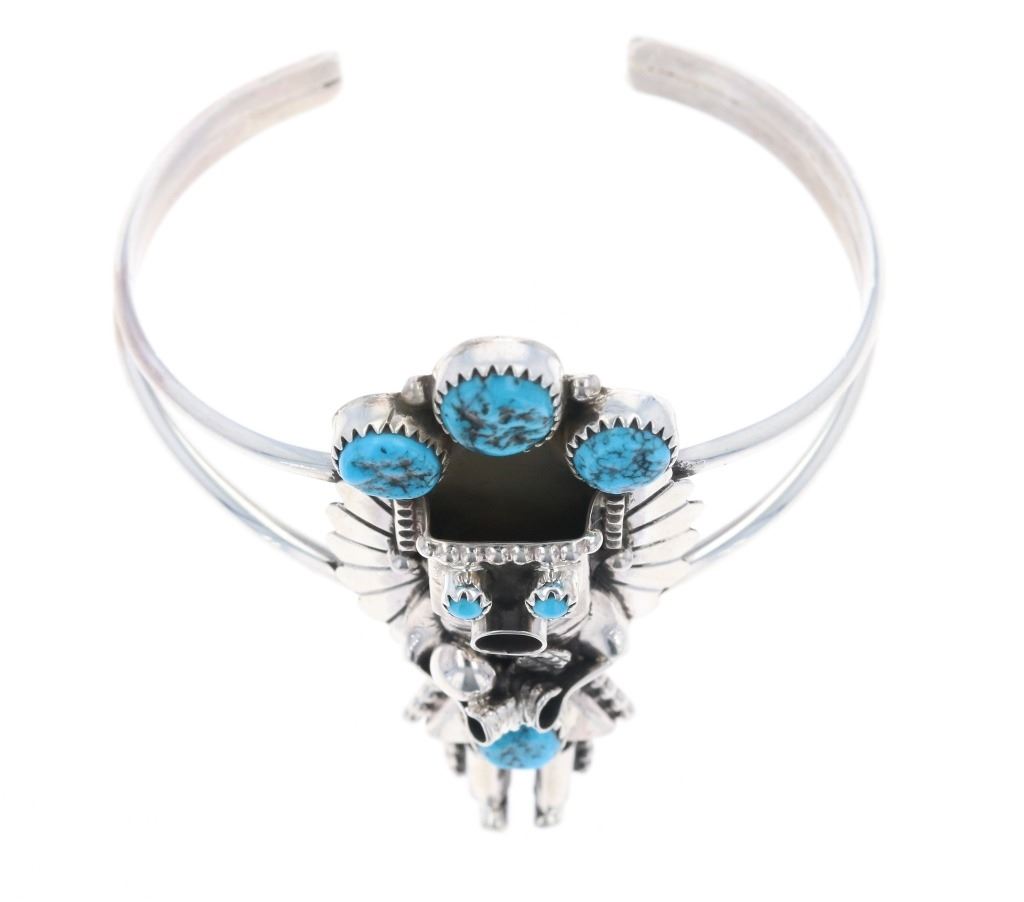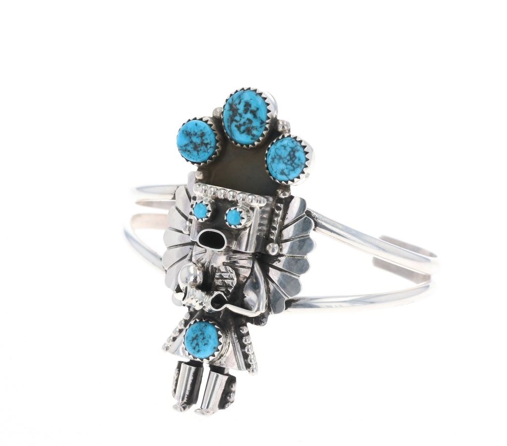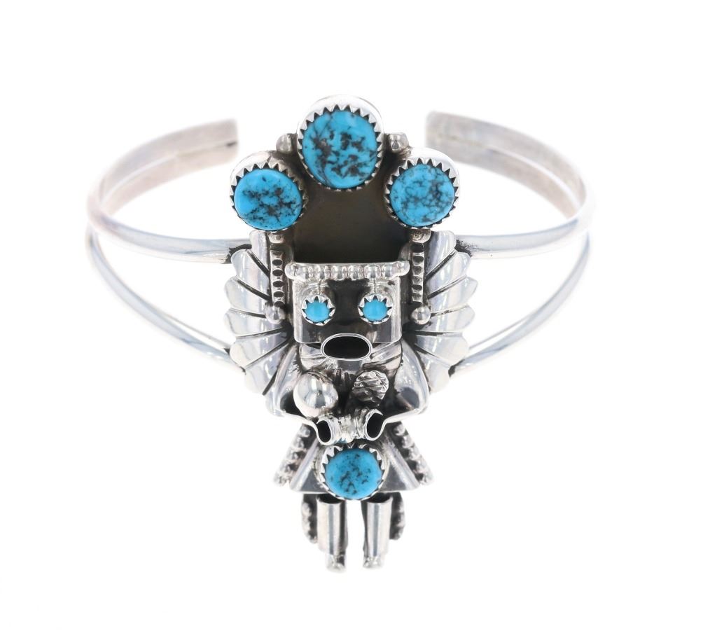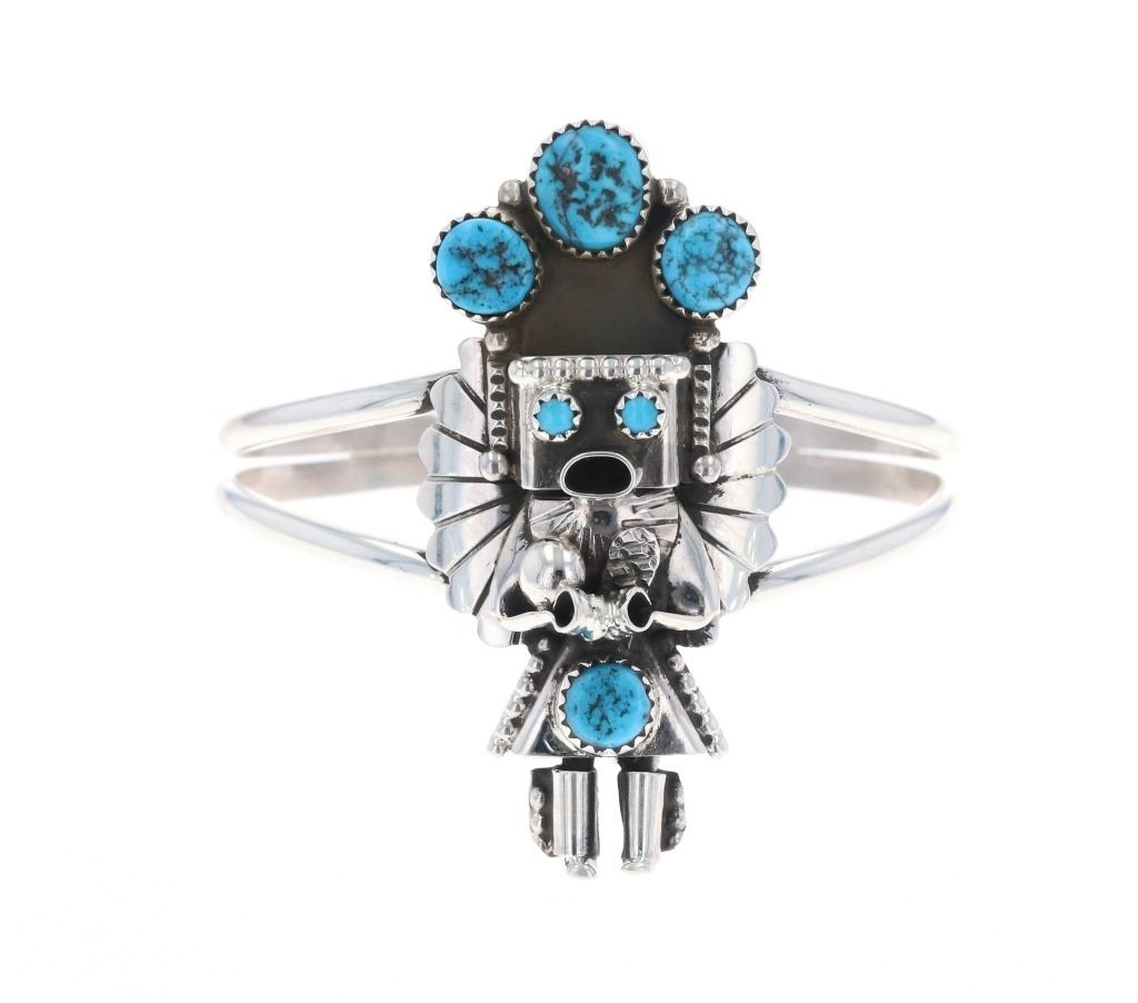 The lot features an original sterling silver “Morning Singer” Kachina Dancer bracelet set with Sleeping Beauty Turquoise and made by artist, Doris Smallcanyon. The piece is hand signed and stamped STERLING. This piece shows a double split band bracelet with large sterling silver Kachina / Katsina dancer set with a crown, eyes and on the skirt with polished cabochons of Sleeping Beauty Turquoise. This is a “Morning Singer” Kachina Dancer who is known to welcome the morning singing his song at Sun Rise, mouth opening changing to welcome the new day. Like new condition. Measures overall 2 7/8” by 2.25” by 2.25” and 6.5” inside circumference wrist size. Total weight of 26 grams.