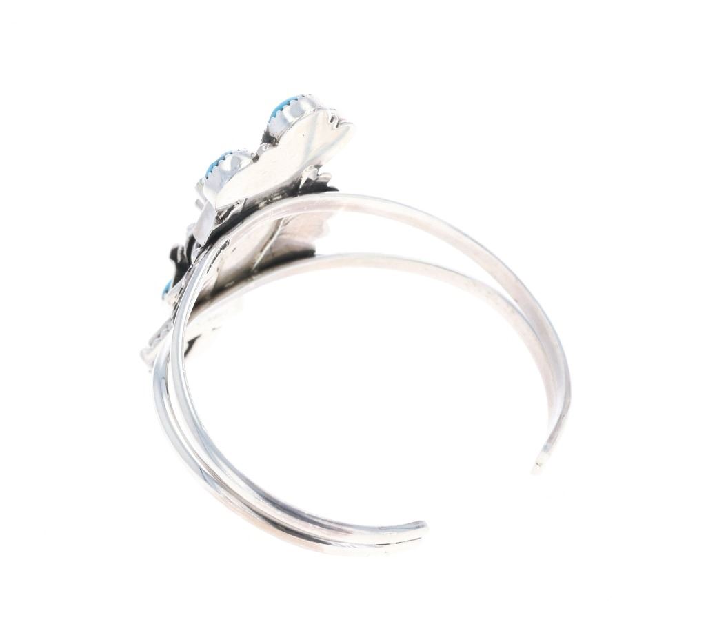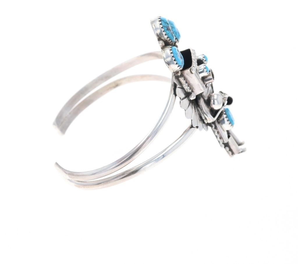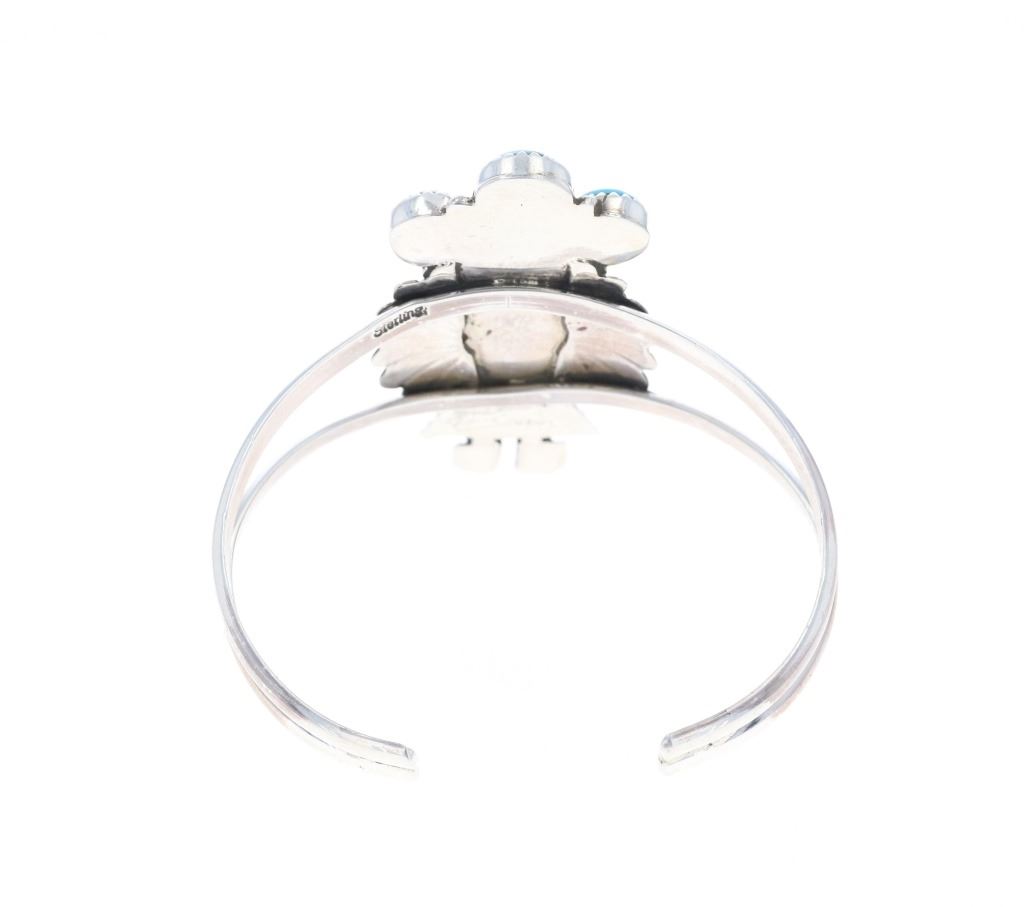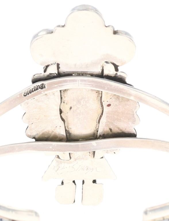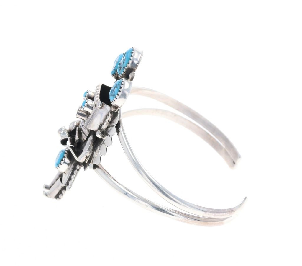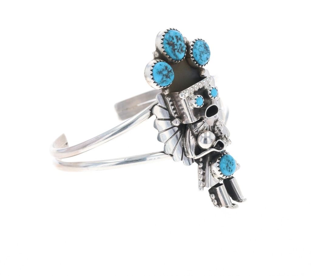 The lot features an original sterling silver “Morning Singer” Kachina Dancer bracelet set with Sleeping Beauty Turquoise and made by artist, Doris Smallcanyon. The piece is hand signed and stamped STERLING. This piece shows a double split band bracelet with large sterling silver Kachina / Katsina dancer set with a crown, eyes and on the skirt with polished cabochons of Sleeping Beauty Turquoise. This is a “Morning Singer” Kachina Dancer who is known to welcome the morning singing his song at Sun Rise, mouth opening changing to welcome the new day. Like new condition. Measures overall 2 7/8” by 2.25” by 2.25” and 6.5” inside circumference wrist size. Total weight of 26 grams.