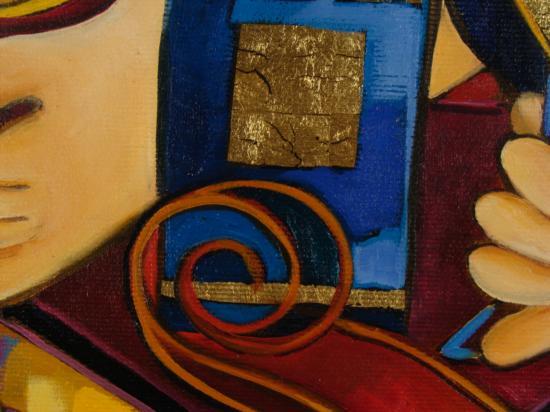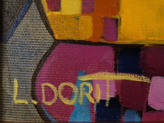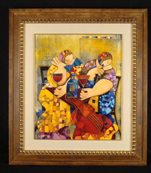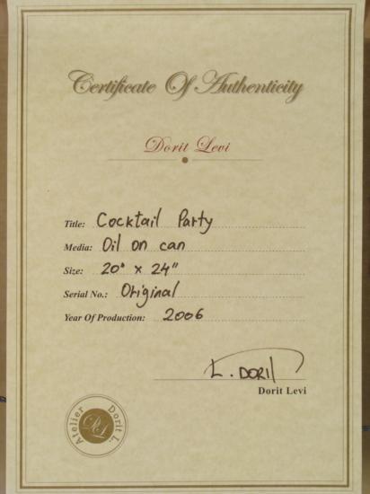 This original oil painting by artist Dorit Levi portrays an engaging cocktail party. The two women here are not only enjoying cocktails, but will perhaps have a little music too, as evidenced by the stringed instrument. Music and its elements are often seen in Dorit Levi's work, and so are Cubist forms, that portray a nice balance of composition and color in this piece. Artist: Dorit Levi Title: "Cocktail Party" Medium: Original oil on canvas, with gold leaf Signed: In paint, lower right; also in black marker on verso Year produced: 2006 Image size: 20" x 24" Frame size: 30" x 34" Framing: Custom framed, with natural fabric matting, and gold painted decorative wood frame with inner border Certificate of Authenticity: Atelier Dorit L. Condition: Excellent This is a lively and Dorit Levi original. Bring the cocktail party atmosphere to any room with this enjoyable painting. BiographyDorit Levi (1952- ) was born in Tel Aviv, Israel, a city which became the inspiration for her art. She studied at the prestigious Wizco France art School, where she was a student of Edwin Salomon, Israel's greatest artist. Other artists that influenced her style include Picasso, Leger, and Braque. Their Cubist forms are seen in her work. Also seen is her own distinct style, brimming with warm colors, movement, and a lyricism that conveys a certain joy. Dorit Levi has been a Lecturer at Tel Aviv University, and an Israeli Consul For Cultural Affairs in the USA. Her works can be found in galleries and private collections throughout the world.