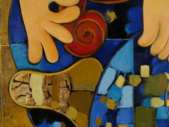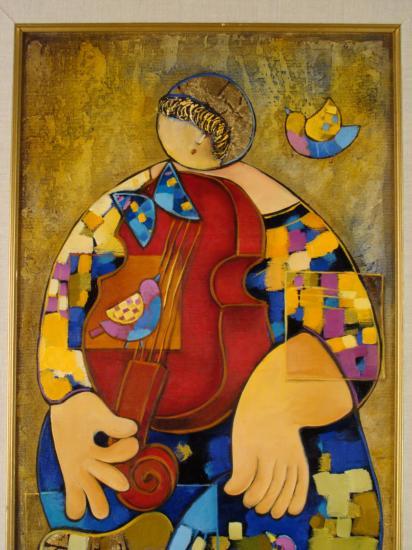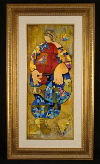 This is an original oil painting of an Irish Dancer by artist Dorit Levi. The step dancing is accented by a fiddle, and a couple of birds who have decided to join in. Music and its elements are often seen in Dorit Levi's work, and her Cubist style conveys the spontaneous flair of the Irish dance beautifully. Artist: Dorit Levi Title: "Irish Dance" Medium: Original oil on canvas, with gold leaf Signed: In paint, lower left; also in black marker on verso Image size: 16 x 34 inches Frame size: 22 x 40 inches Framing: Custom framed, with natural fabric matting, and gold painted decorative wood frame with inner border Certificate of Authenticity: included Condition: Excellent Its always a lively scene with Irish dance, and enjoy who enjoys it will surely love this colorful original painting. BiographyDorit Levi (1952- ) was born in Tel Aviv, Israel, a city which became the inspiration for her art. She studied at the prestigious Wizco France art School, where she was a student of Edwin Salomon, Israel's greatest artist. Other artists that influenced her style include Picasso, Leger, and Braque. Their Cubist forms are seen in her work. Also seen is her own distinct style, brimming with warm colors, movement, and a lyricism that conveys a certain joy. Dorit Levi has been a Lecturer at Tel Aviv University, and an Israeli Consul For Cultural Affairs in the USA. Her works can be found in galleries and private collections throughout the world.
