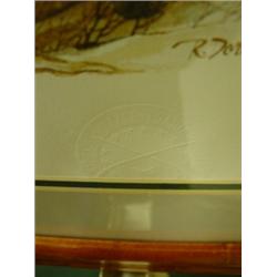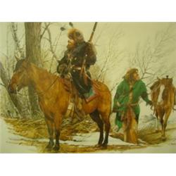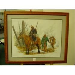 National Muzzle Loading Rifle print. R. Dorman. "Return to High Country". No date, no papers. Society Seal in paper. Image 18" x 24". Overall 24" x 30". Professionally framed. Condition: Excellent